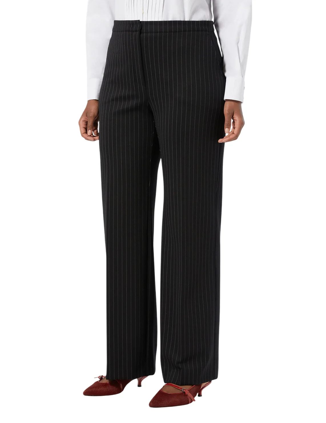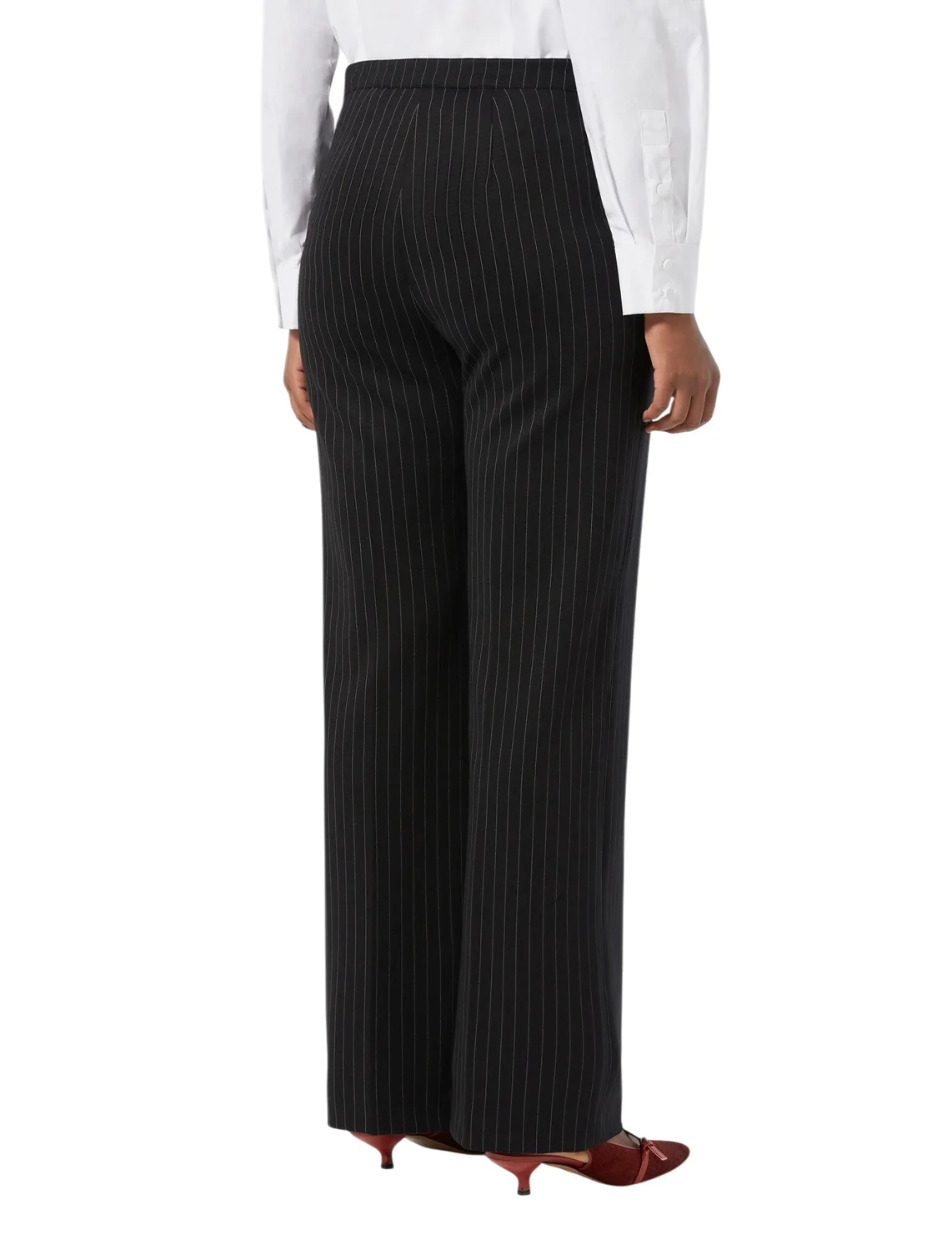 Брюки изготовлены из полиамида, шерсти и эластана. Модель выполнена в свободном крое. Имеет скрытую застежку-молнию с крючком, принт в полоску и прорезные карманы.