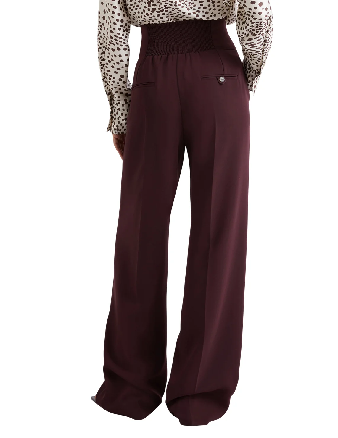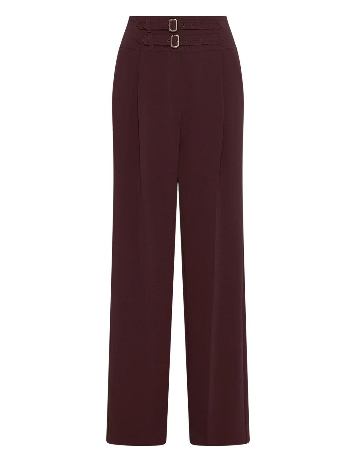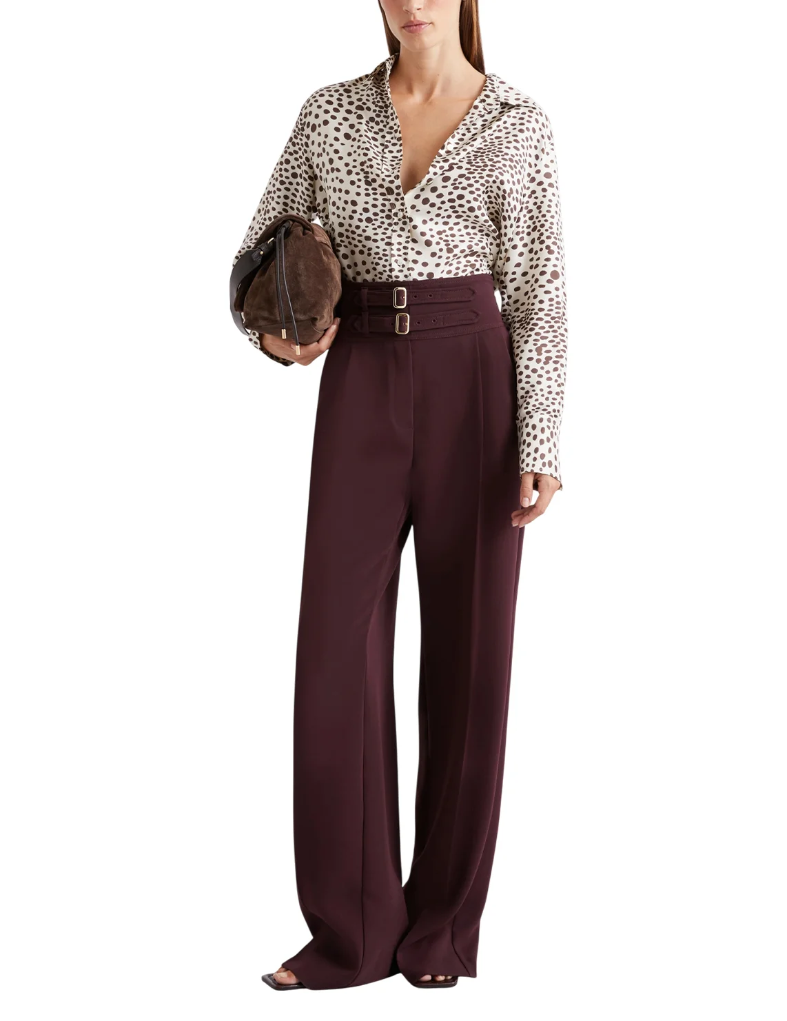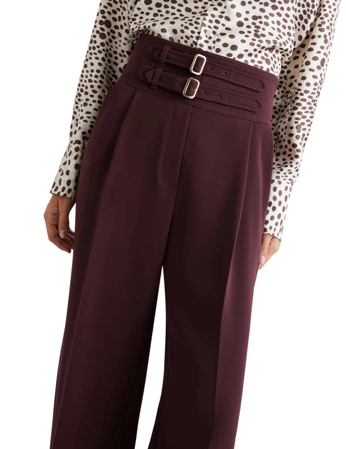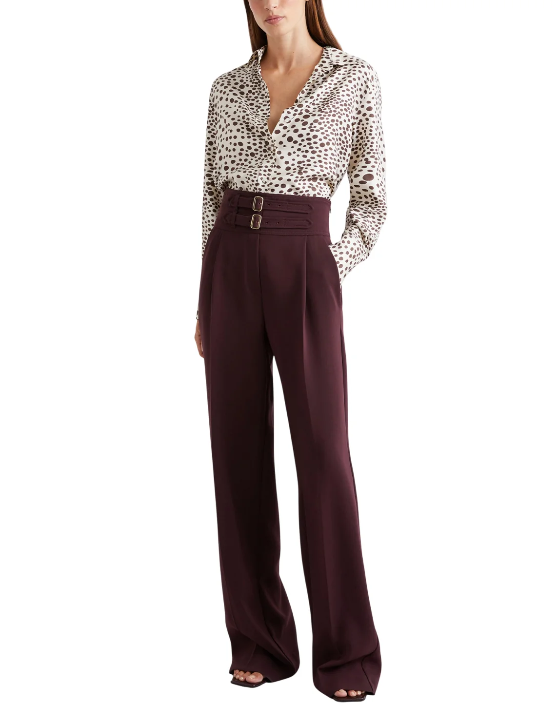 Брюки изготовлены из триацетата и полиэстера. Модель выполнена в свободном крое. Имеет двойные пряжки на поясе, скрытую застежку-молнию сбоку, эластичный пояс сзади, прессованные стрелки, а также прорезные карманы по бокам и сзади.