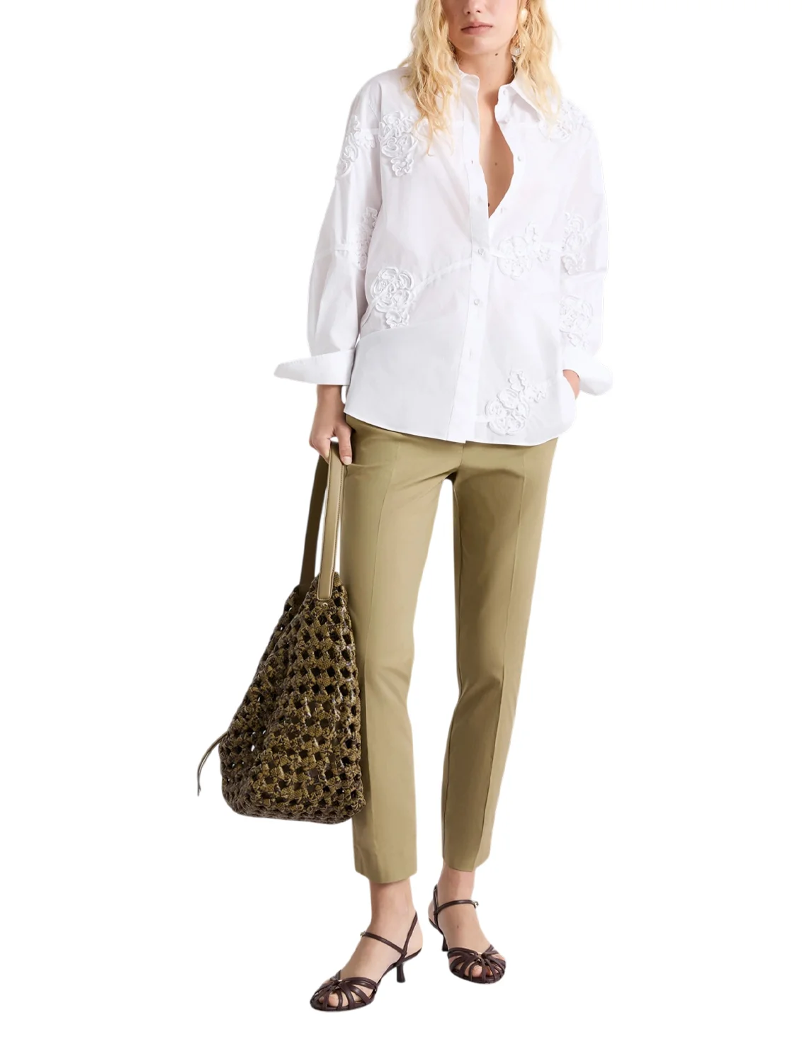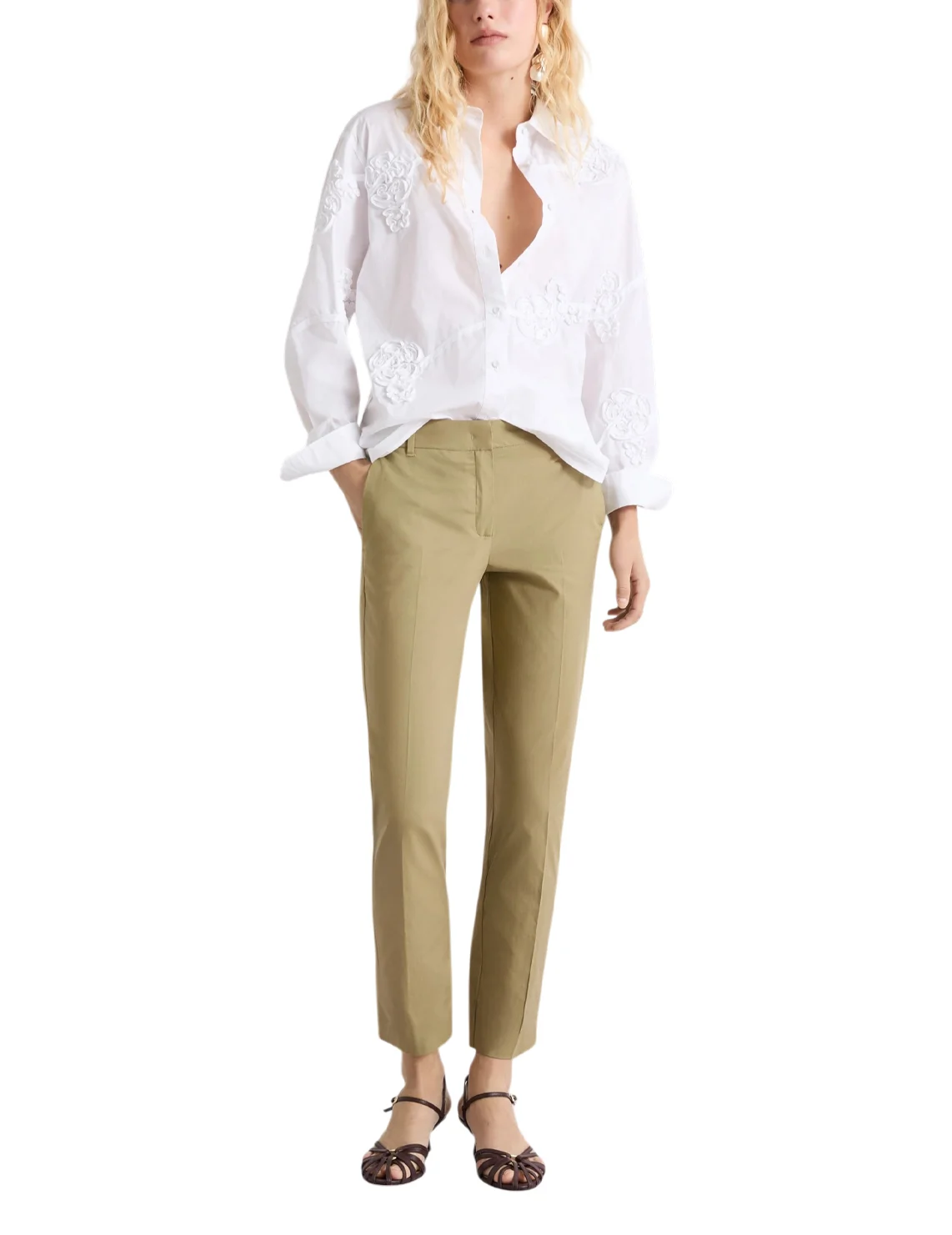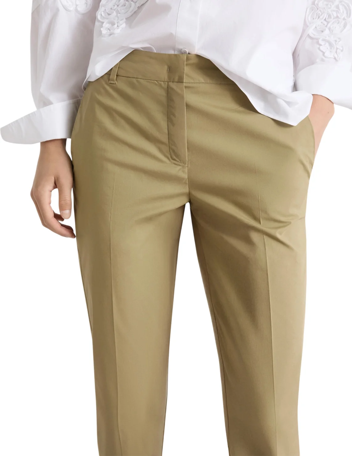 Брюки изготовлены из хлопка и эластана. Модель выполнена в прямом крое. Имеет застежку на крючок и скрытую молнию, шлевки для ремня, прессованные стрелки, наклонные боковые и задние прорезные карманы.