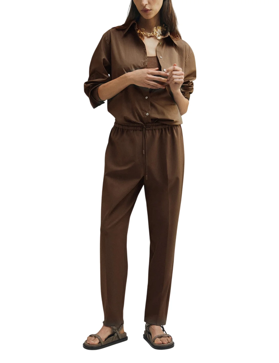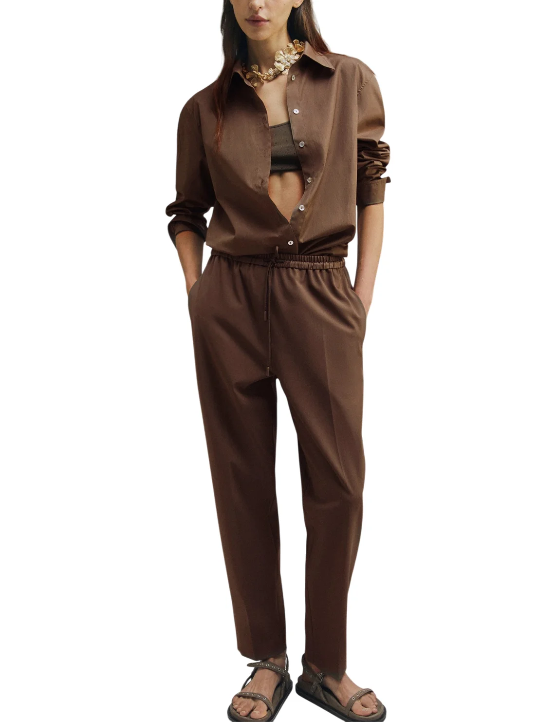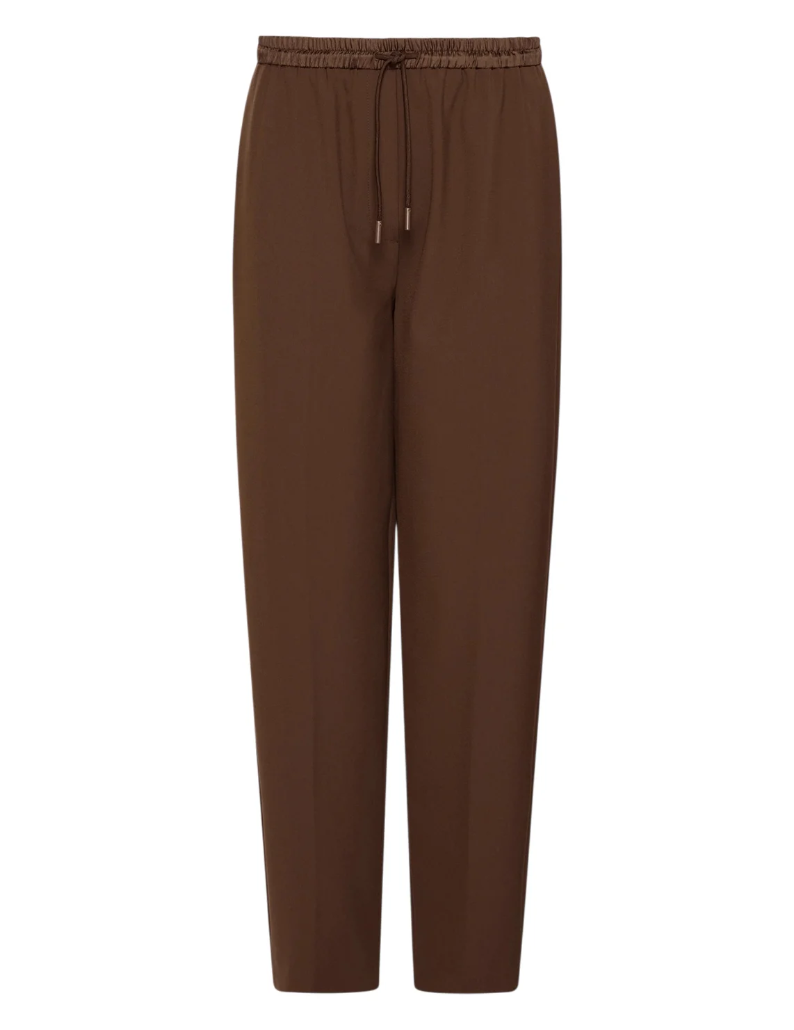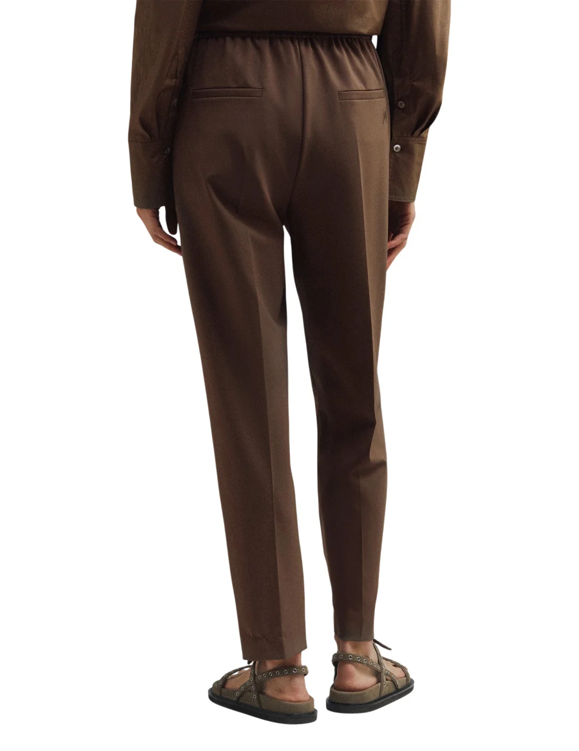 Брюки изготовлены из полиэстера, вискозы и эластана. Модель выполнена в узком крое. Имеет шнурок на талии, прессованные стрелки, а также несколько боковых и несколько задних прорезных карманов.