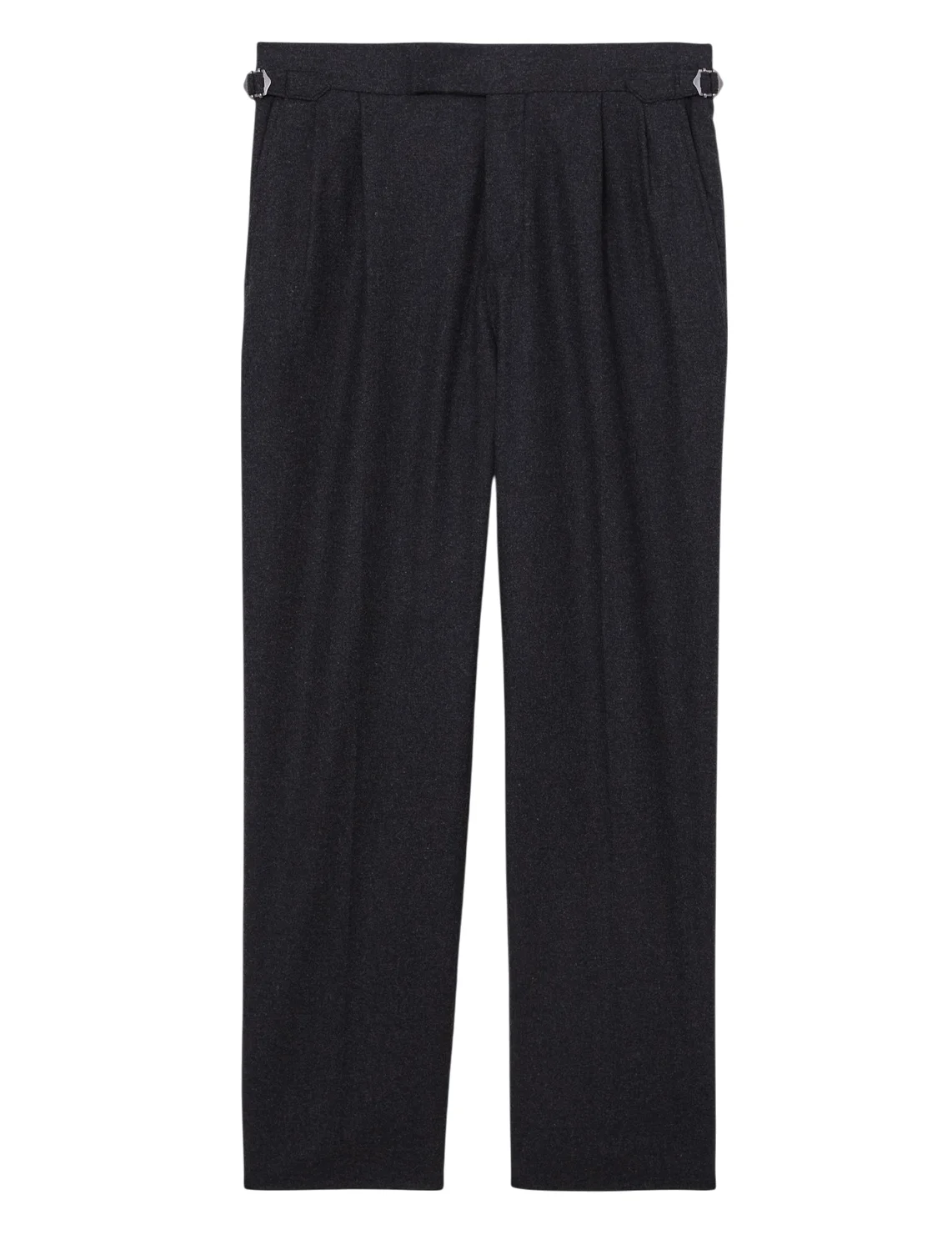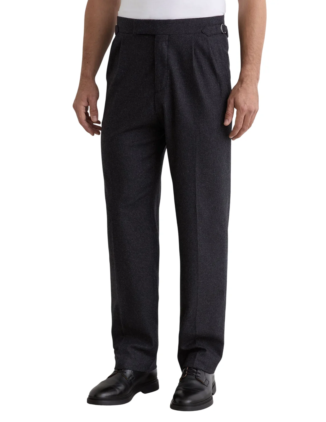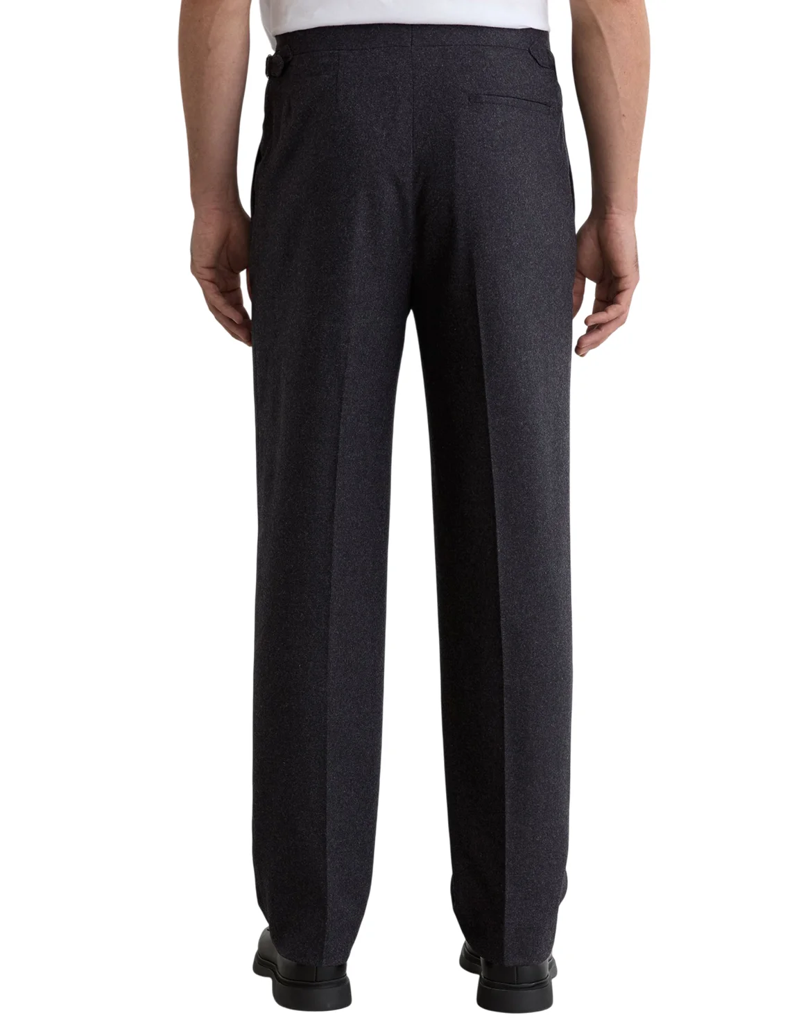 Брюки изготовлены из шерсти, полиэстера и эластана. Модель выполнена в свободном крое. Имеет потайную застежку-молнию с крючком, прессованные стрелки, складки, боковые пряжки для регулировки ширины, один прорезной карман сзади и два прорезных боковых кармана.