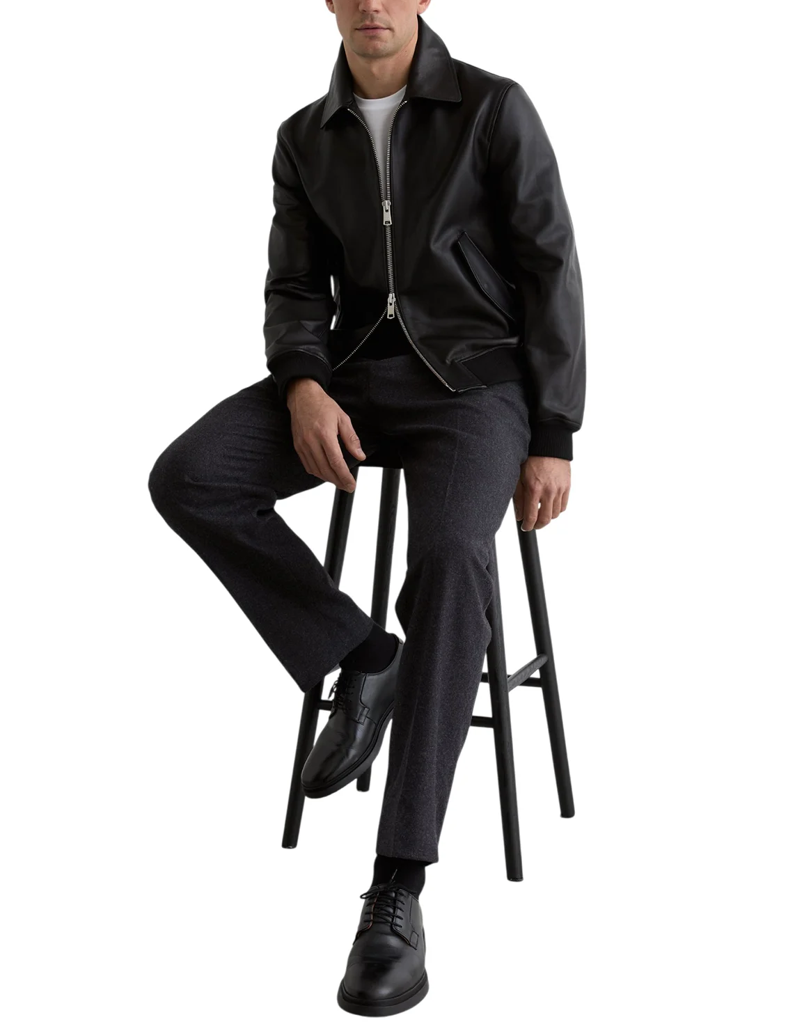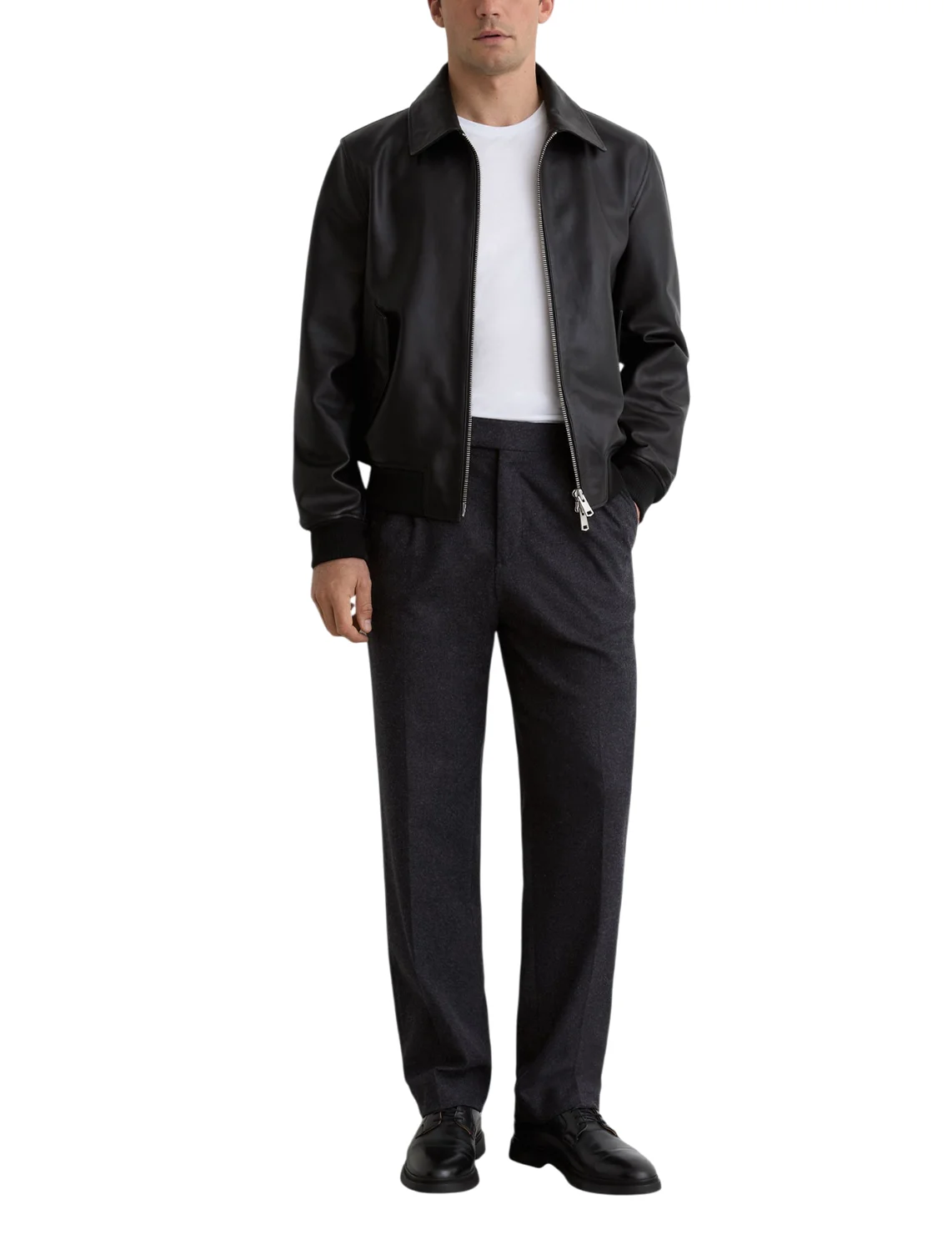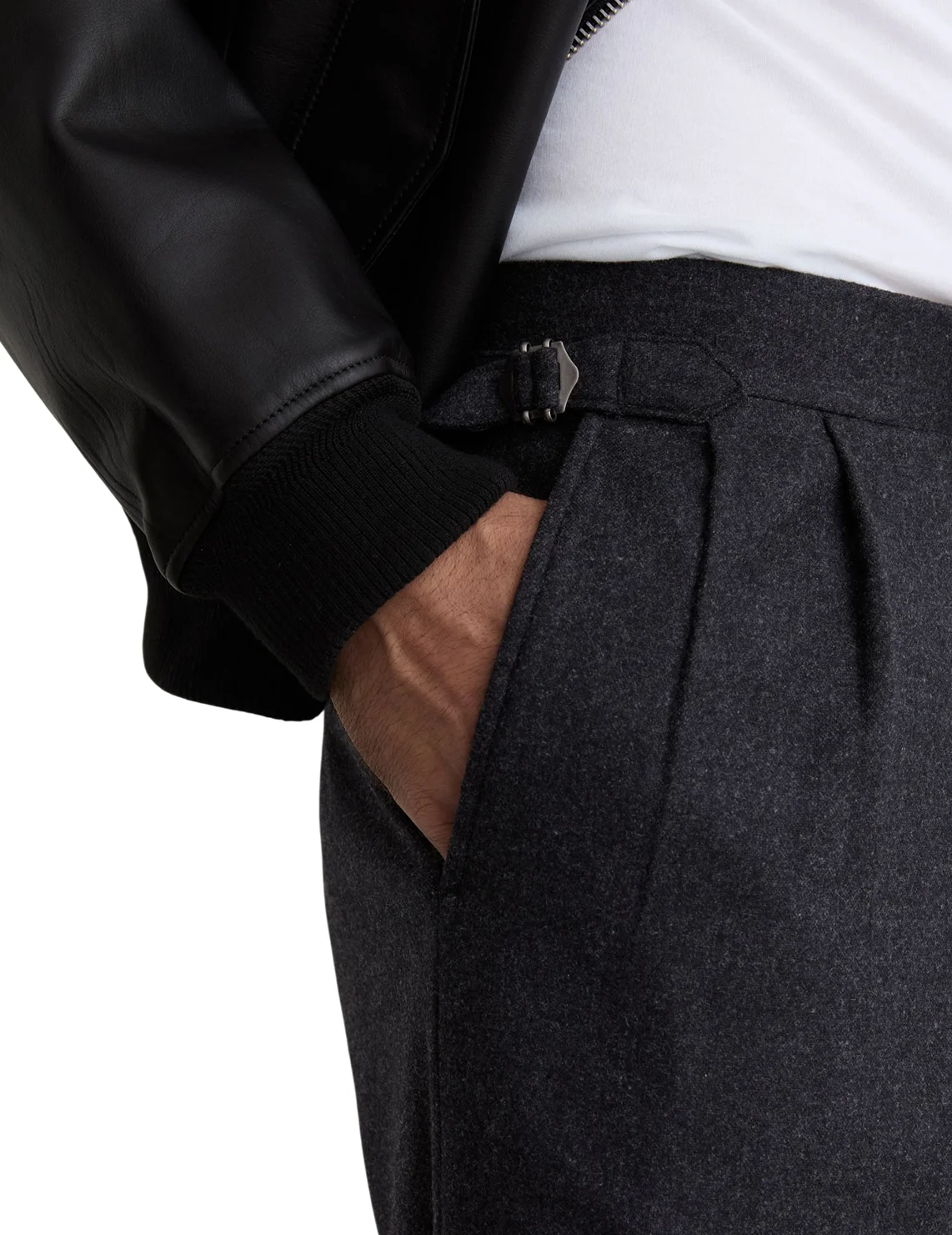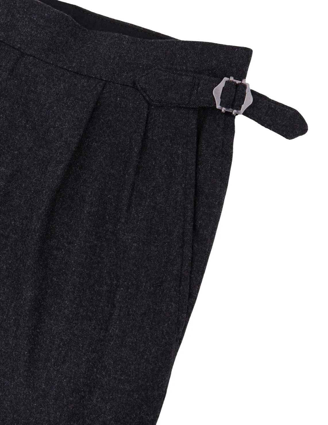 Брюки изготовлены из шерсти, полиэстера и эластана. Модель выполнена в свободном крое. Имеет потайную застежку-молнию с крючком, прессованные стрелки, складки, боковые пряжки для регулировки ширины, один прорезной карман сзади и два прорезных боковых кармана.