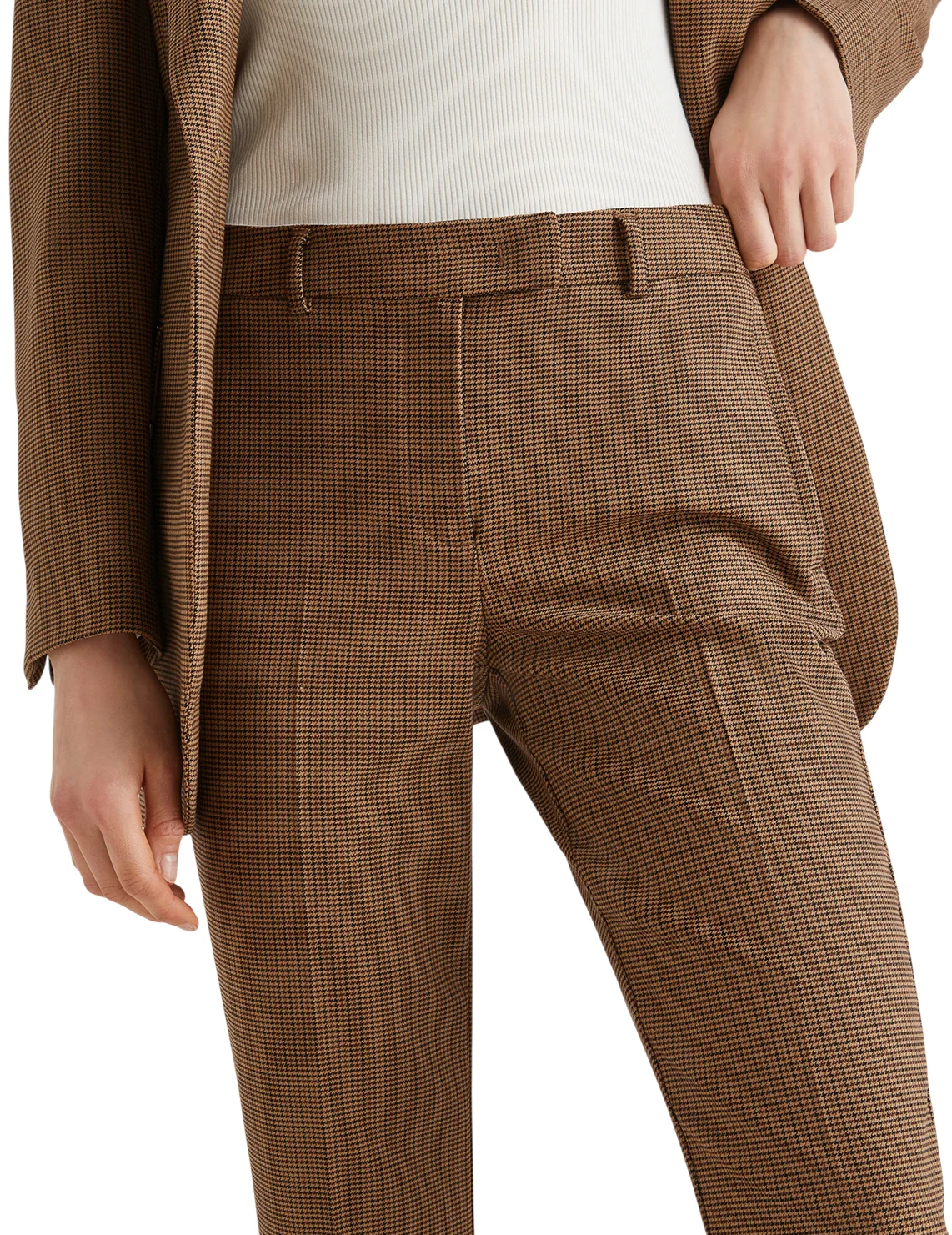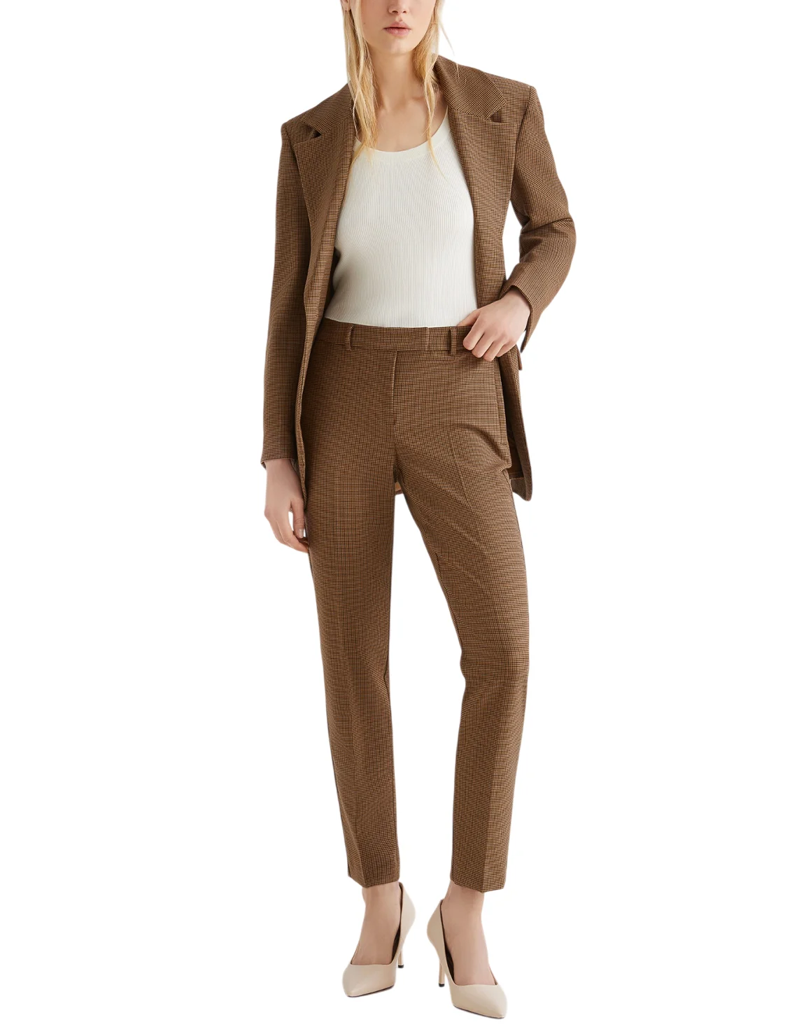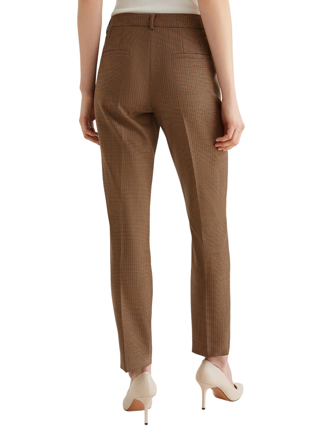Брюки изготовлены из полиэстера, шерсти и эластана. Модель выполнена в зауженном крое. Имеет скрытую застежку-молнию с крючком, петли для ремня, прессованные стрелки, боковые и задние прорезные карманы. Декорированы принтом в клетку.