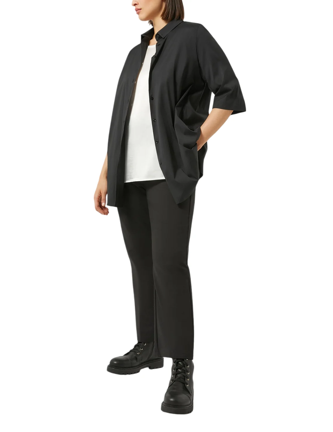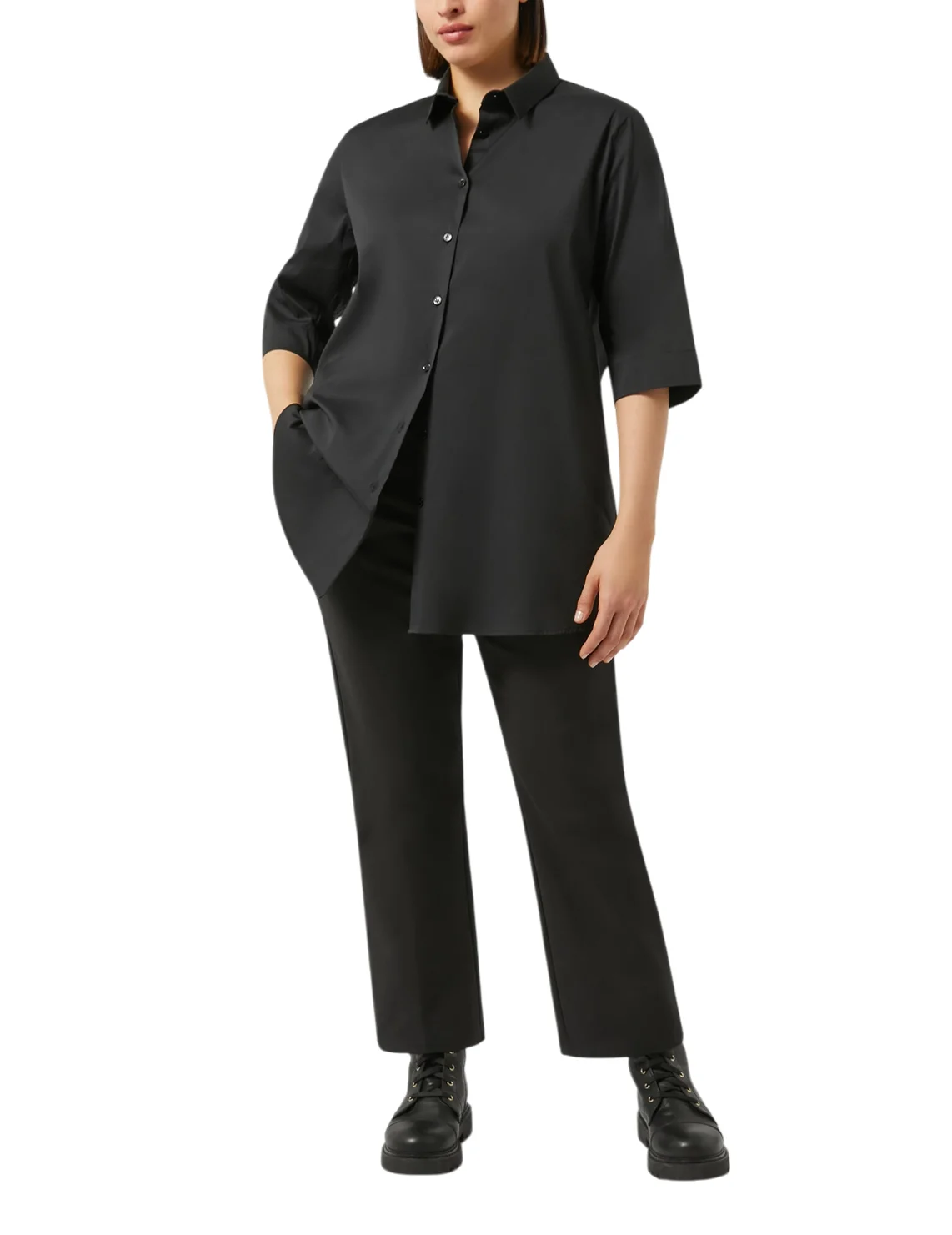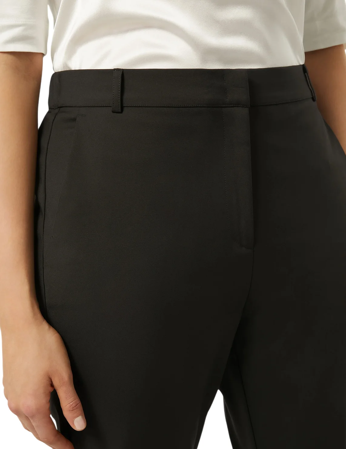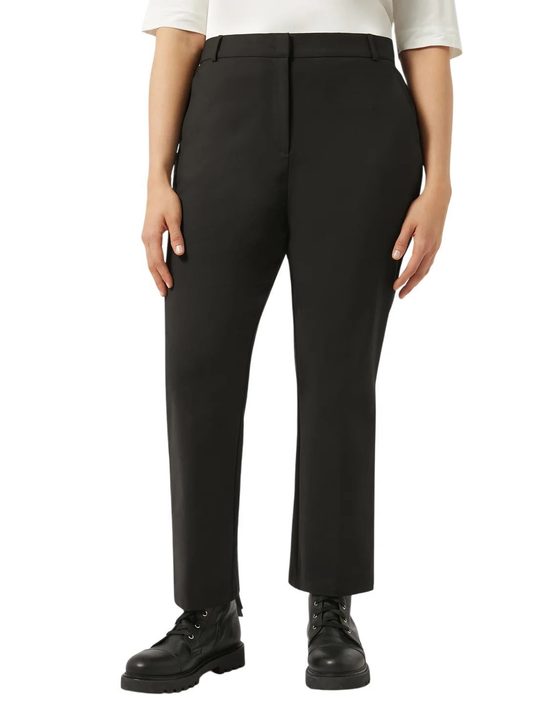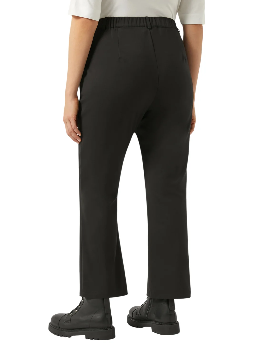 Брюки изготовлены из хлопка, полиамида и эластана. Модель выполнена в расклешенном крое. Имеет шлёвки для ремня, скрытую застежку-молнию с пуговицей, эластичную вставку на поясе и прорезные карманы.