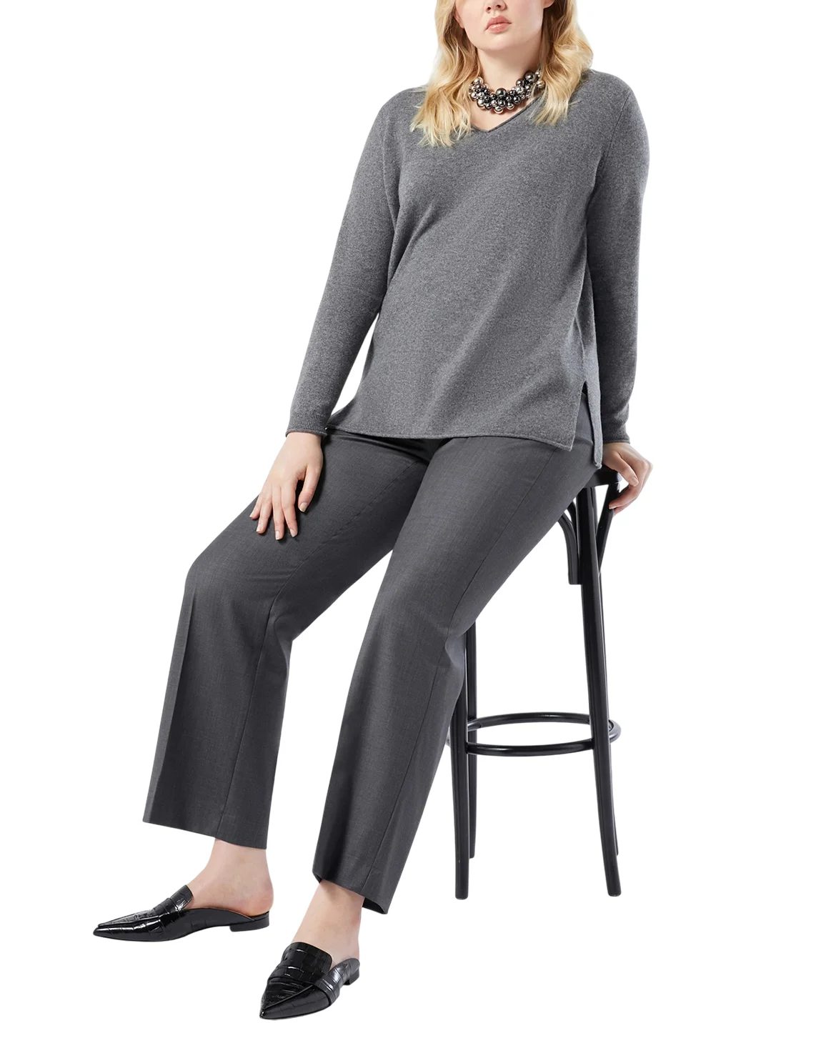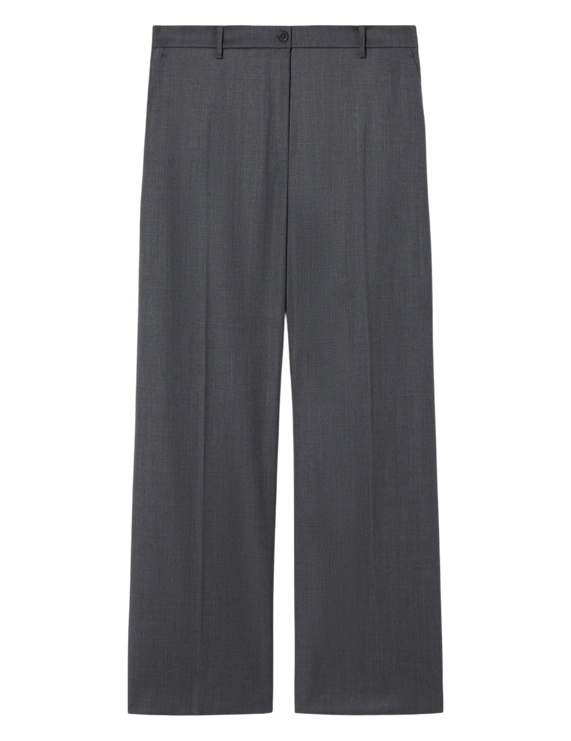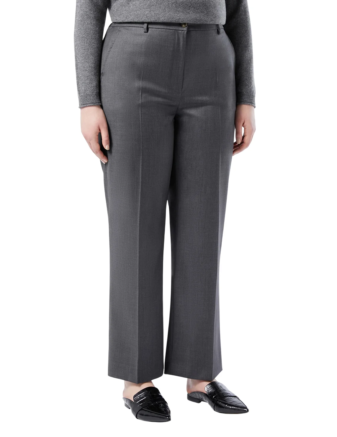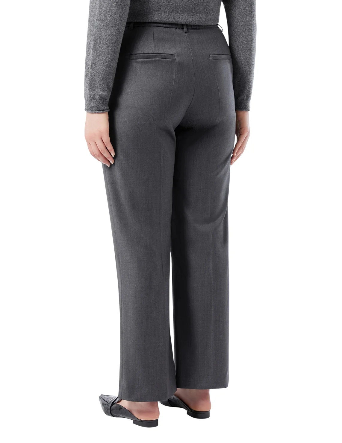Брюки изготовлены из шерсти, полиэстера и эластана. Модель выполнена в свободном крое. Имеет петли для ремня, скрытую застежку-молнию с пуговицей, эластичную вставку сзади на поясе, прессованные стрелки, прорезные боковые и задние карманы.