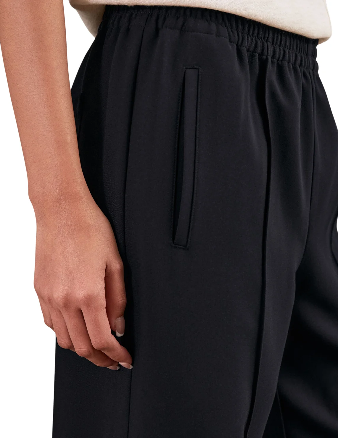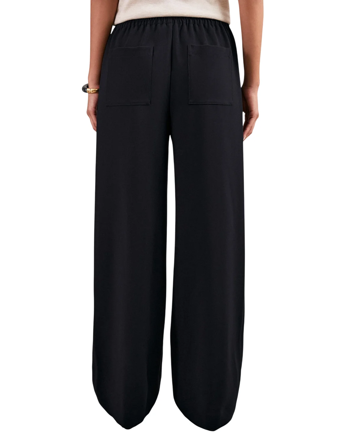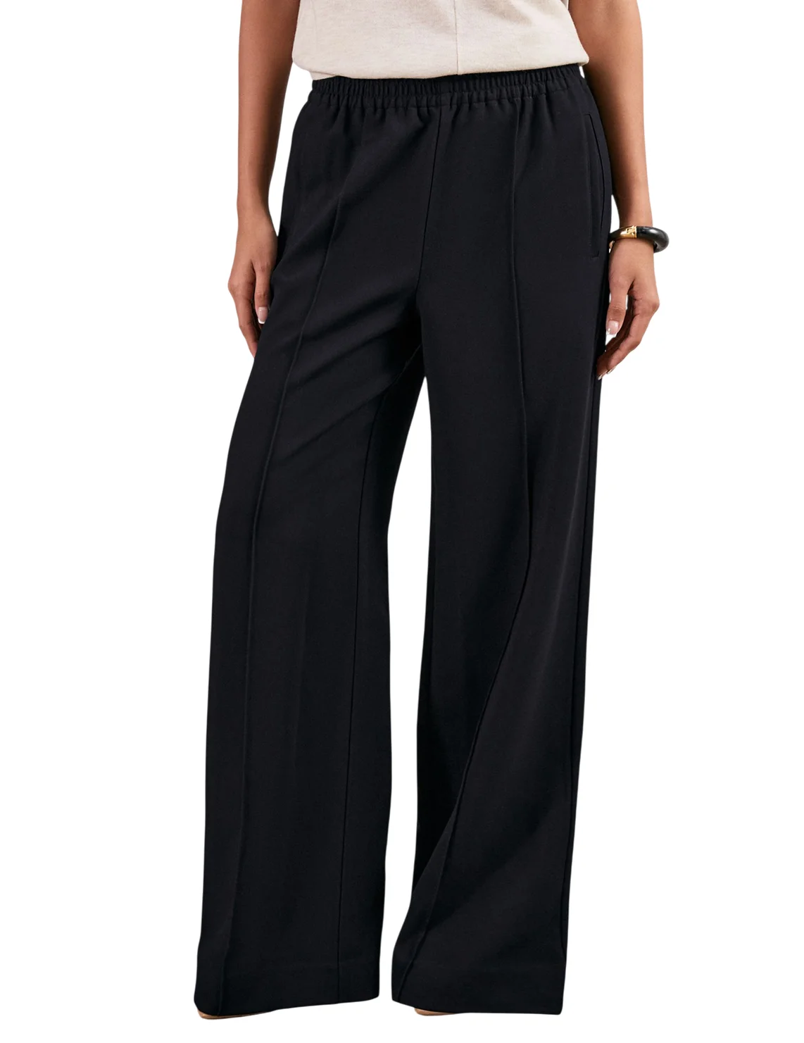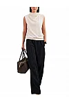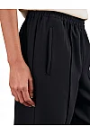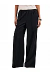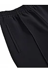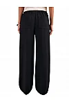 Брюки изготовлены из полиэстера, вискозы и эластана. Модель выполнена в свободном крое. Имеют боковые прорезные карманы, эластичный пояс, простроченные стрелки и задние накладные карманы.