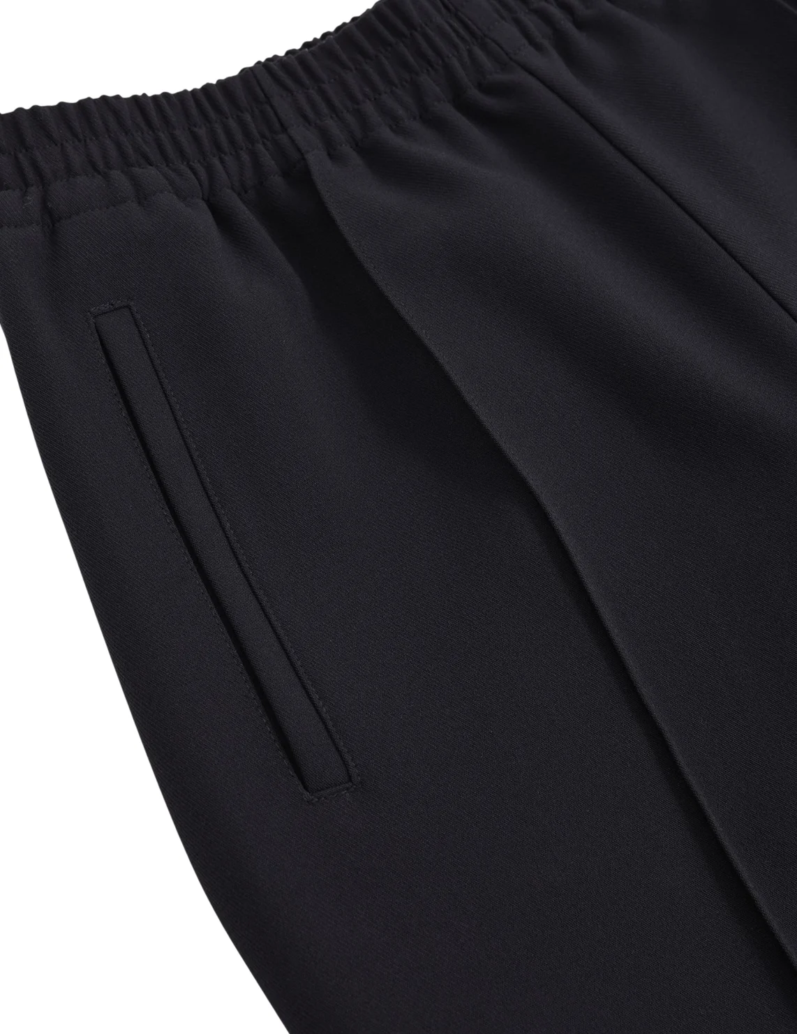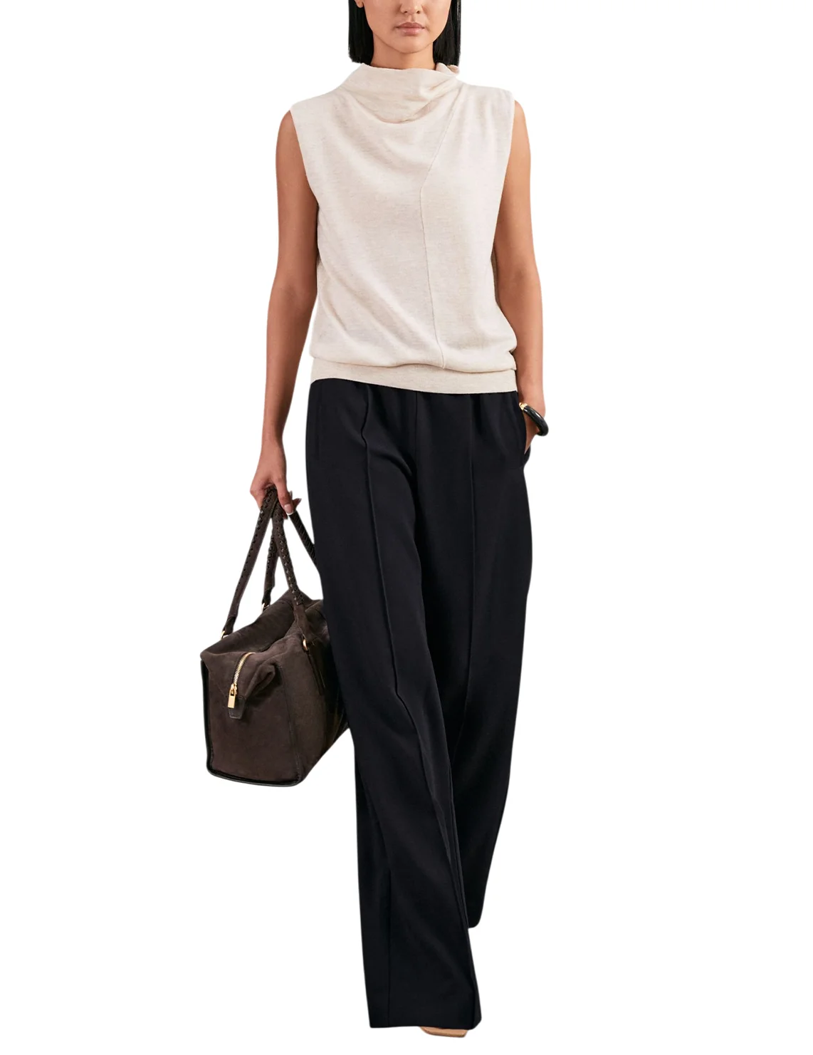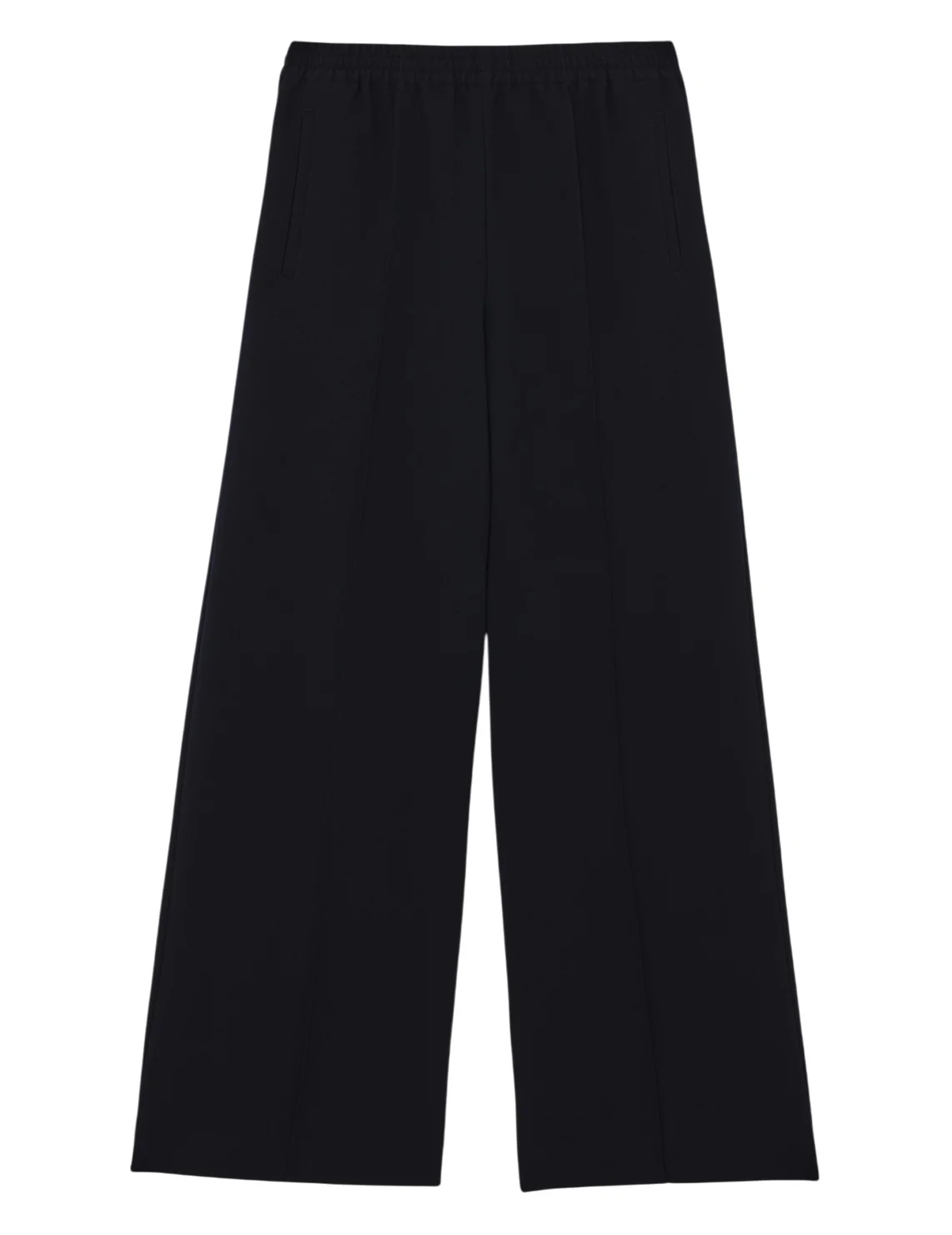 Брюки изготовлены из полиэстера, вискозы и эластана. Модель выполнена в свободном крое. Имеют боковые прорезные карманы, эластичный пояс, простроченные стрелки и задние накладные карманы.