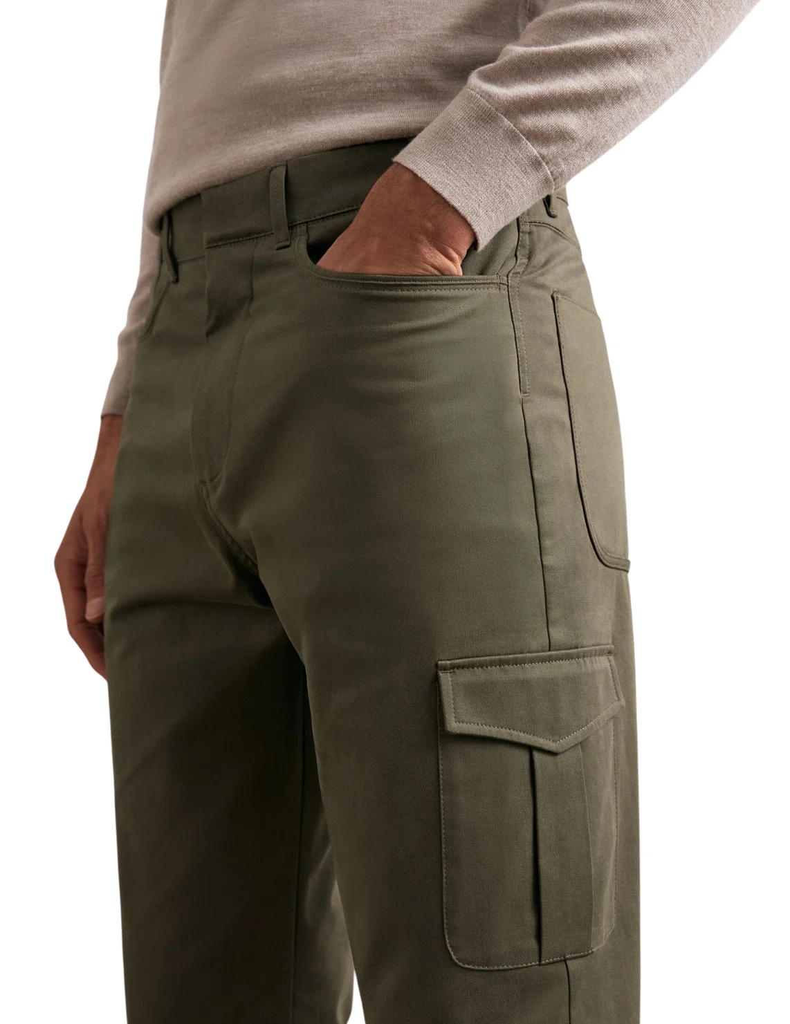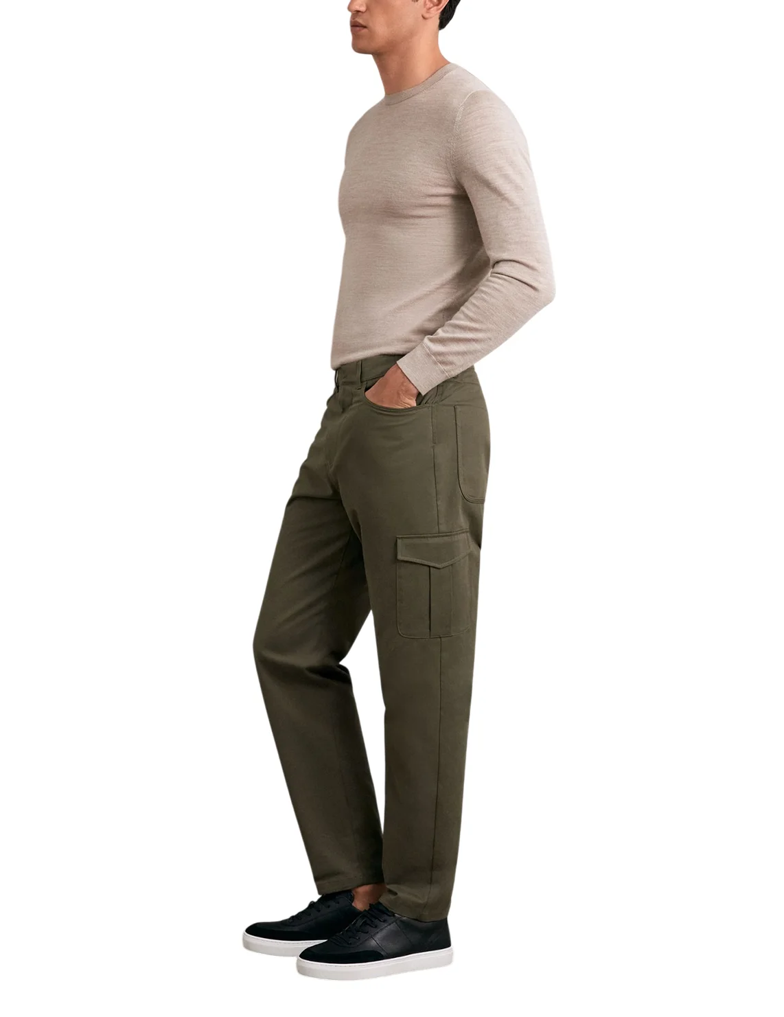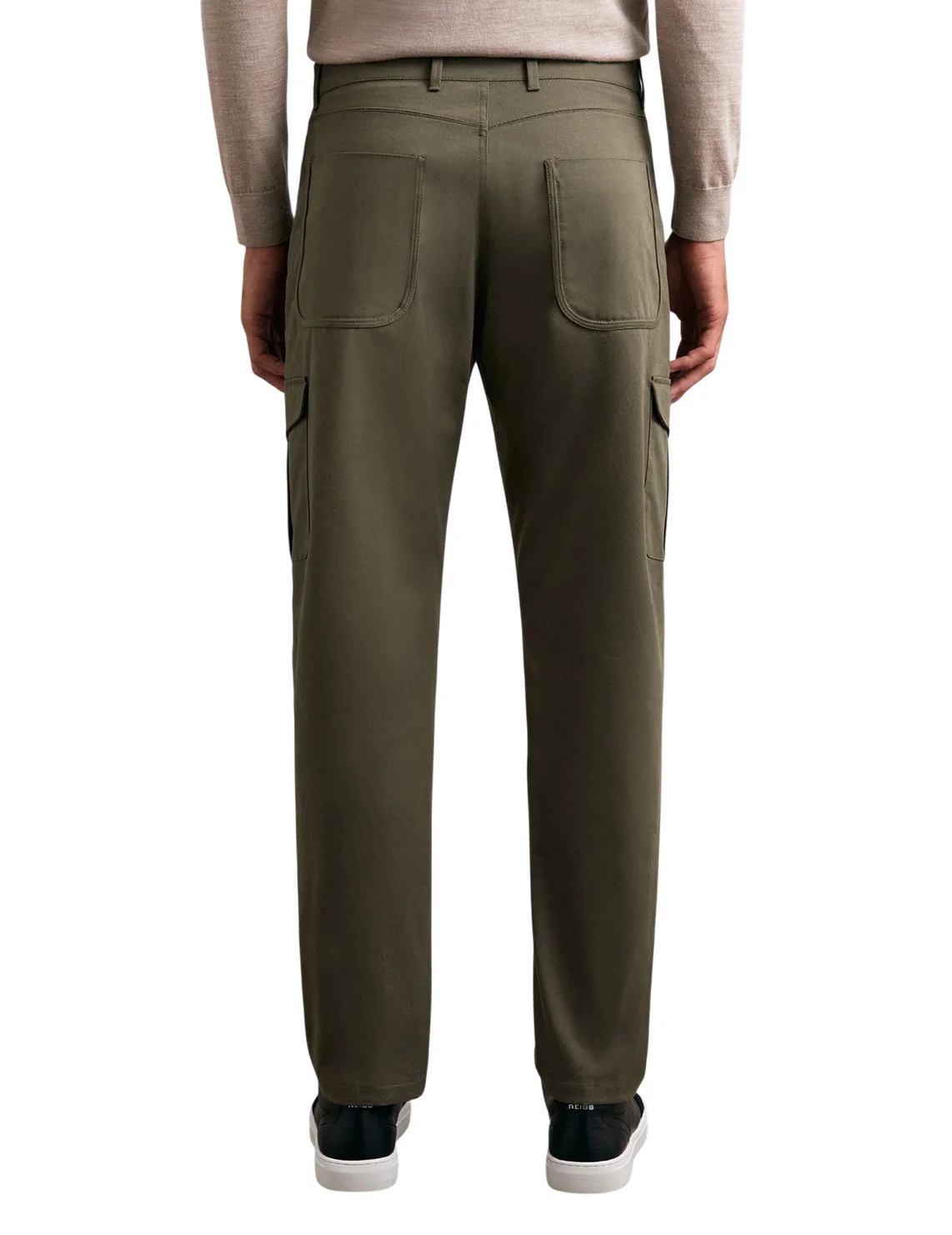 Брюки изготовлены из хлопка и эластана. Модель прямого кроя. Имеет петли для ремня, потайную застежку-молнию с крючком, два передних прорезных кармана, два боковых кармана с клапанами на штанинах и два задних накладных кармана.