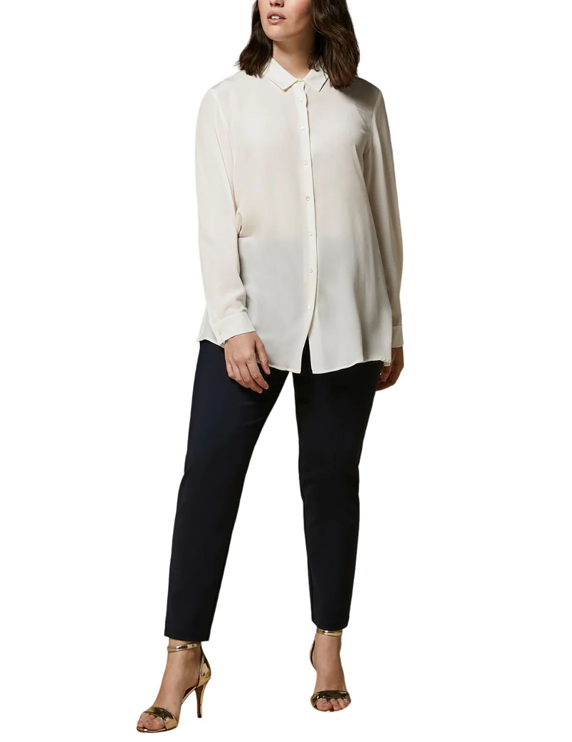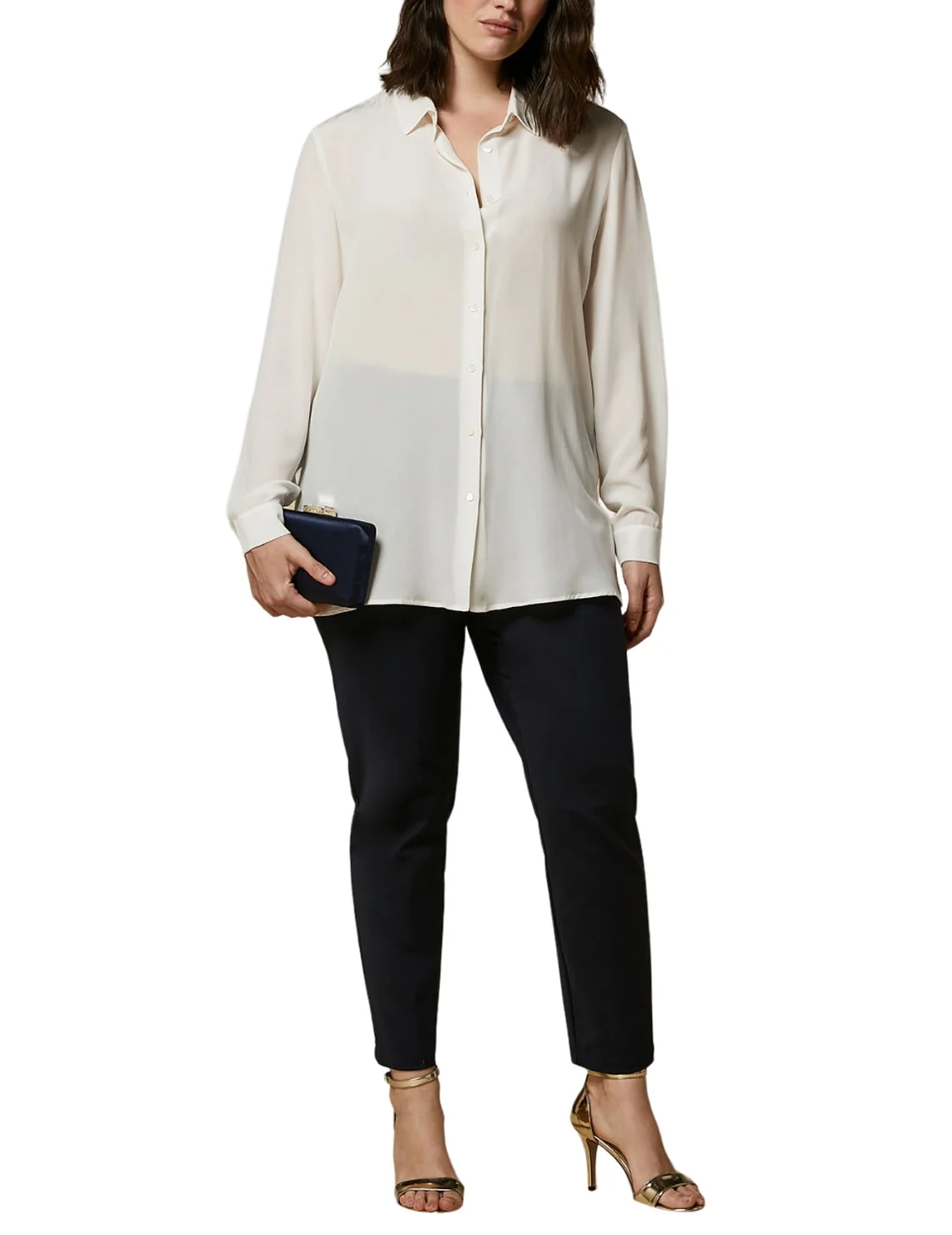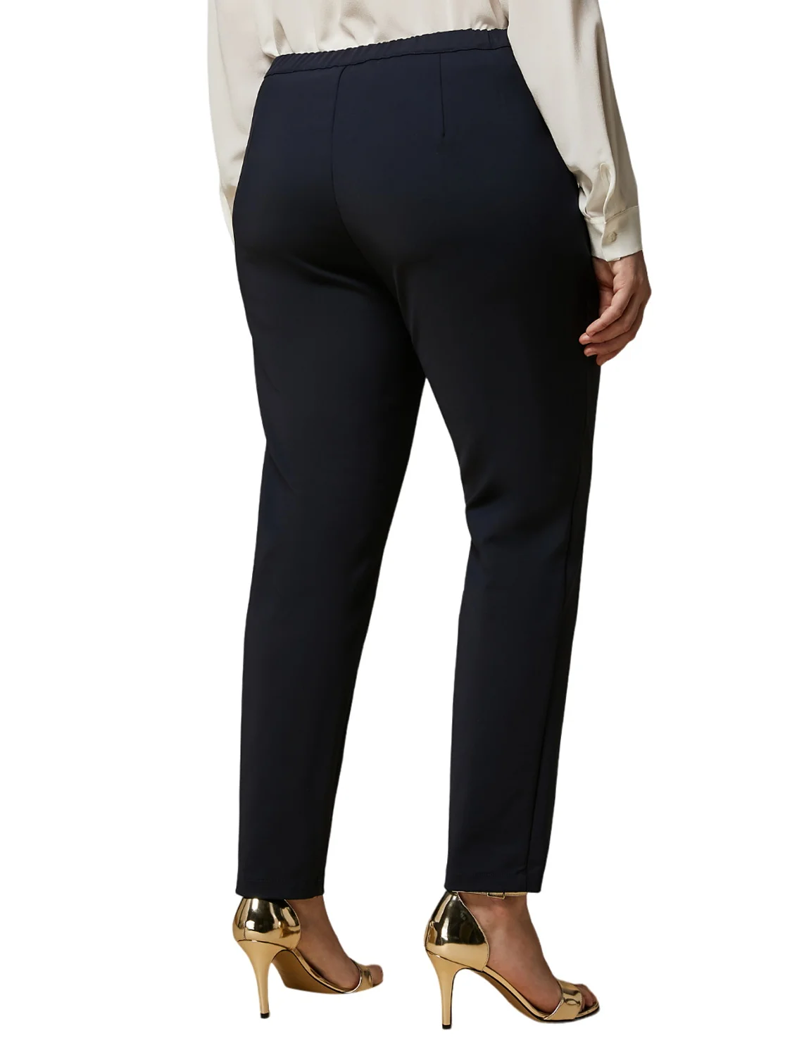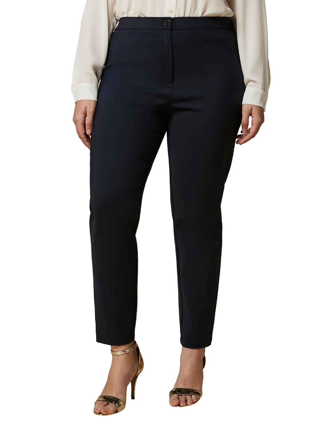 Брюки Rosa темно-синего цвета от бренда Marina Rinaldi изготовлены из хлопка с добавлением полиамида и эластана. Модель выполнена в зауженном укороченном крое. Имеют эластичный пояс сзади и скрытую застежку-молнию с пуговицей спереди.