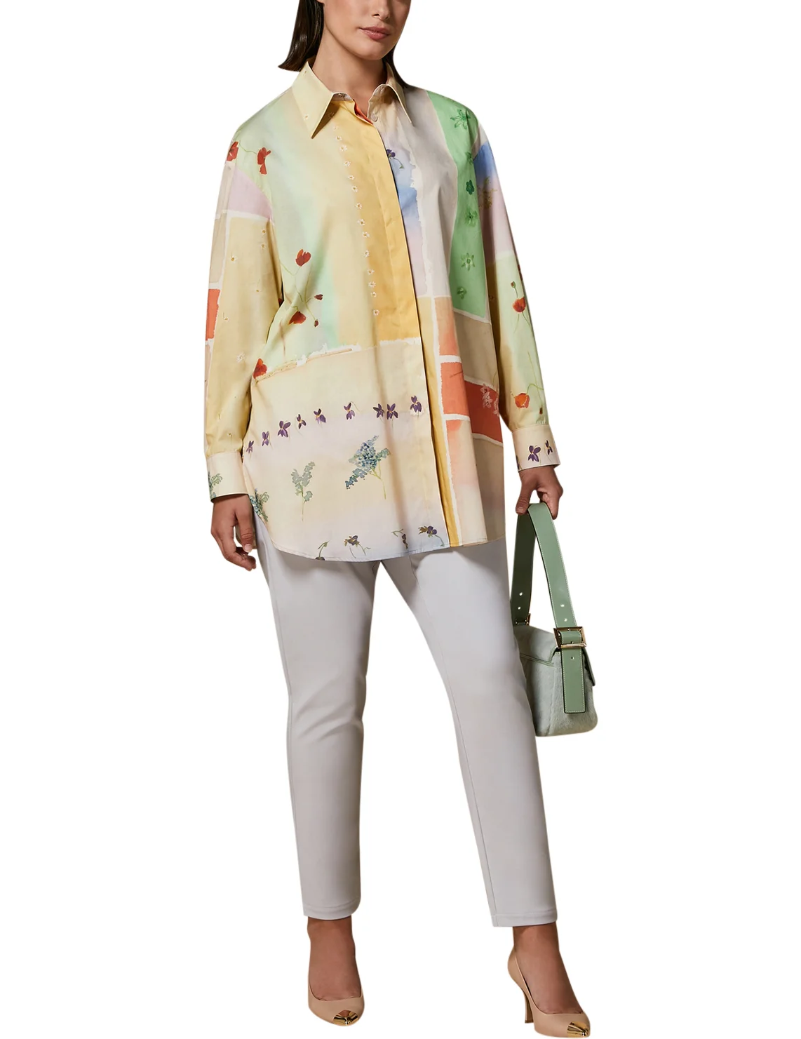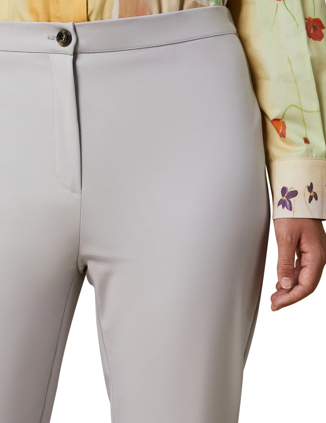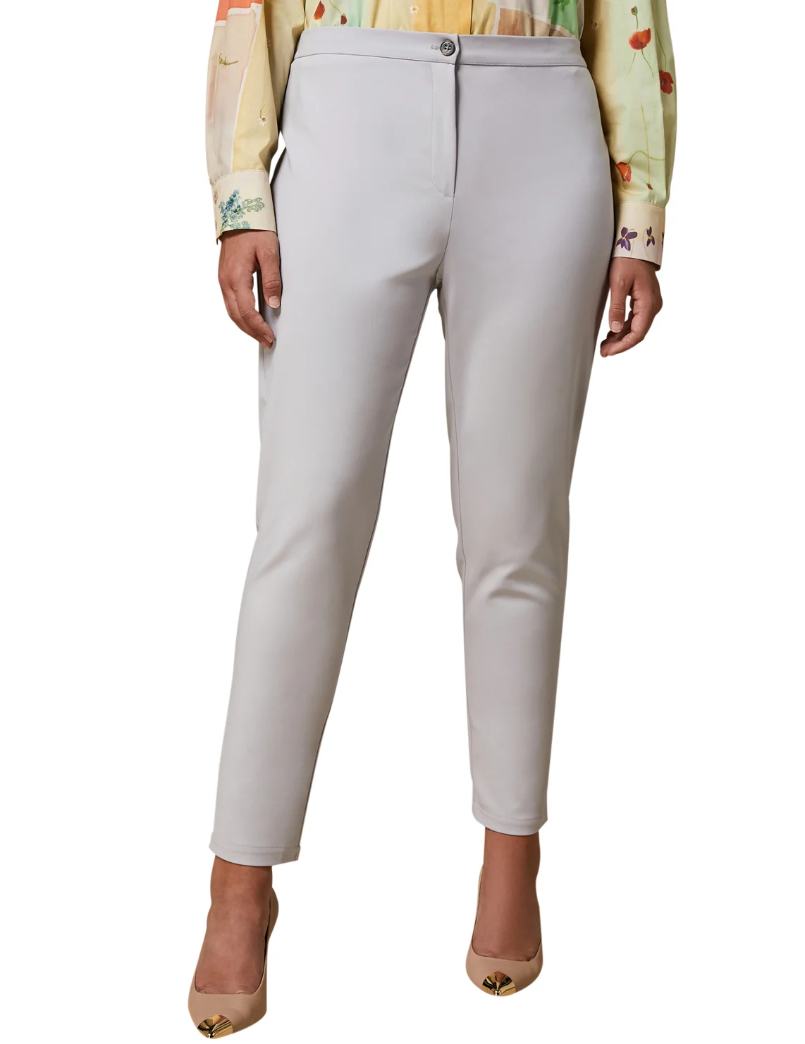 Брюки Rosa в сером цвете от бренда Marina Rinaldi изготовлены из хлопка с добавлением полиамида и эластана. Модель выполнена в зауженном укороченном крое. Имеют эластичный пояс сзади и скрытую застежку-молнию с пуговицей спереди.
