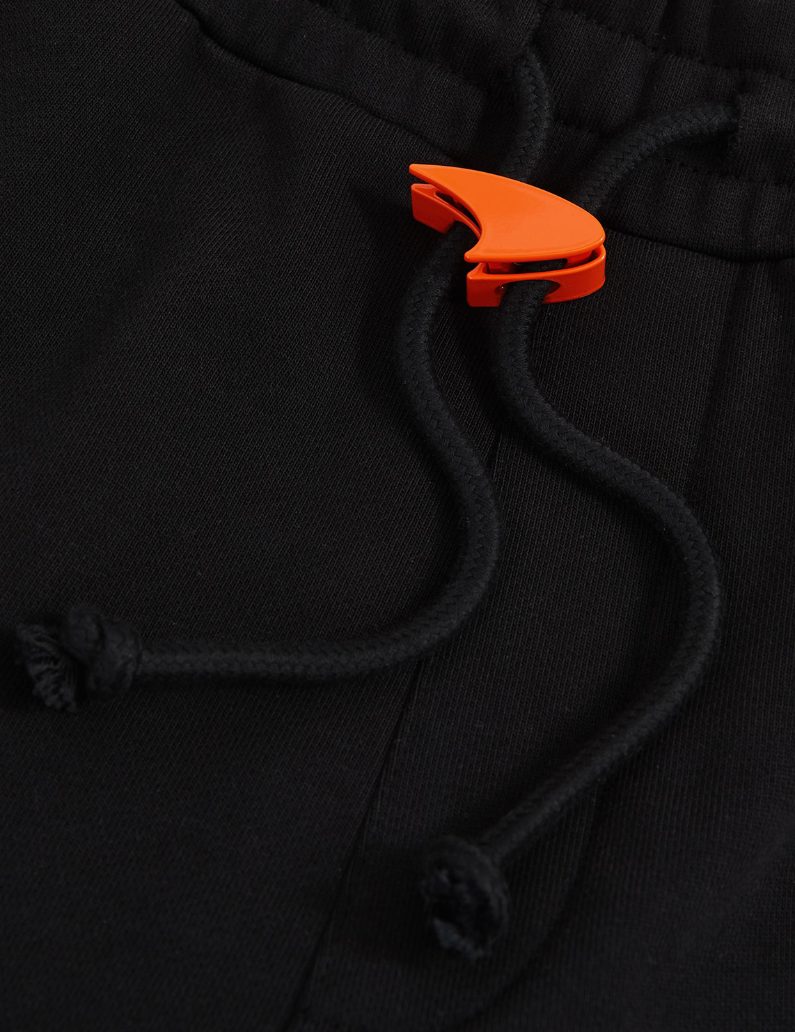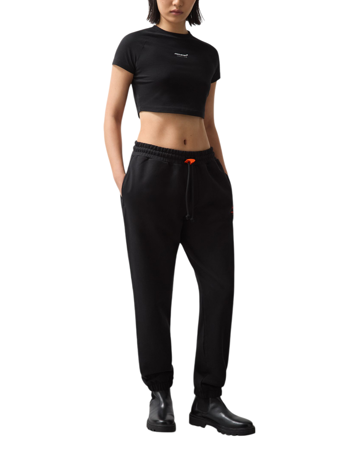Брюки изготовлены из 100% хлопка высокого качества. Модель выполнена в зауженном крое. Имеет эластичный пояс с кулиской, прорезные боковые карманы, манжеты на подоле штанин и один накладной карман сзади. Декорированы логотипом McLaren.