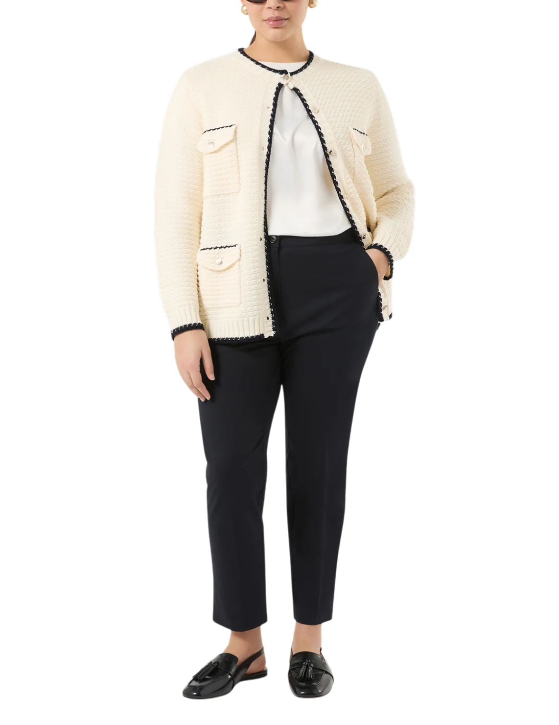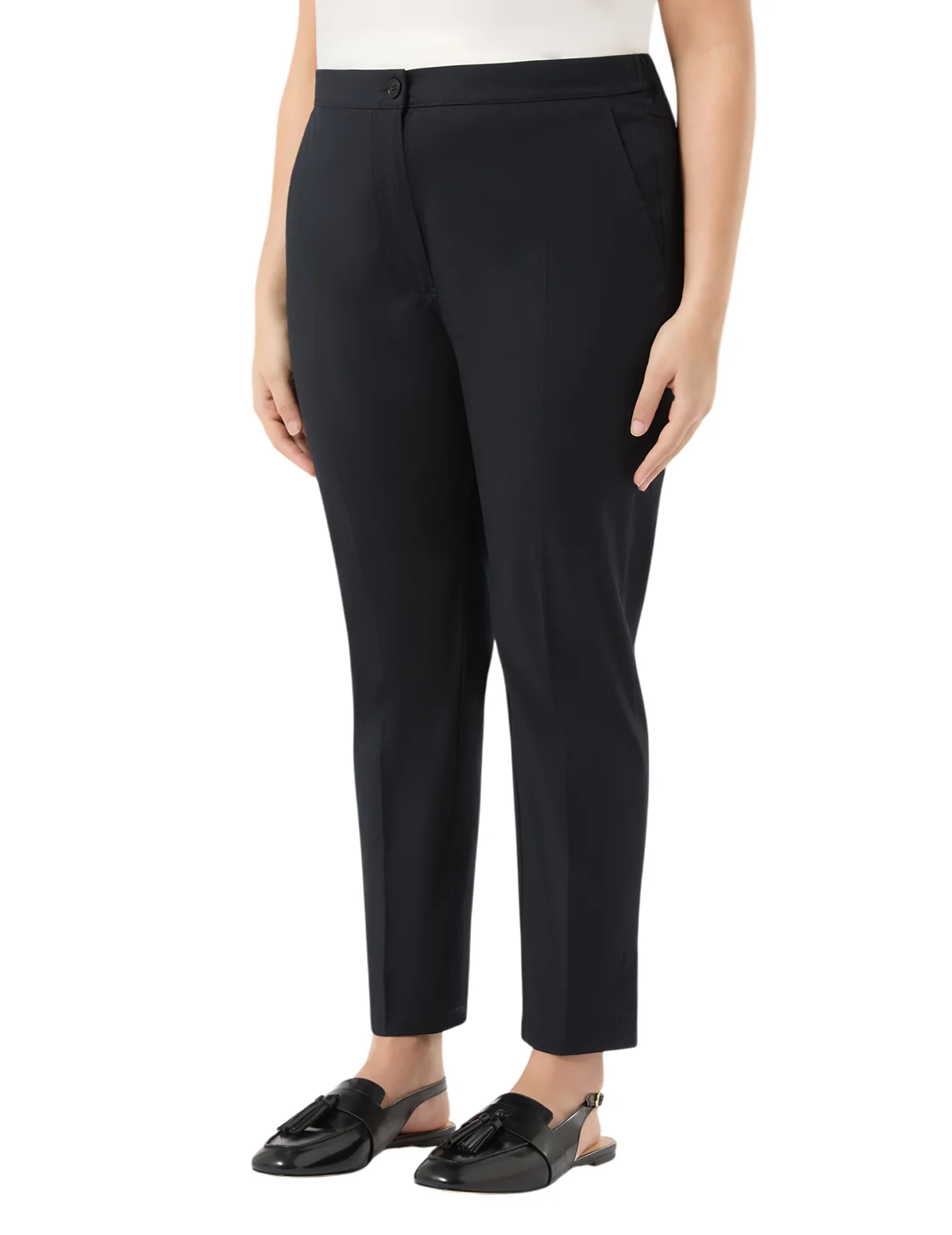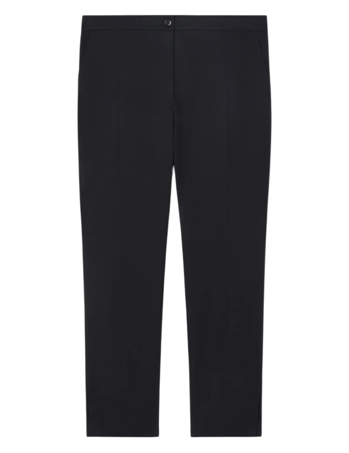 Брюки изготовлены из хлопка и эластана. Модель выполнена в зауженном крое. Имеет скрытую застежку-молнию с пуговицей, прессованные стрелки, два боковых прорезных кармана и разрезы на подоле штанин.