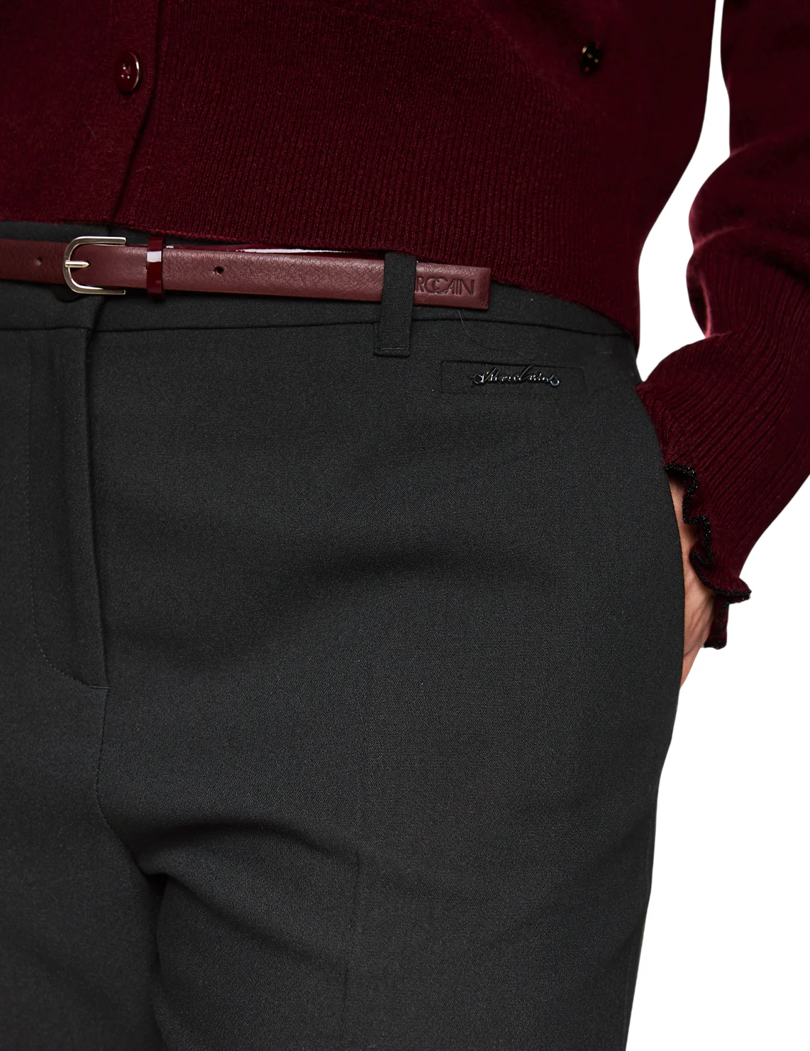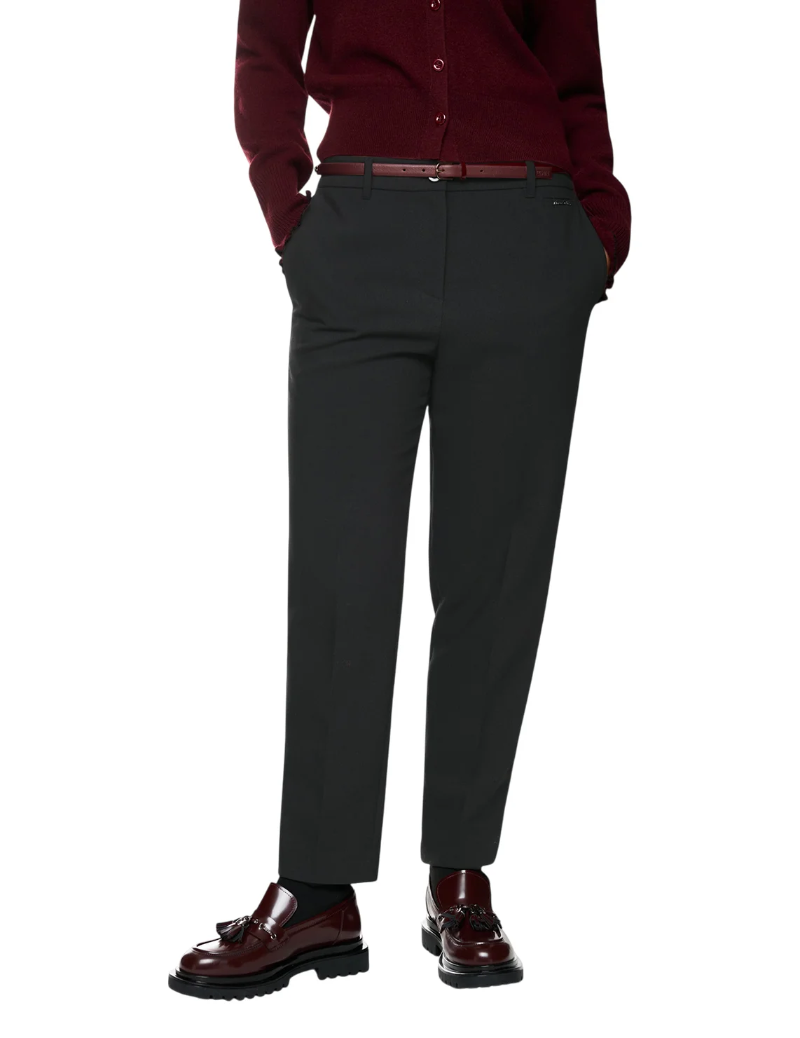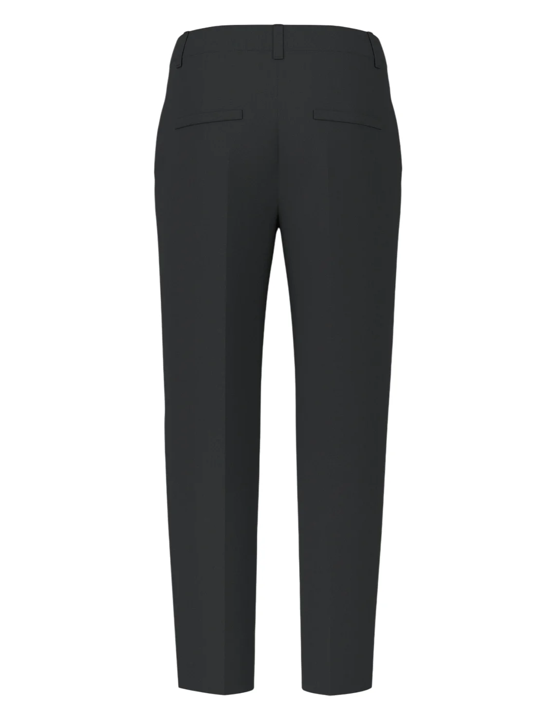 Брюки изготовлены из полиэстера, вискозы и эластана. Модель выполнена в прямом крое. Имеет петли для ремня, прессованные стрелки, потайную застежку-молнию с пуговицей и прорезные карманы.