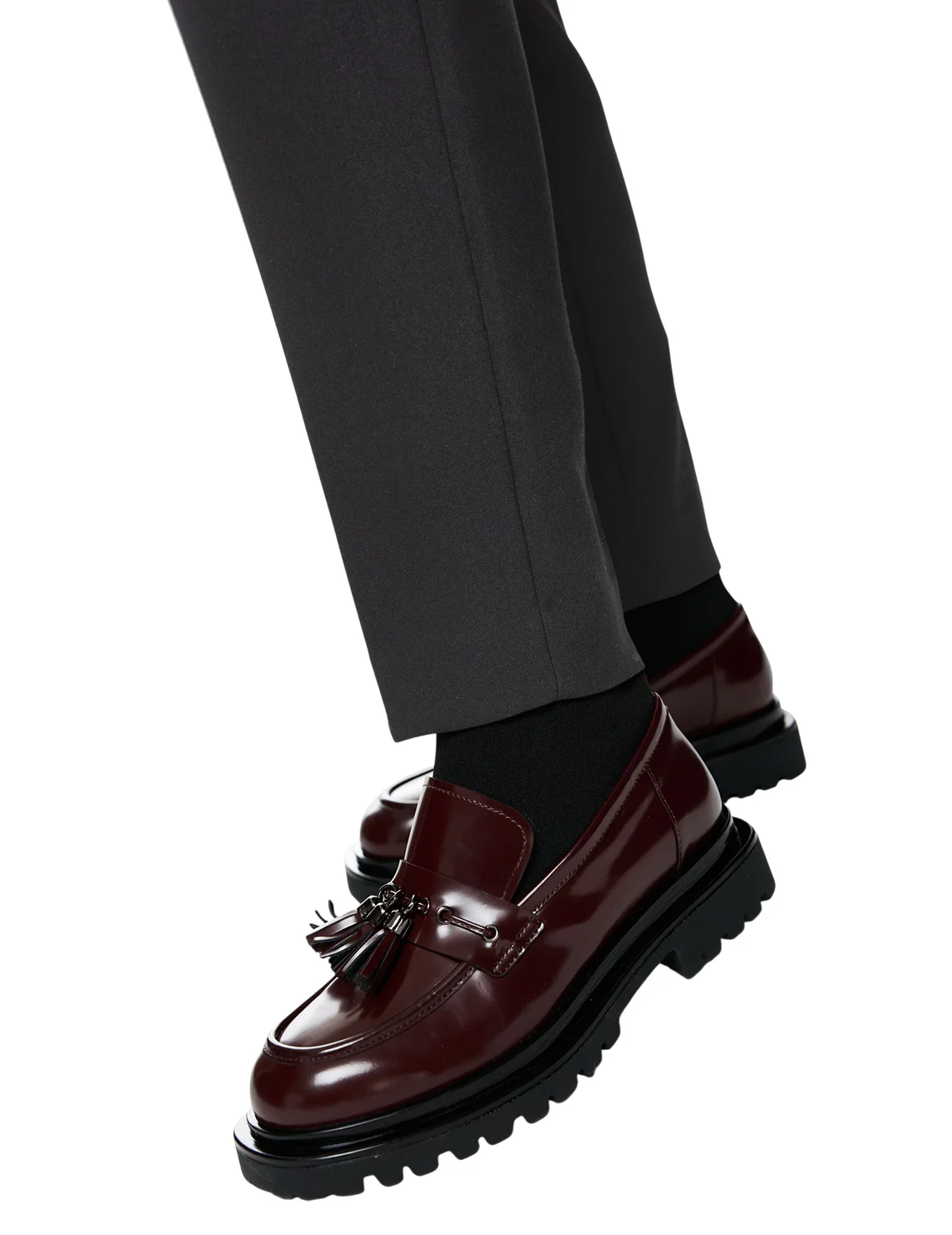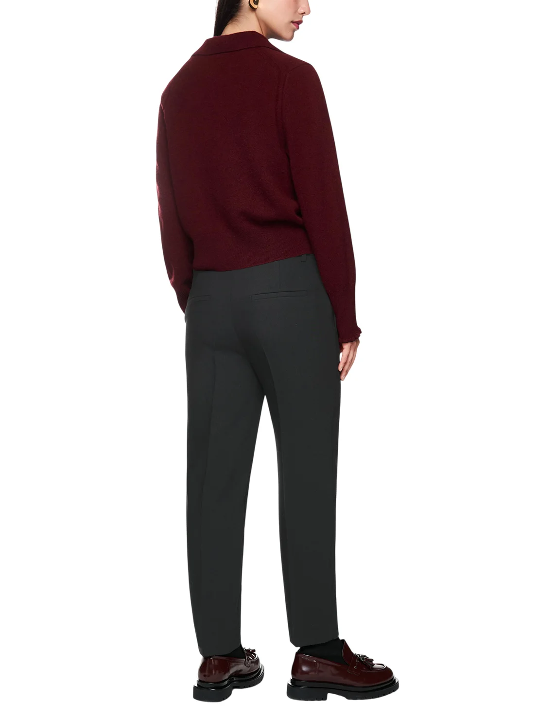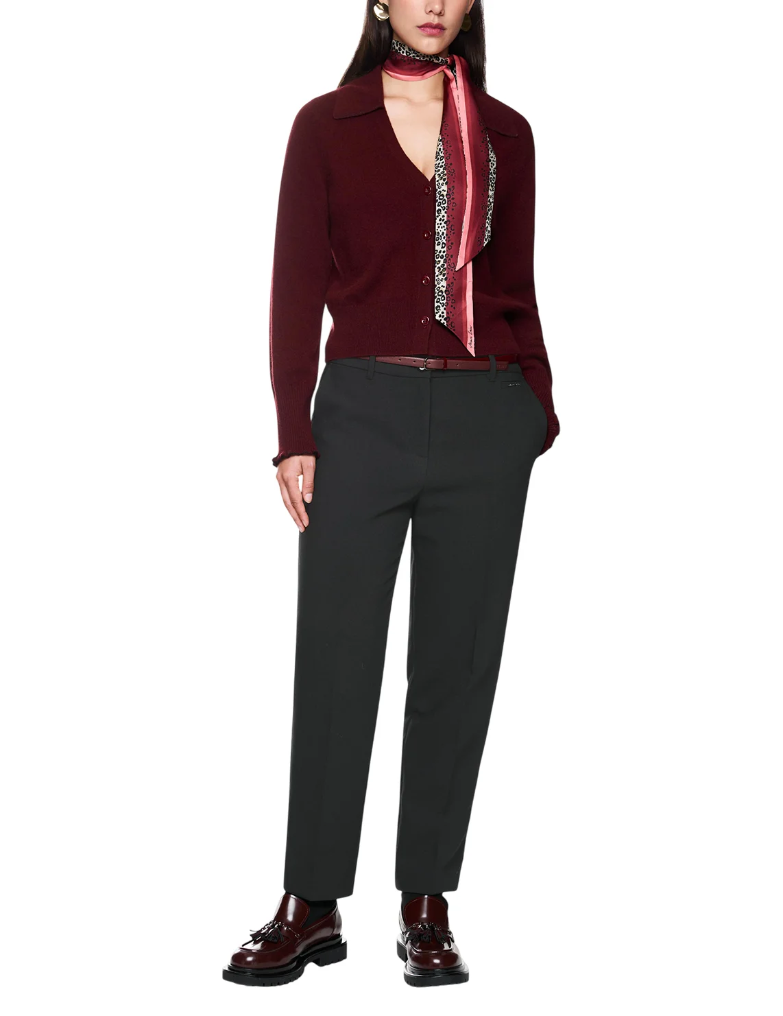Брюки изготовлены из полиэстера, вискозы и эластана. Модель выполнена в прямом крое. Имеет петли для ремня, прессованные стрелки, потайную застежку-молнию с пуговицей и прорезные карманы.