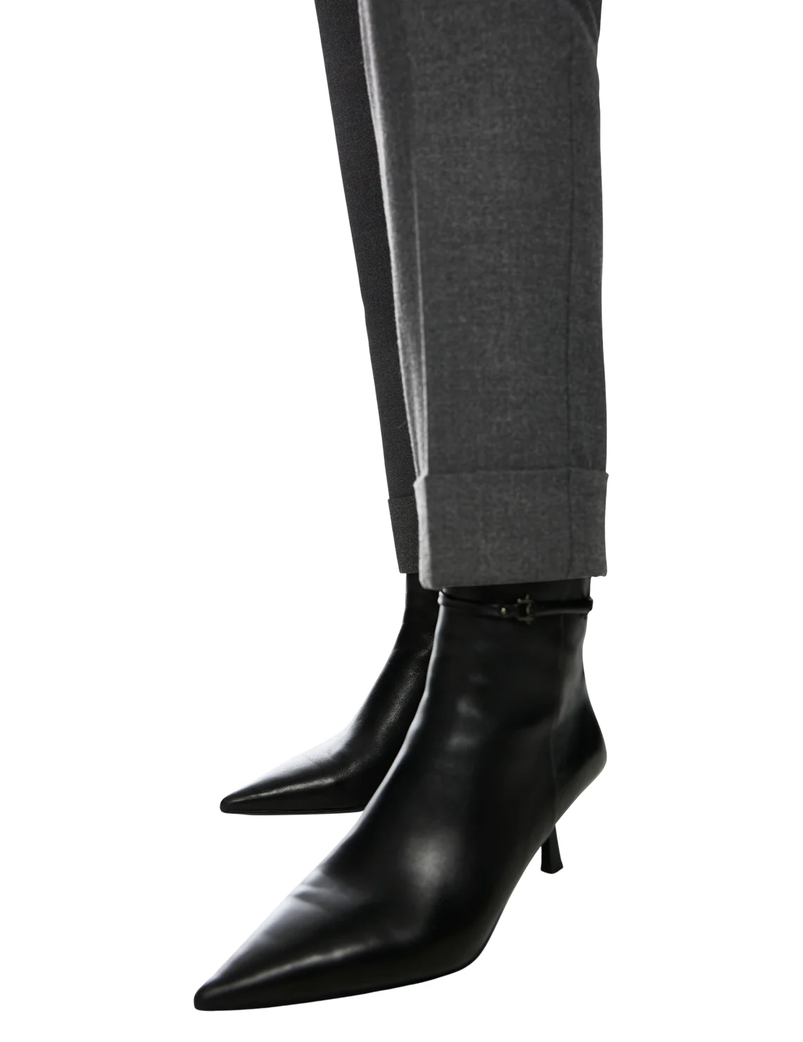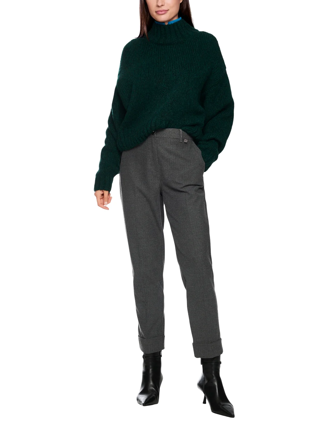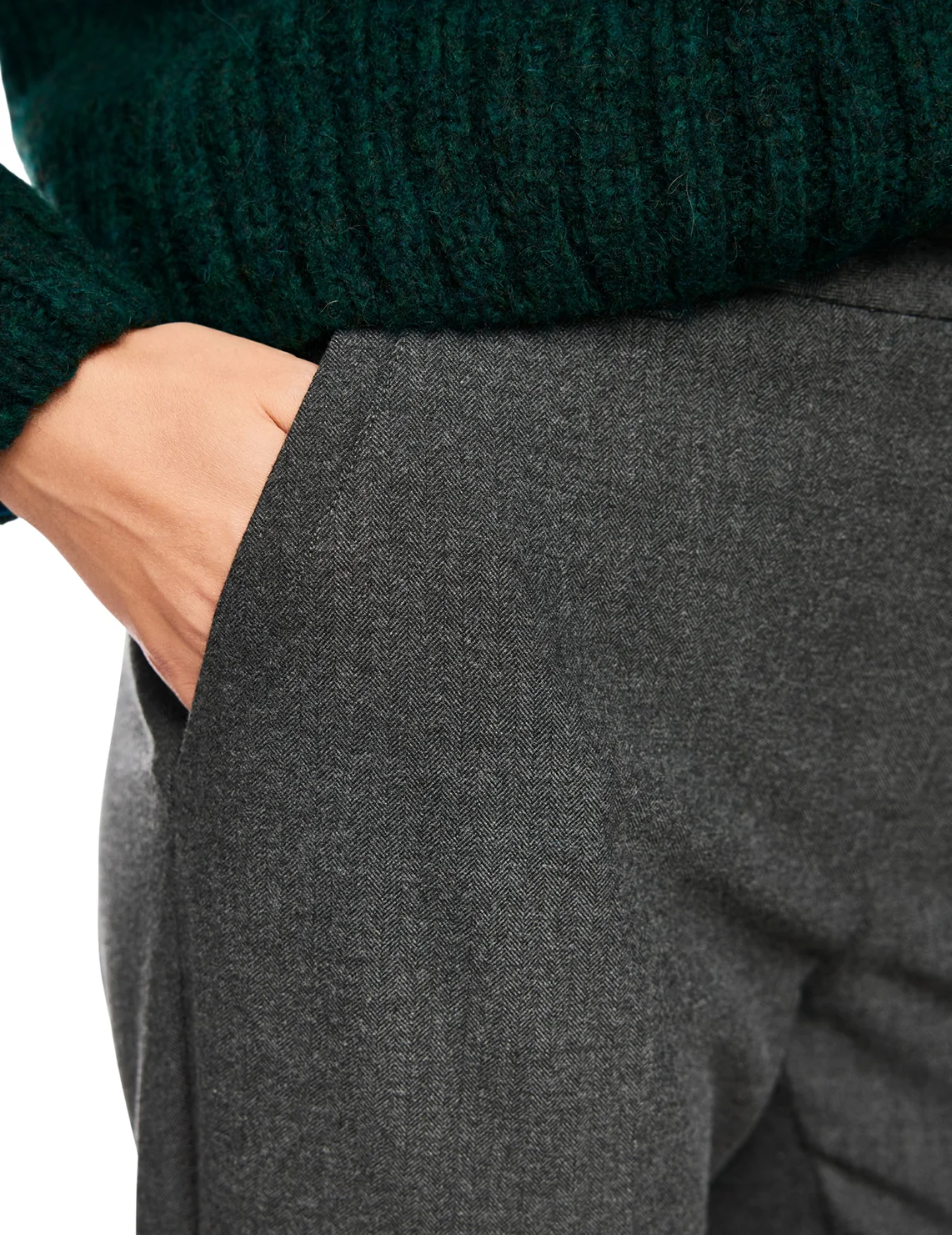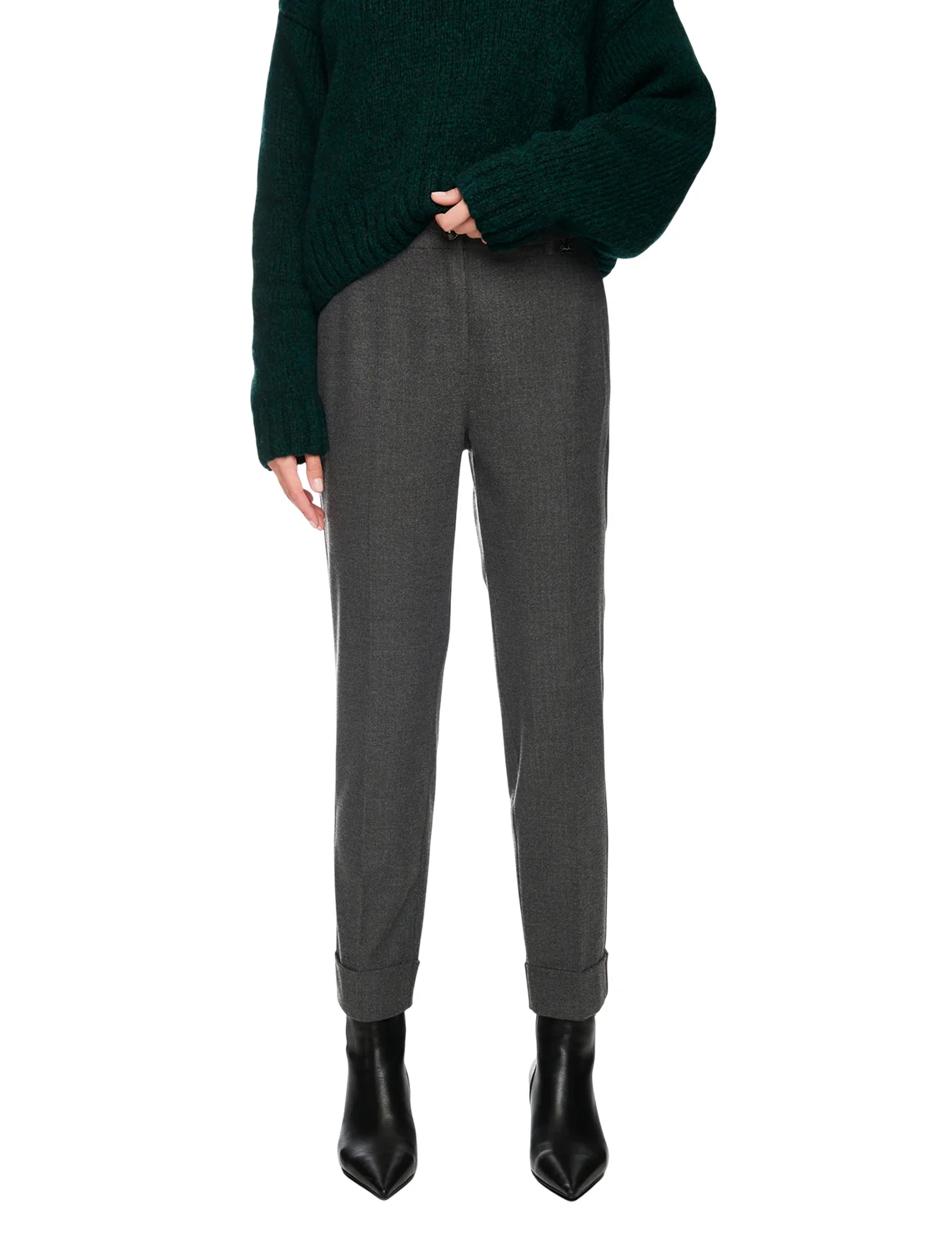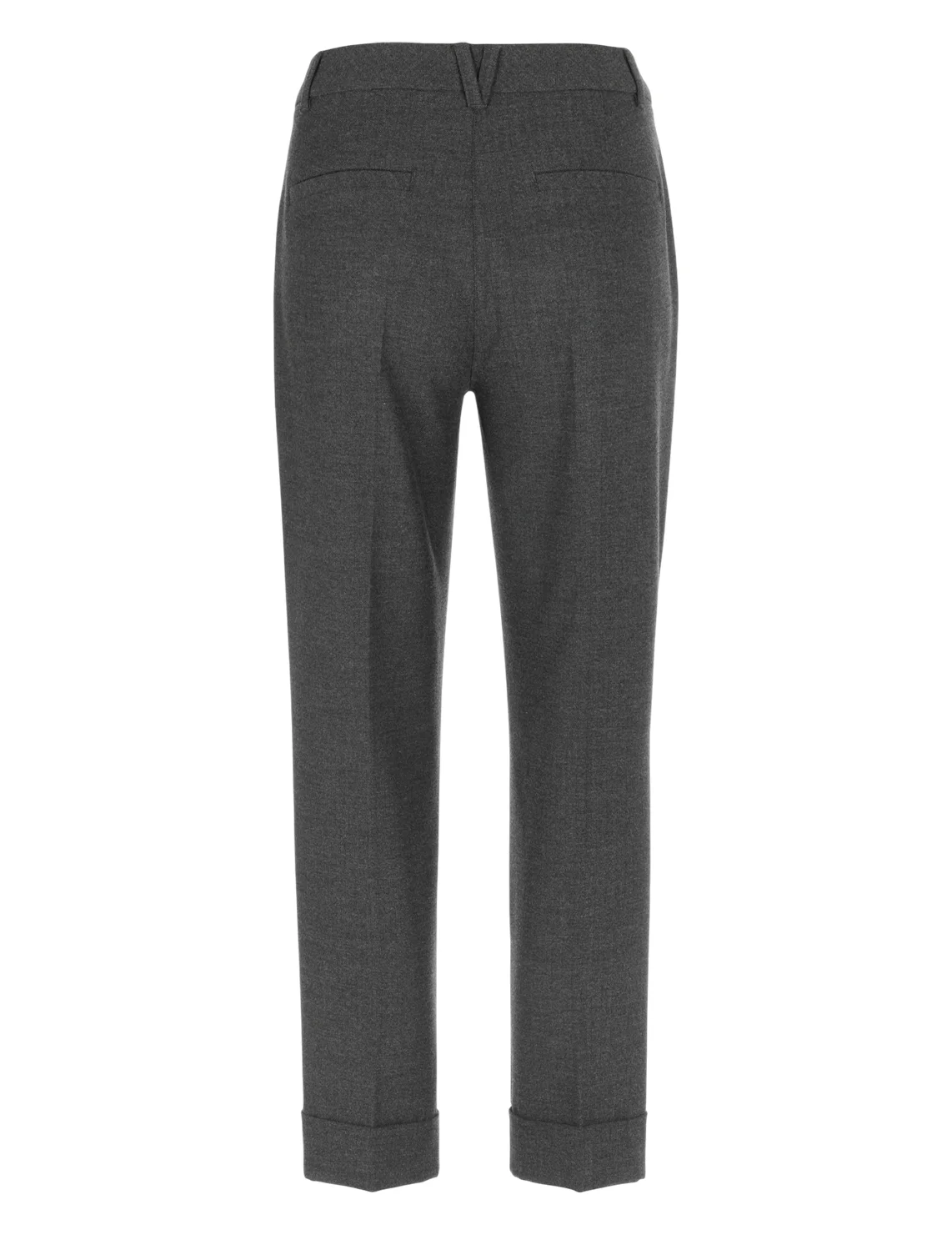 Брюки изготовлены из полиэстера, вискозы и эластана. Модель выполнена в зауженном крое. Имеет петли для ремня, прессованные стрелки, потайную застежку-молнию с пуговицей, отвороты, боковые и задние прорезные карманы.