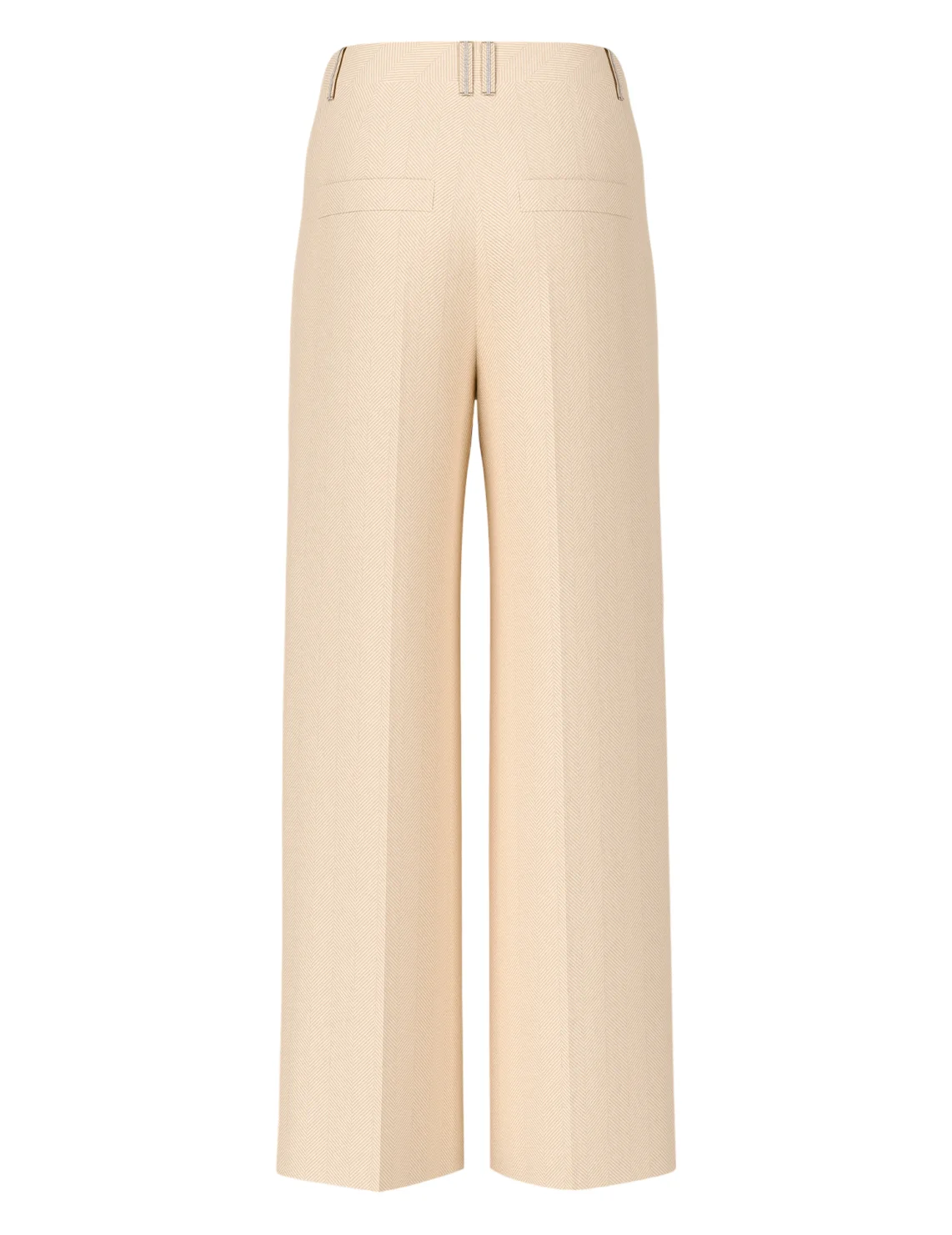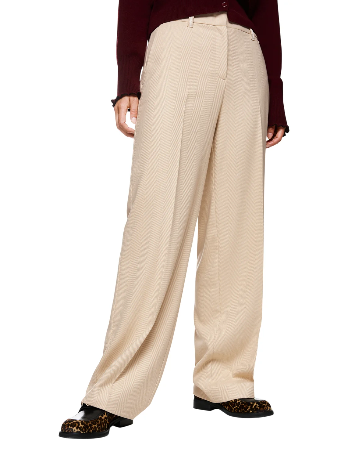 Брюки изготовлены из полиэстера, вискозы и эластана. Модель выполнена в свободном крое. Имеет скрытую застежку-молнию с крючком, шлевки для ремня, прессованные стрелки и прорезные карманы. Декорированы оригинальным принтом.