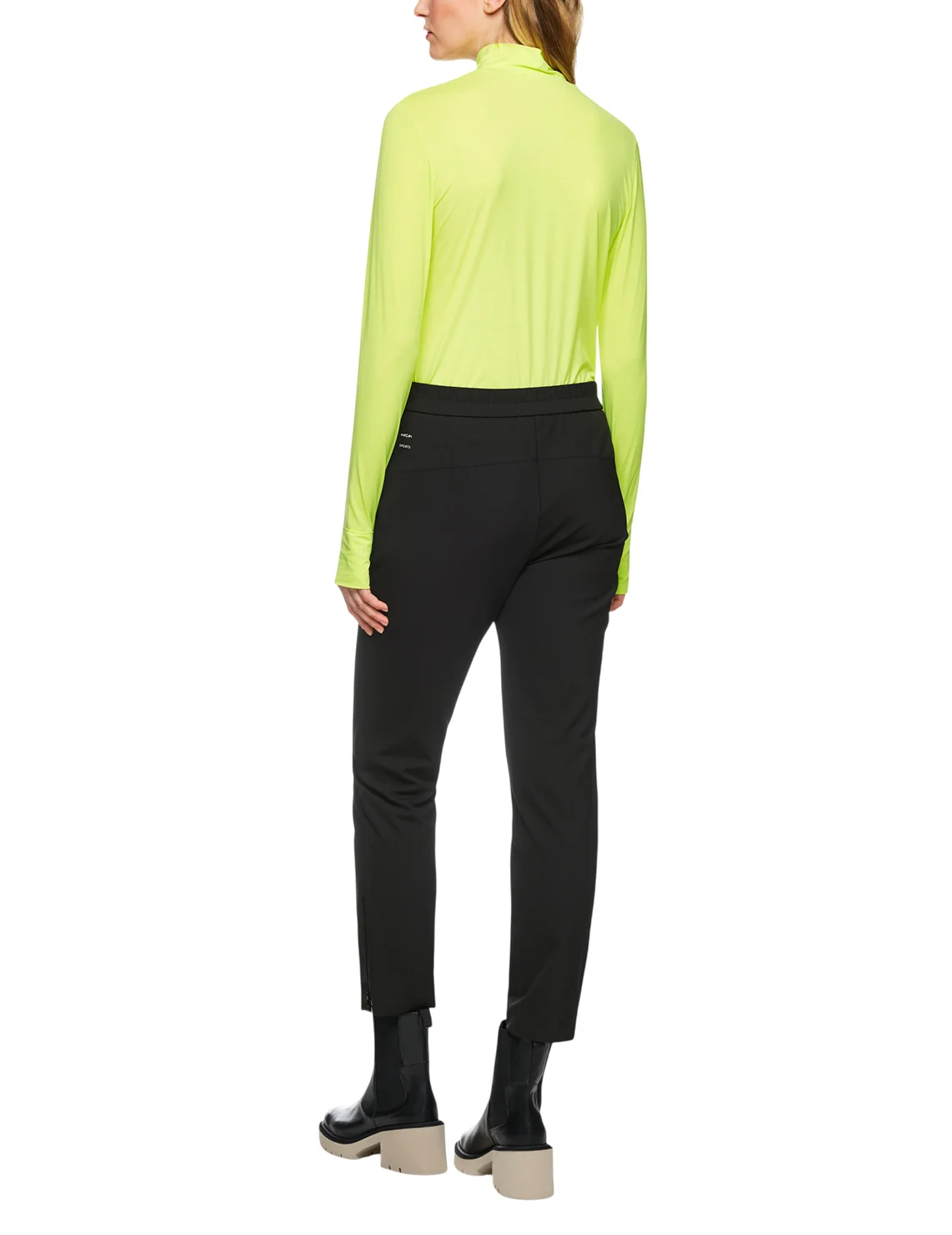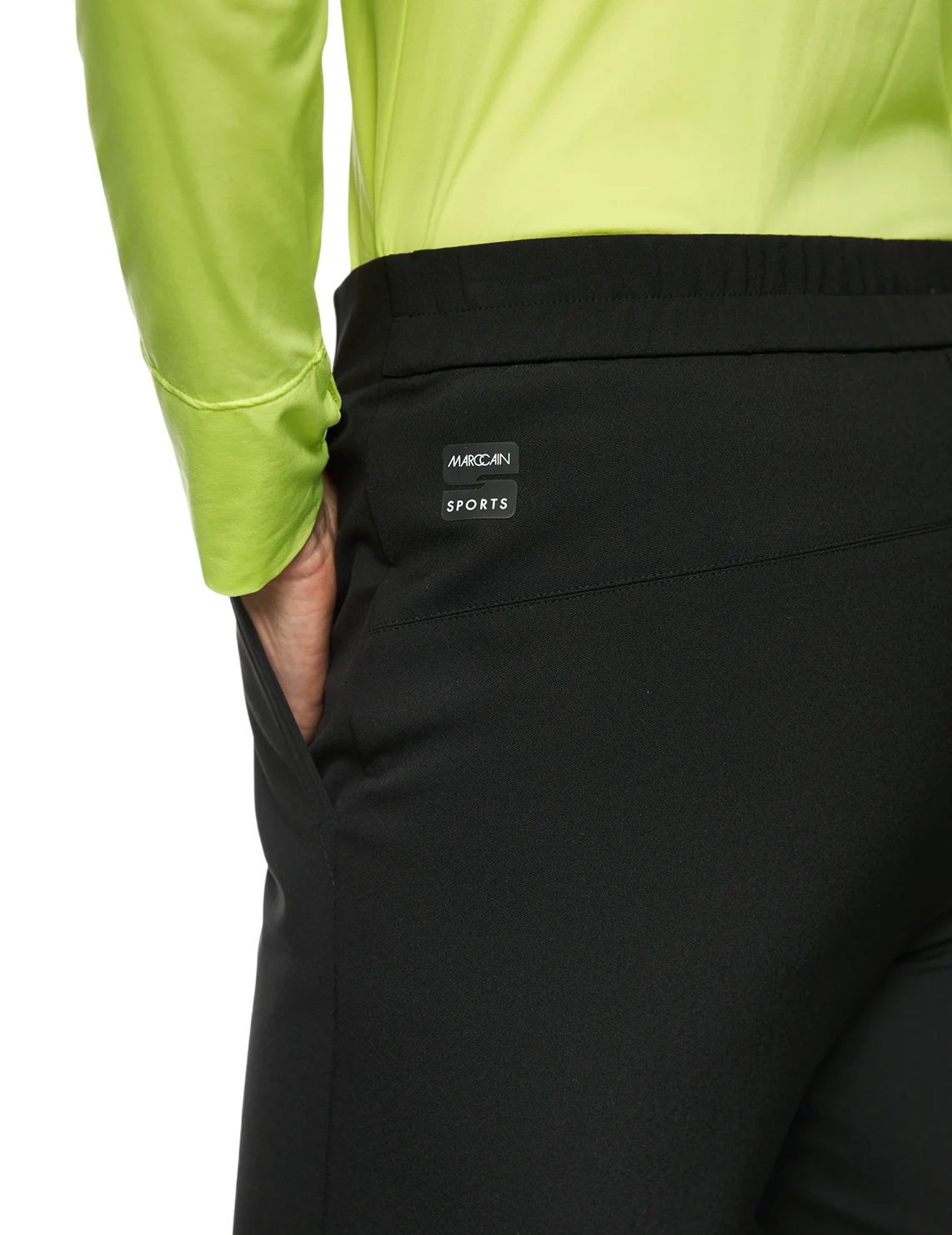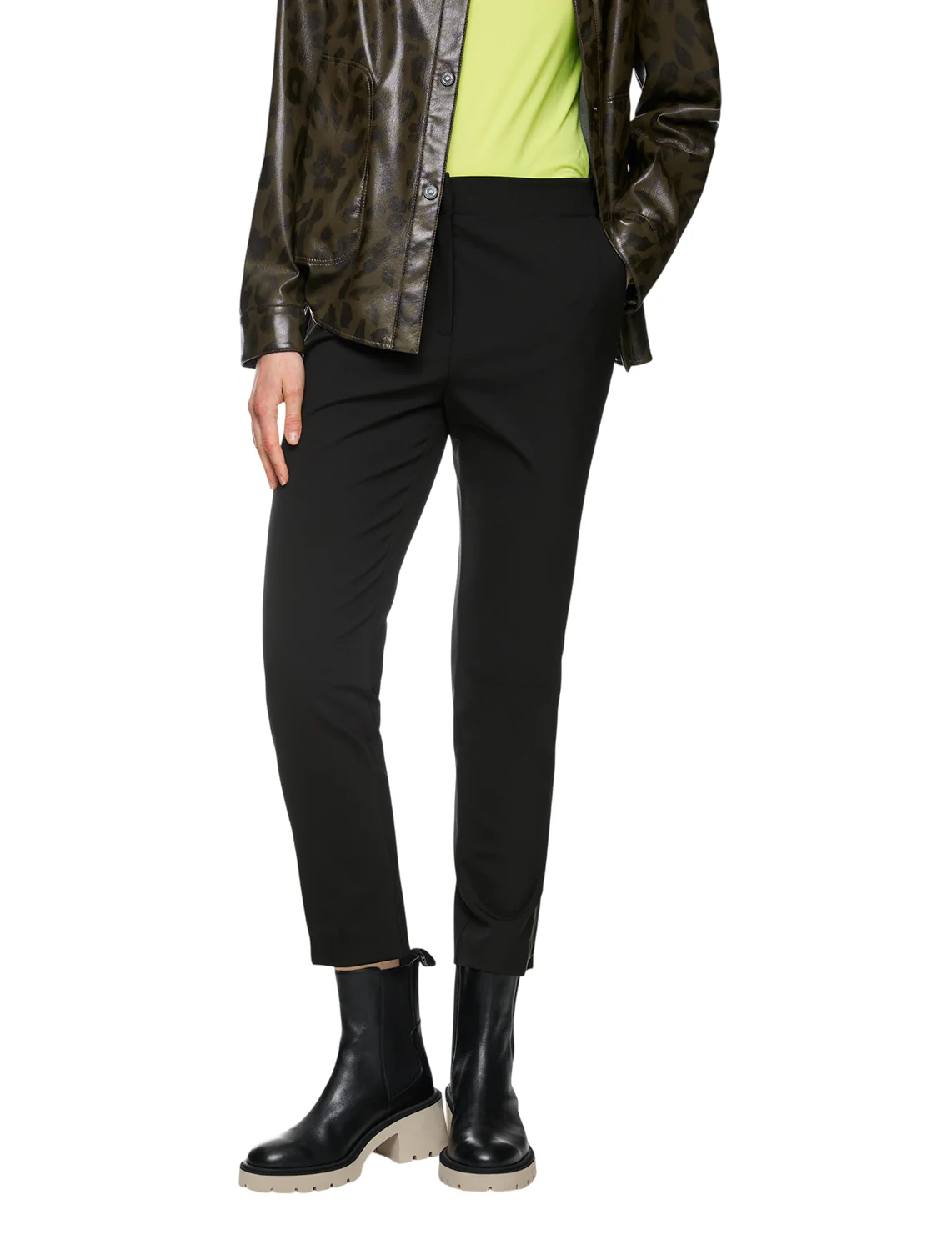 Брюки изготовлены из полиамида и эластана. Модель выполнена в зауженном крое. Имеет потайную застежку-молнию с крючком, эластичную вставку на поясе, разрезы на молнии и прорезные карманы.