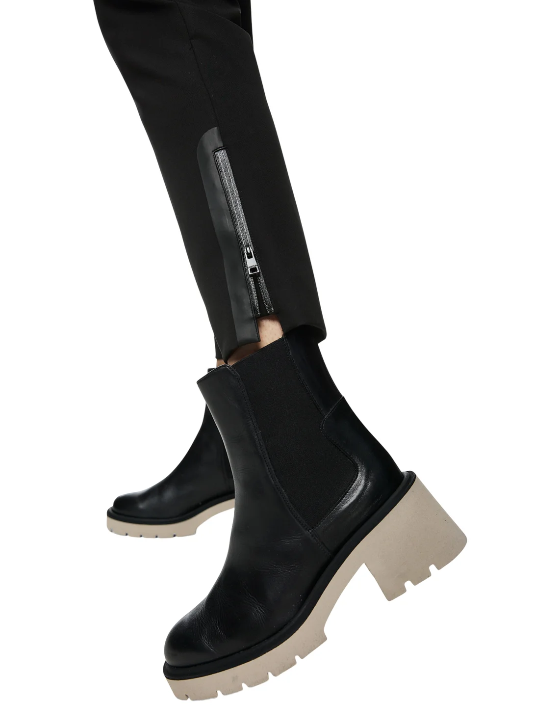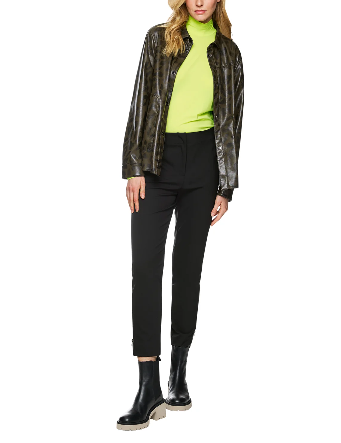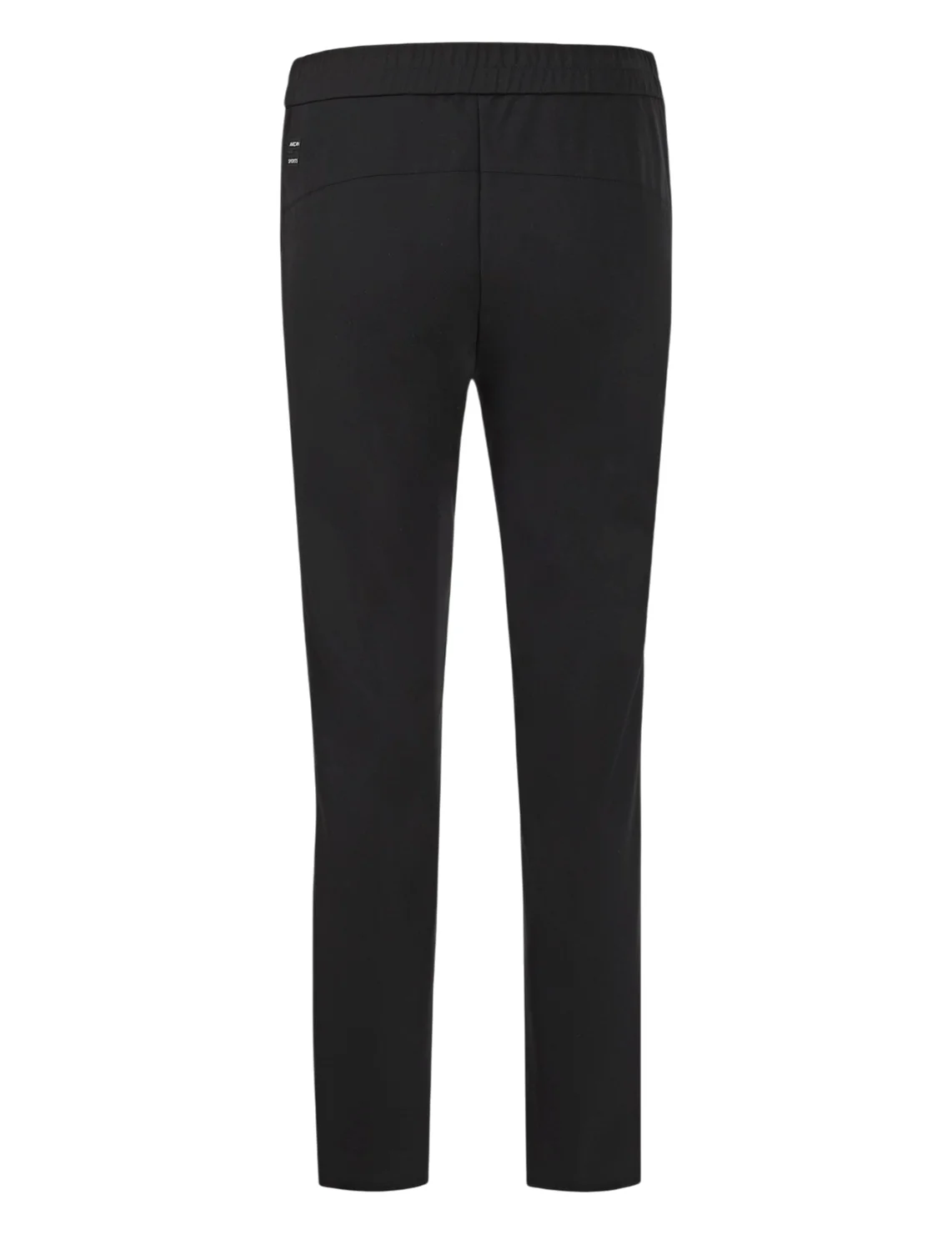 Брюки изготовлены из полиамида и эластана. Модель выполнена в зауженном крое. Имеет потайную застежку-молнию с крючком, эластичную вставку на поясе, разрезы на молнии и прорезные карманы.
