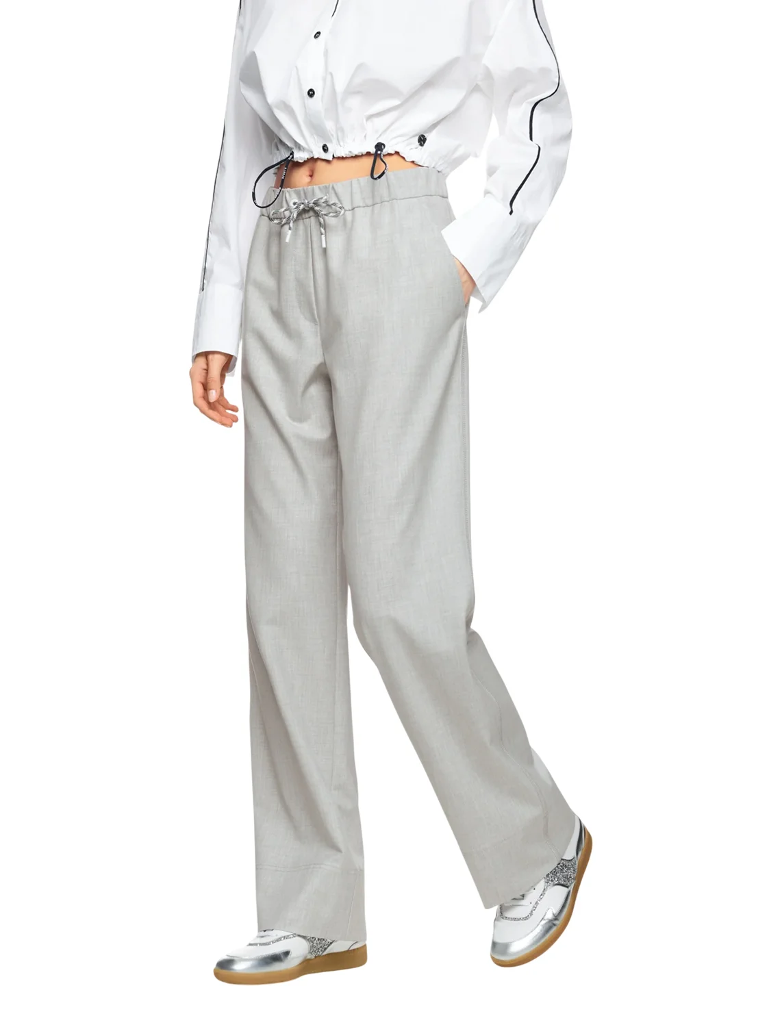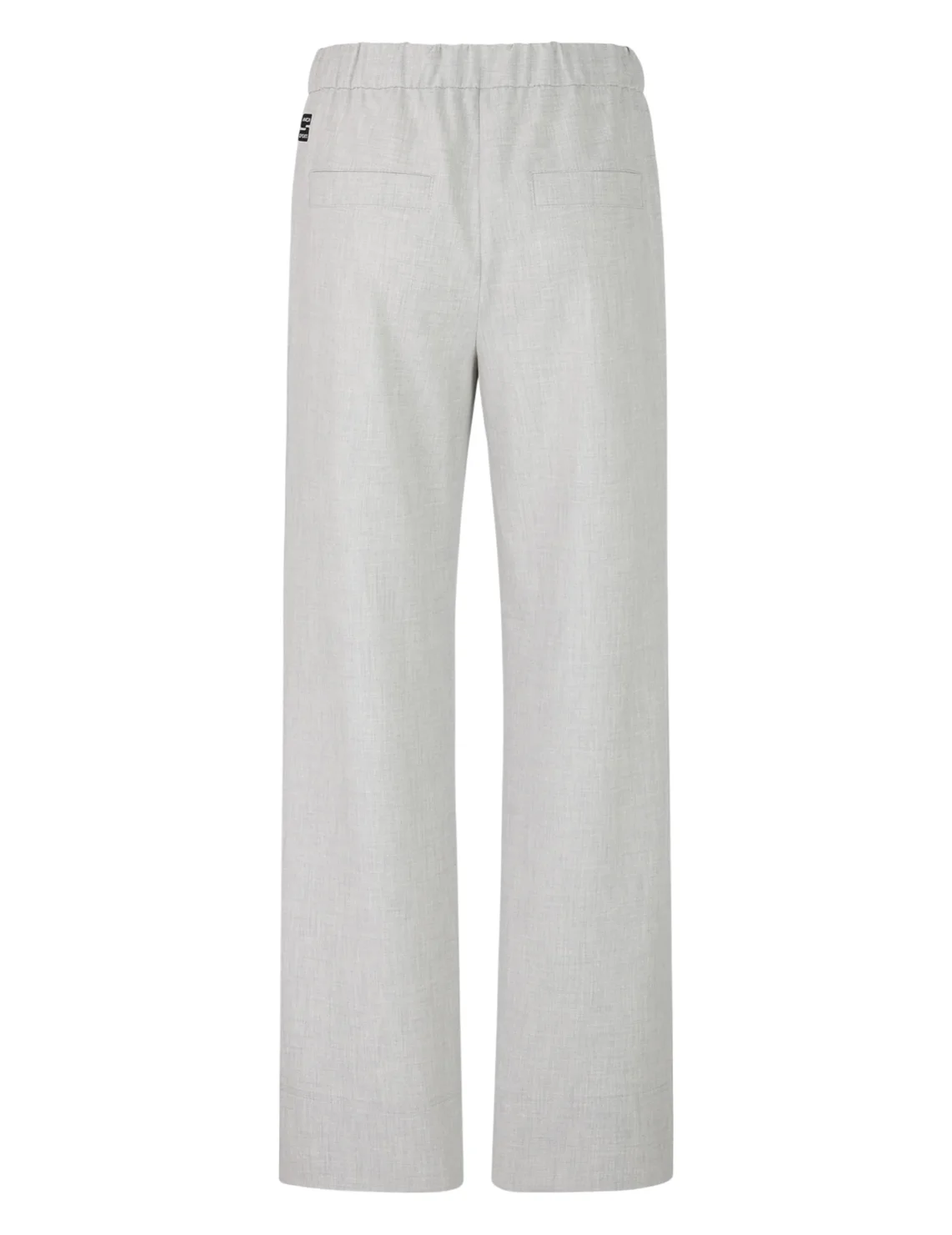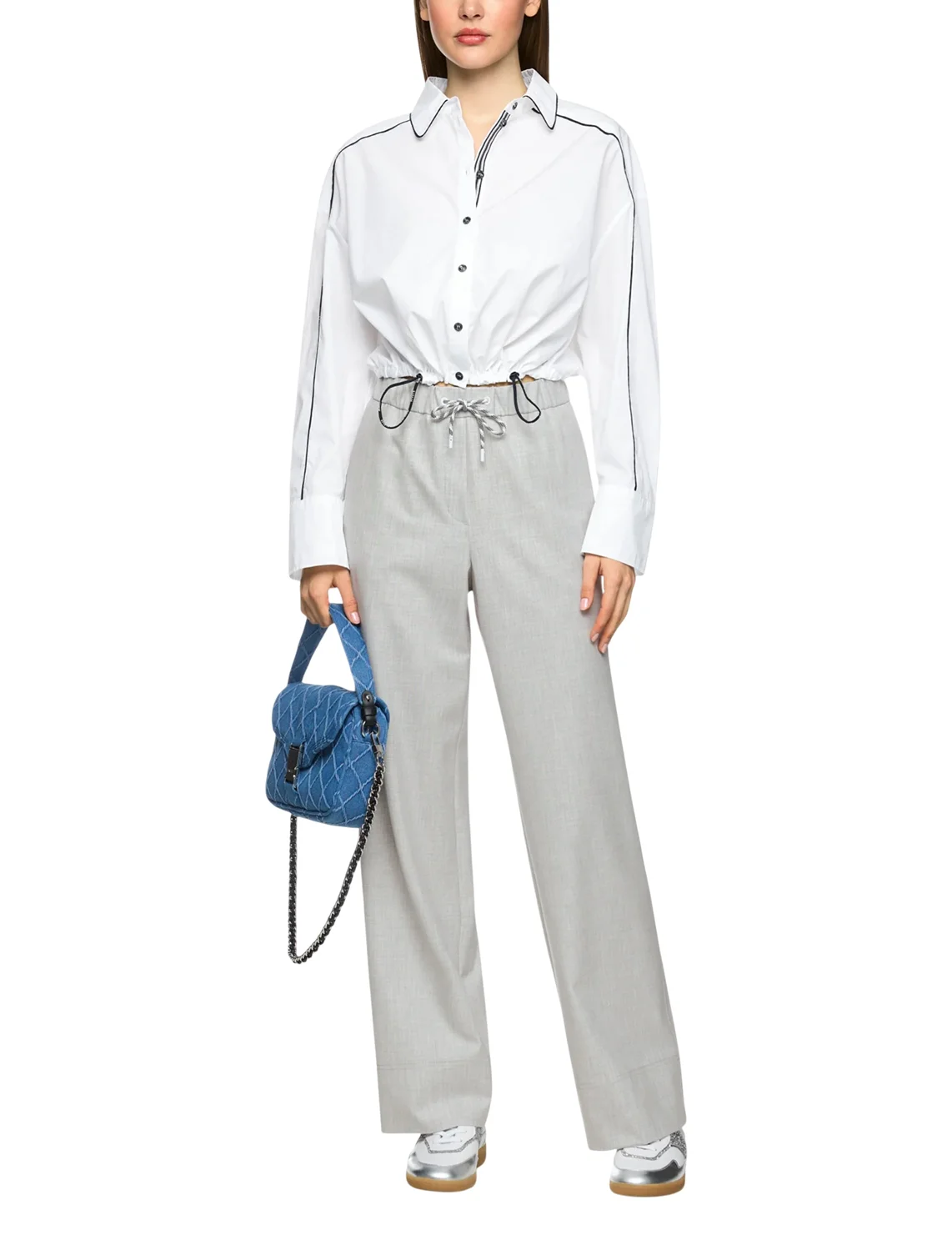 Брюки изготовлены из полиэстера, вискозы и эластана. Модель выполнена в свободном крое. Имеет эластичный пояс с кулиской, декоративный гульфик и прорезные карманы.