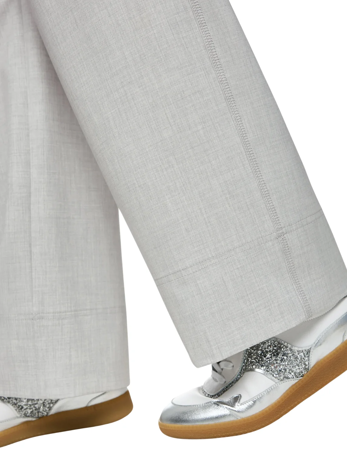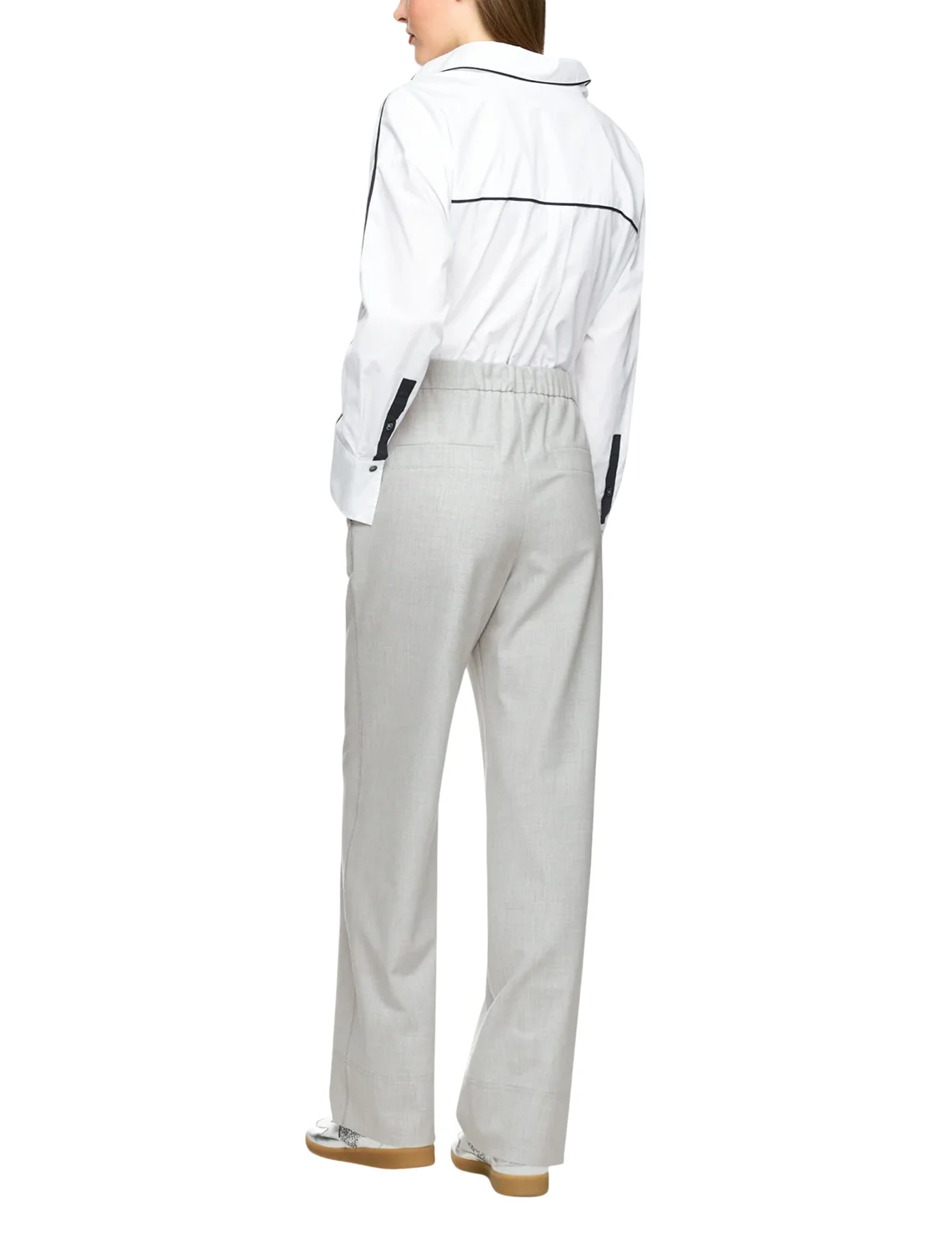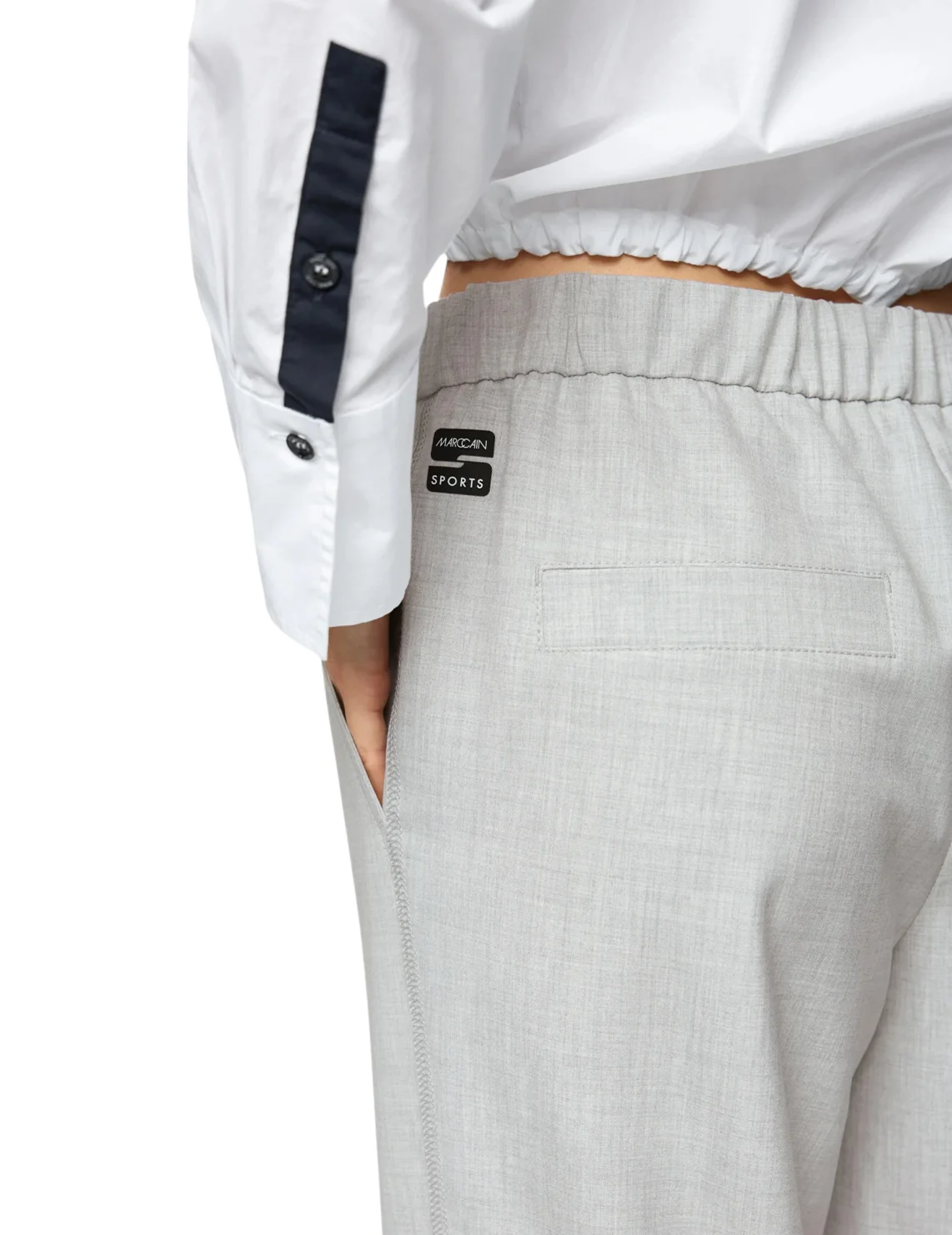 Брюки изготовлены из полиэстера, вискозы и эластана. Модель выполнена в свободном крое. Имеет эластичный пояс с кулиской, декоративный гульфик и прорезные карманы.