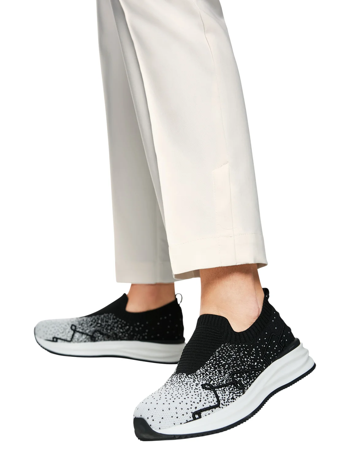 Брюки изготовлены из хлопка, полиэстера и эластана. Модель выполнена в зауженном крое. Имеет эластичный пояс, скрытую застежку-молнию с крючком и пуговицей, простроченные стрелки, разрезы снизу штанин, а также пару боковых и один задний прорезной карман.