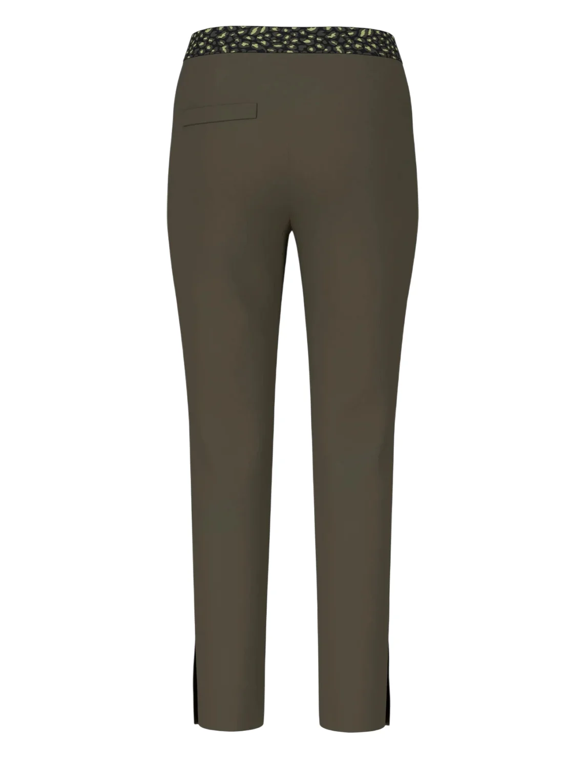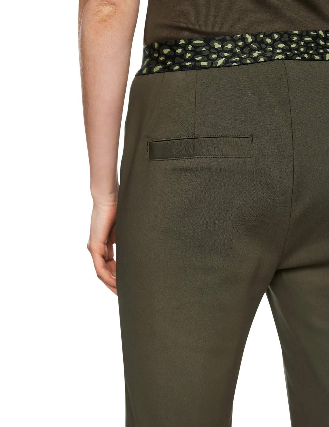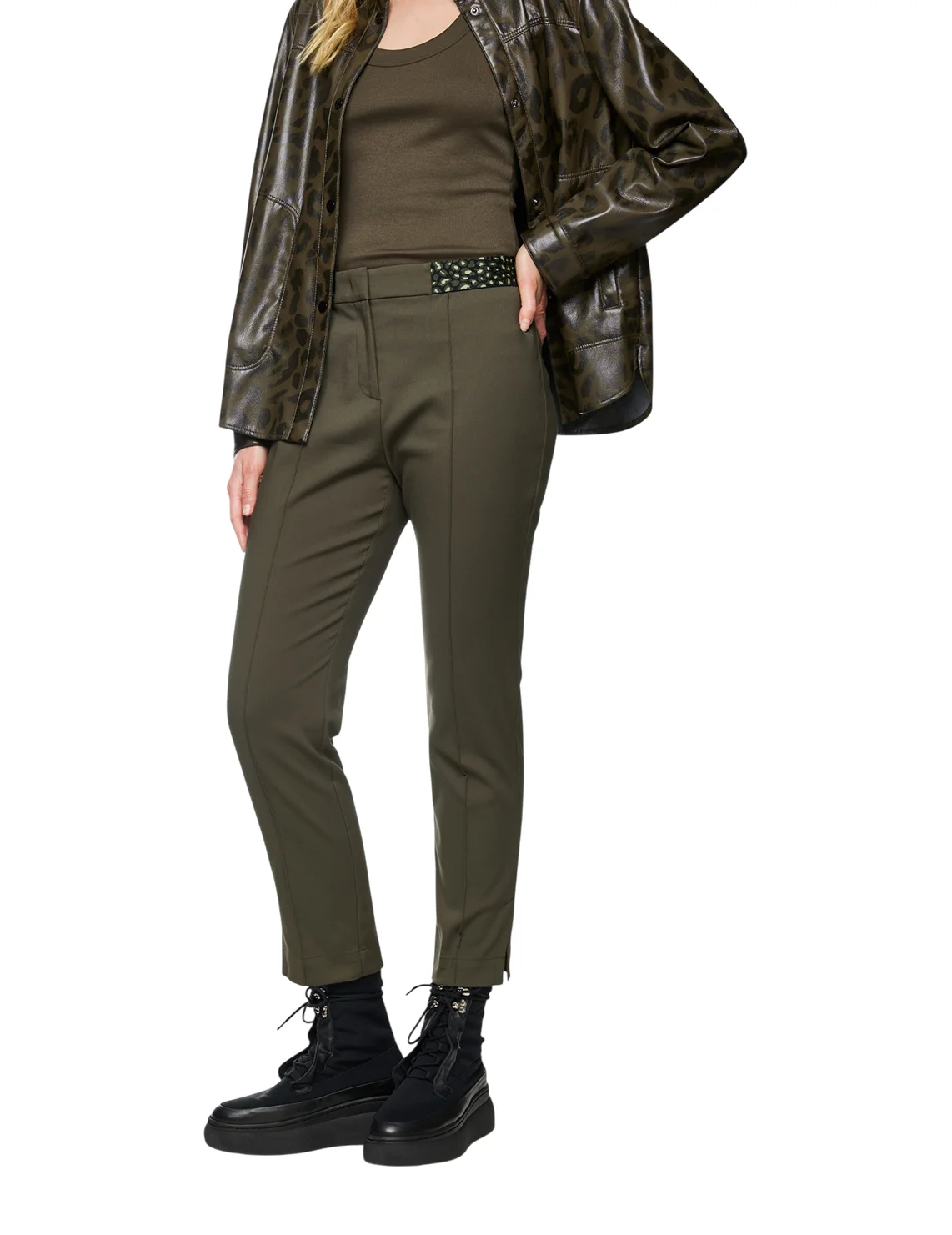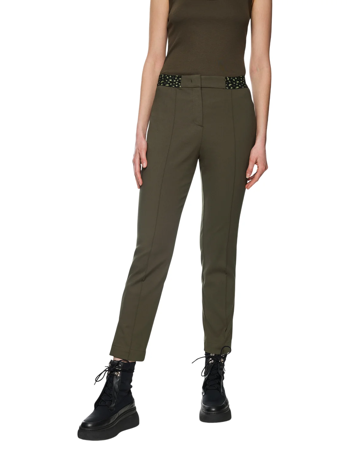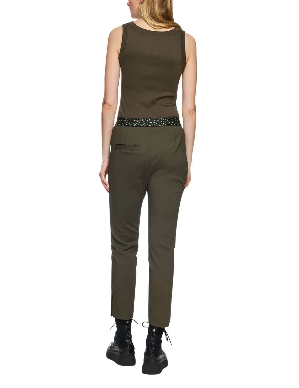 Брюки изготовлены из хлопка, полиэстера и эластана. Модель выполнена в зауженном крое. Имеет эластичный пояс, скрытую застежку-молнию с крючком и пуговицей, простроченные стрелки, разрезы снизу штанин, а также пару боковых и один задний прорезной карман. Пояс декорирован анималистичным принтом.