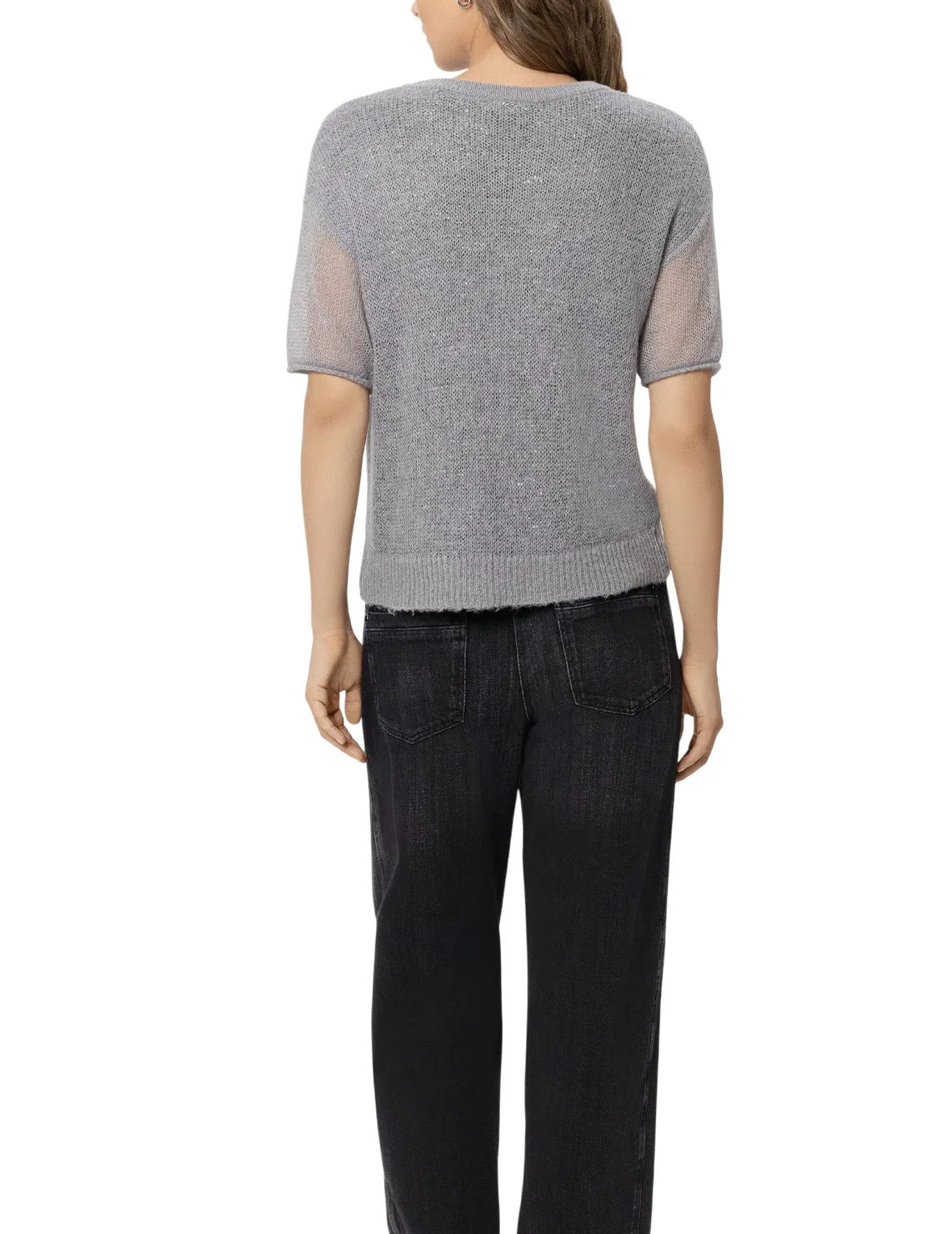 Джемпер изготовлен из полиэстера, полиамида, лиоцелла и шерсти. Модель выполнена в прямом крое. Имеет круглый вырез горловины и короткие рукава. Декорирован пайетками.