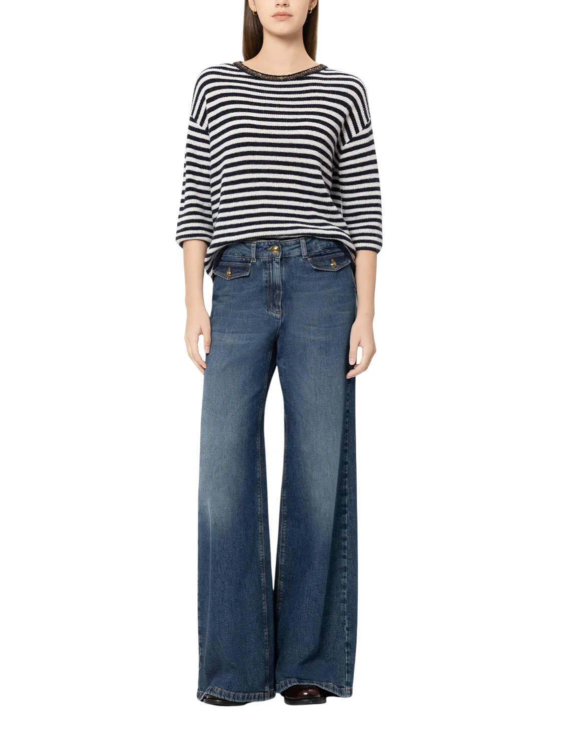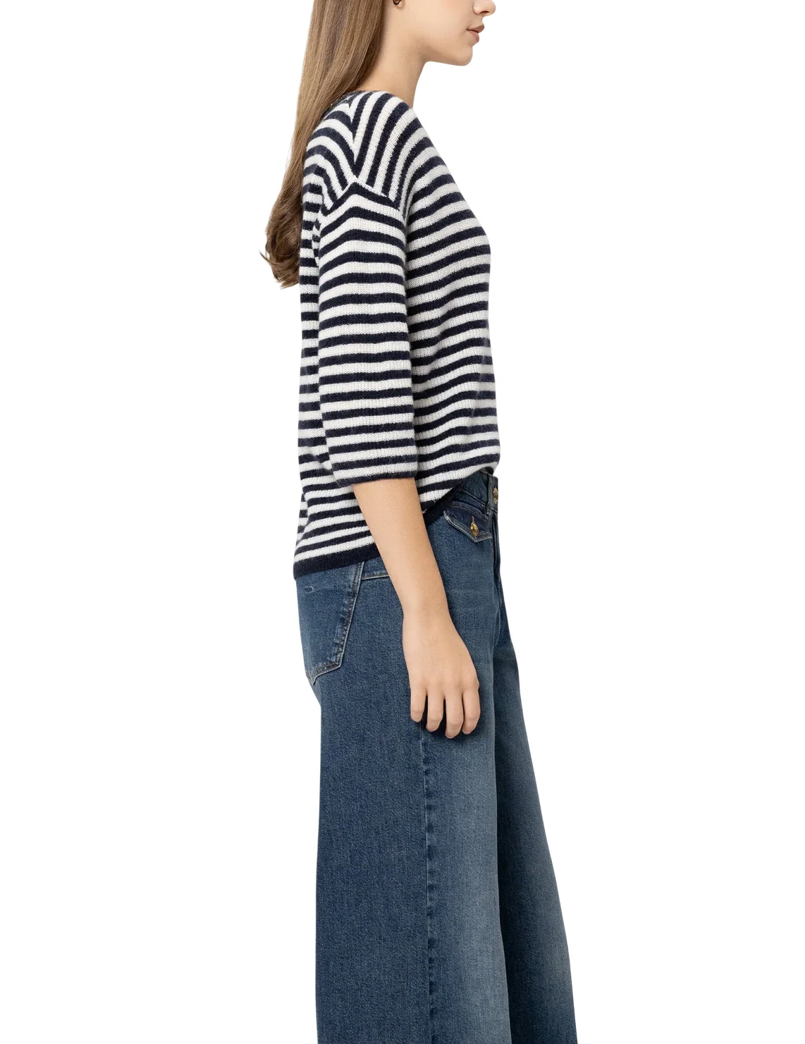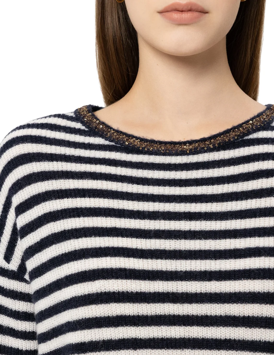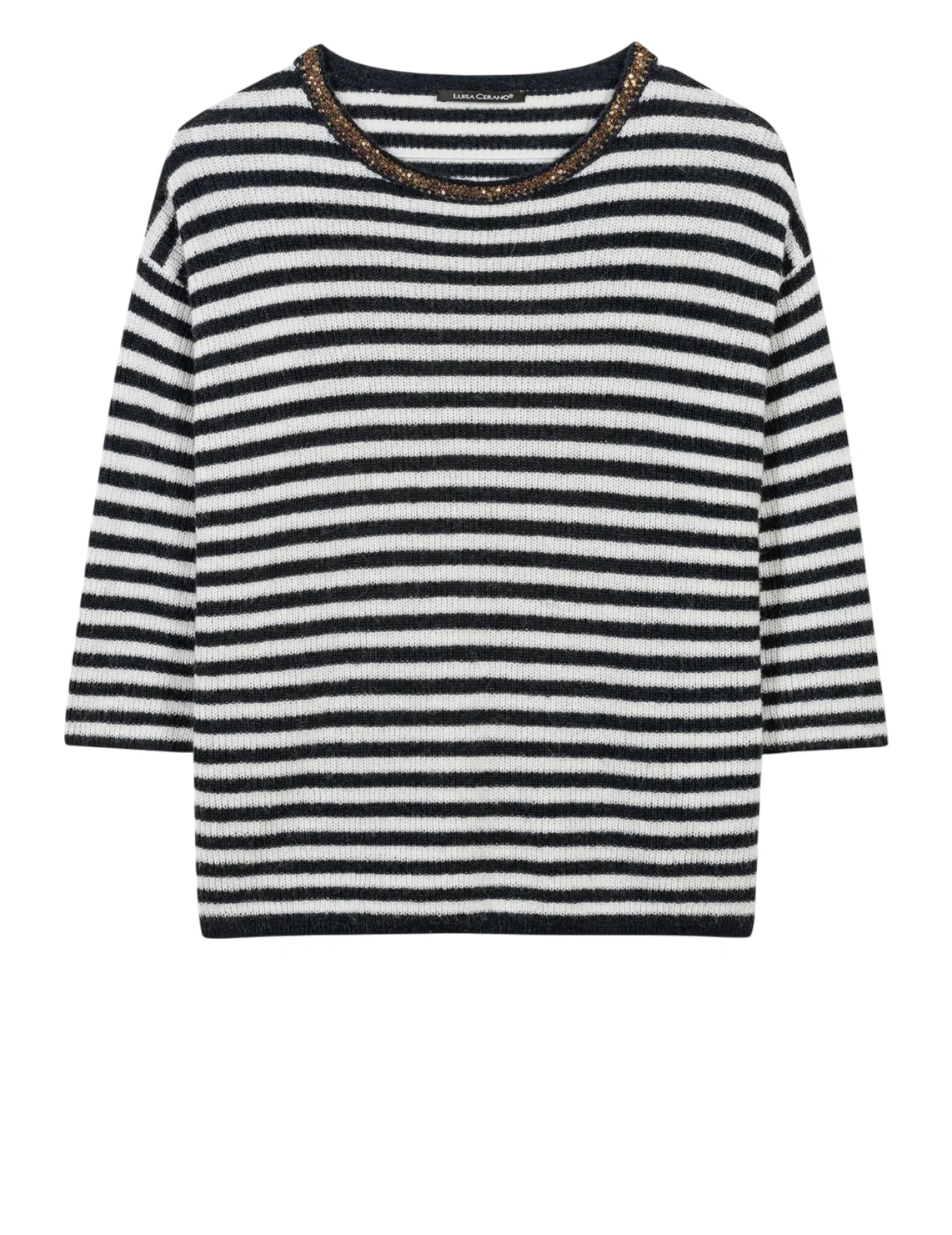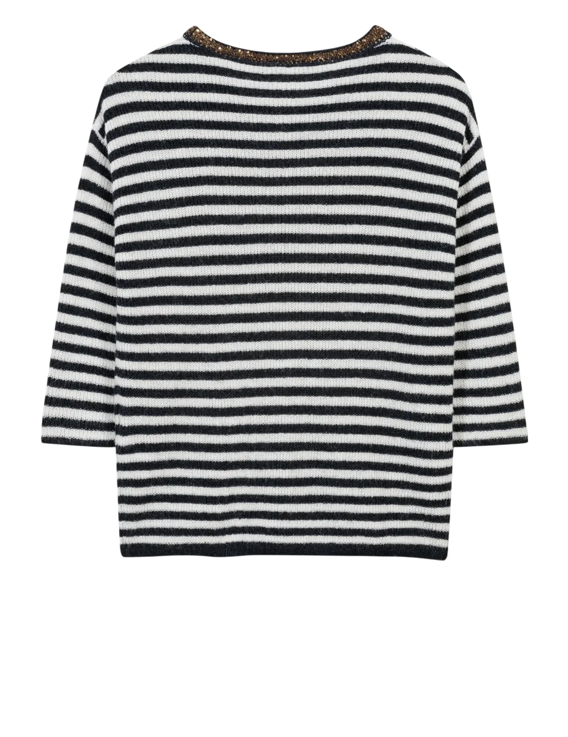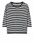 Джемпер изготовлен из полиамида, лиоцелла, шерсти и альпаки. Модель выполнена в свободном крое. Имеет круглый вырез горловины, заниженную плечевую линию и рукава длиной 3/4 с манжетами. Декорирован принтом в полоску и пайетками.