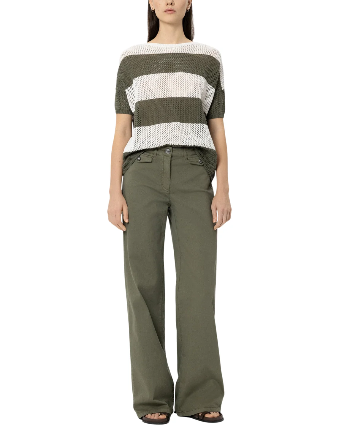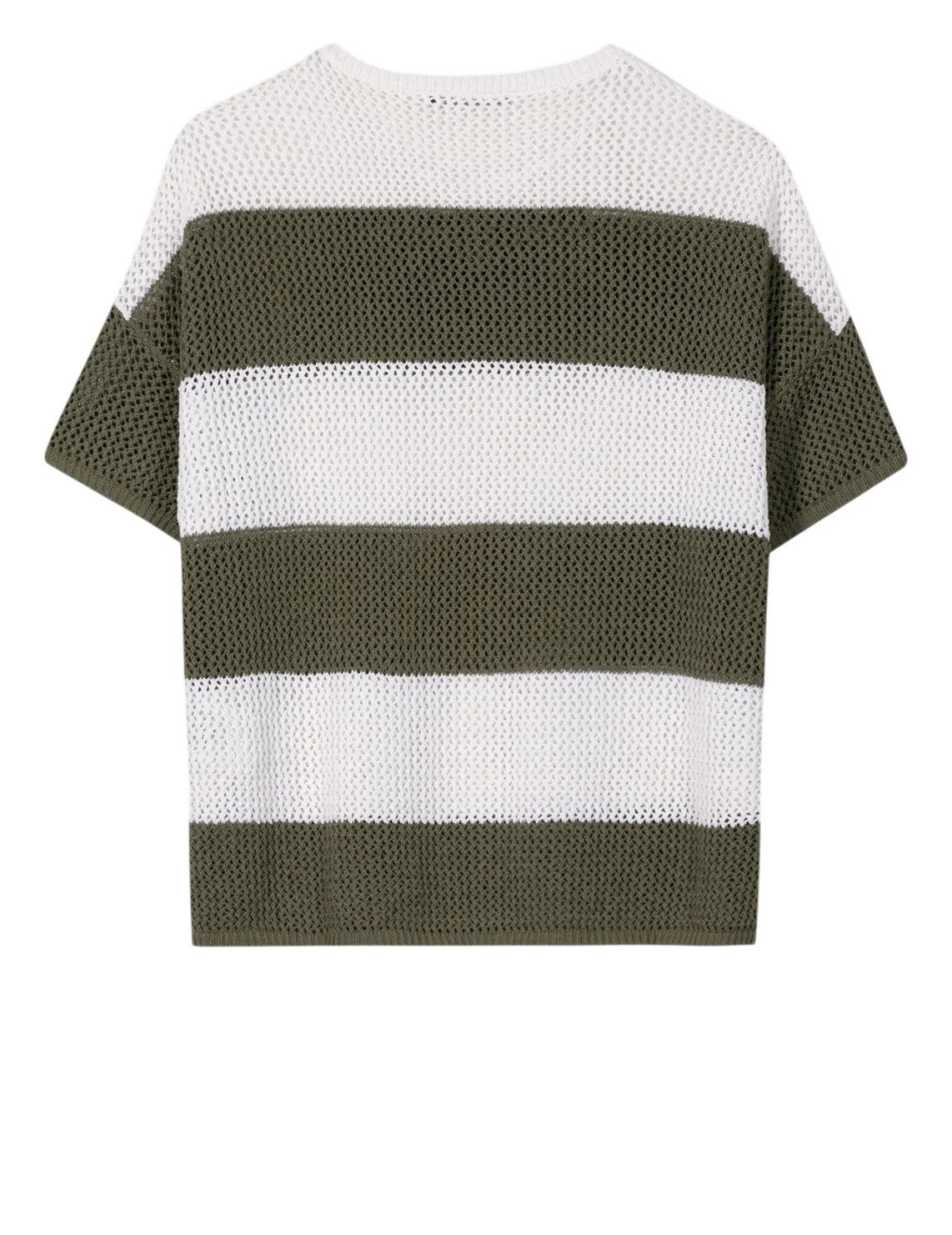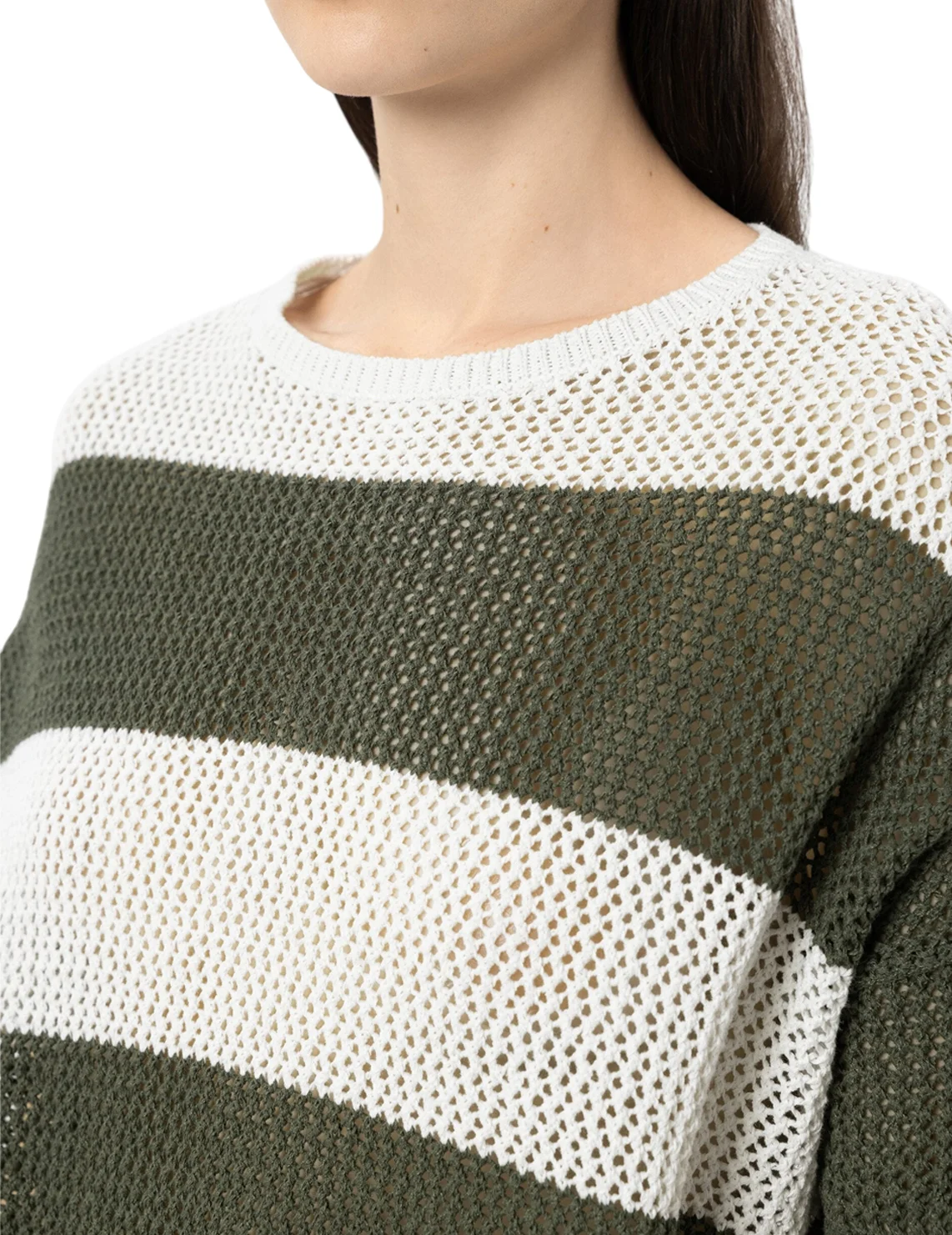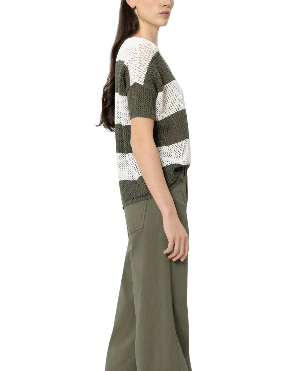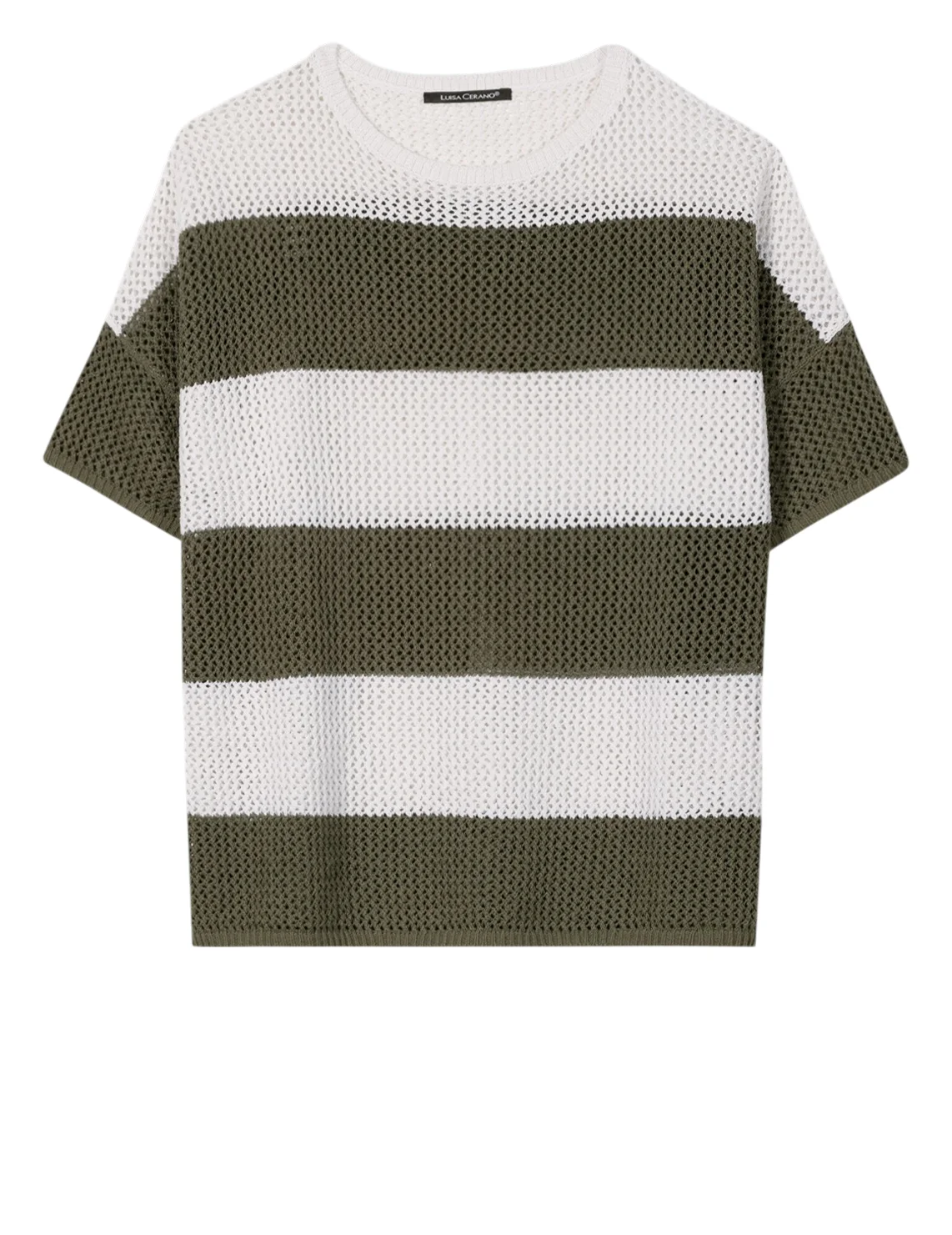 Джемпер изготовлен из льна, хлопка и полиамида. Модель выполнена в свободном крое. Имеет круглый вырез горловины, короткие рукава с манжетами. Декорированный принтом в широкую полоску.