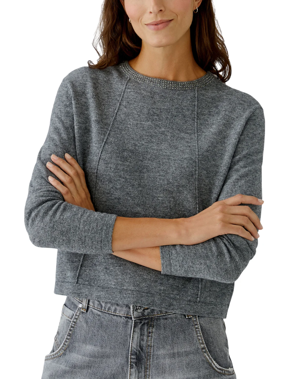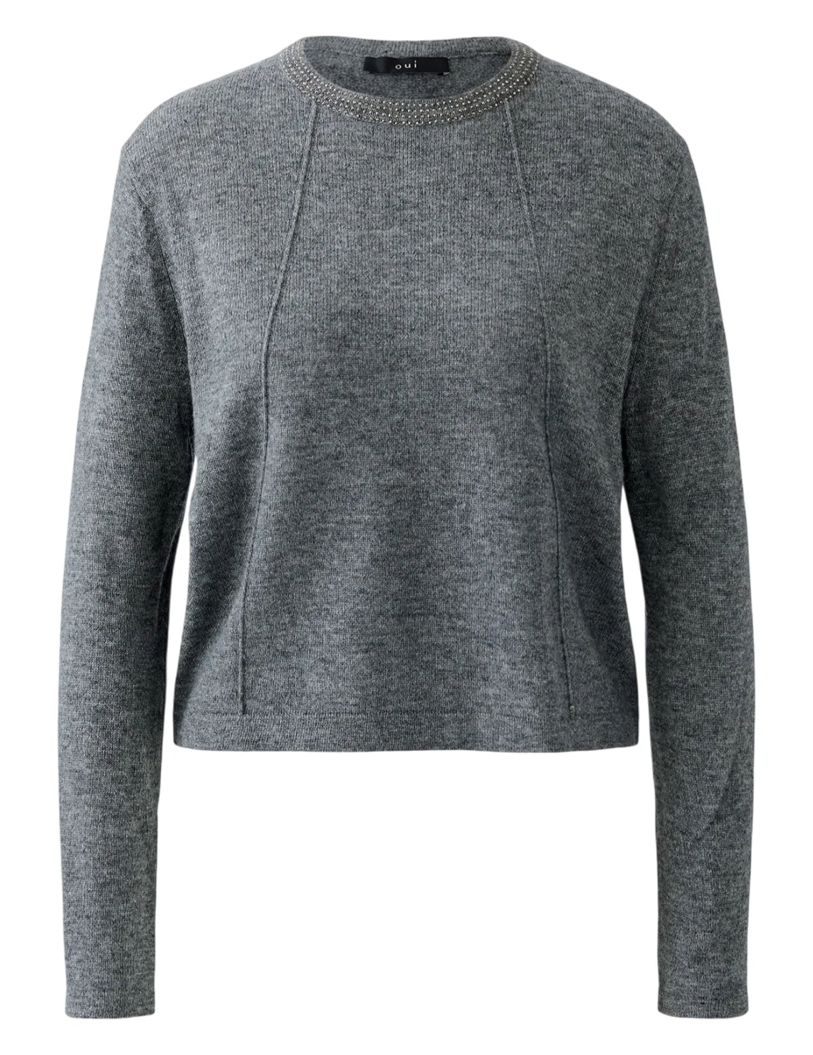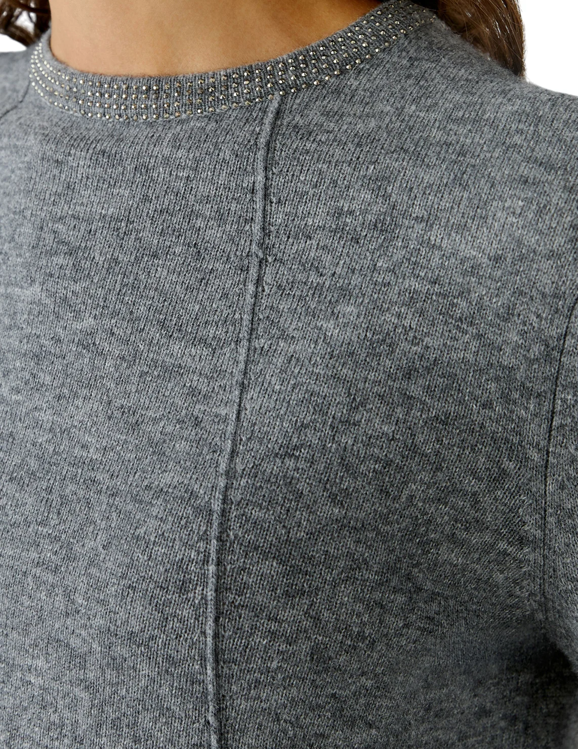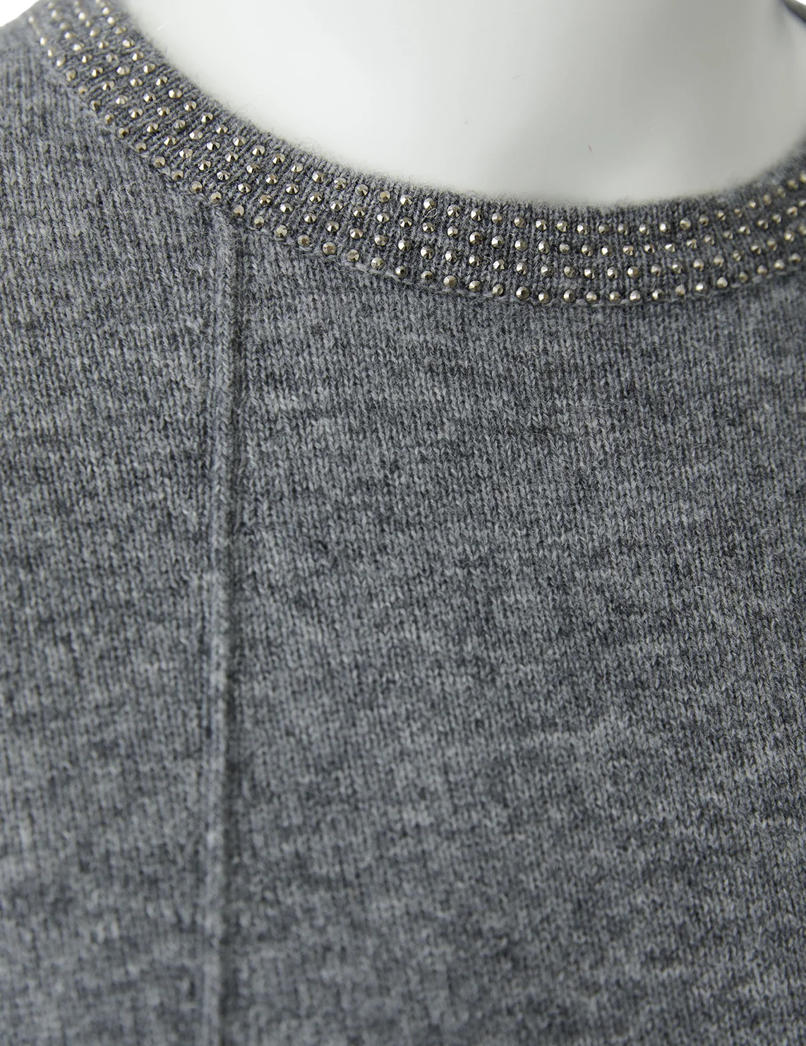Джемпер изготовлен из шерсти, полиамида и полиакрила. Модель выполнена в прямом крое. Имеет круглый вырез горловины и длинные рукава с манжетами. Декорирован стразами.