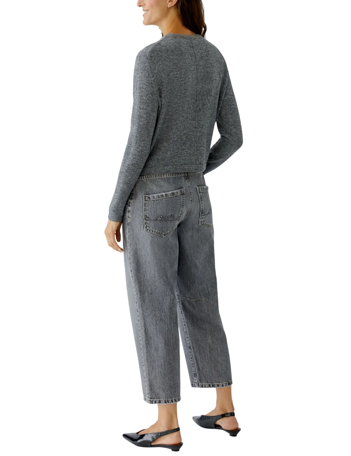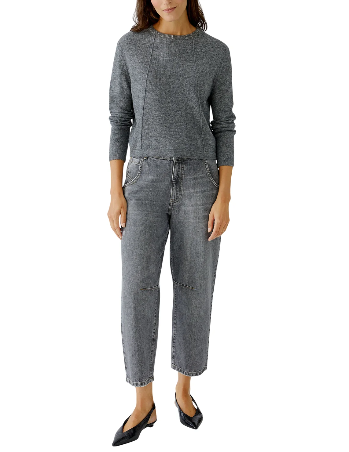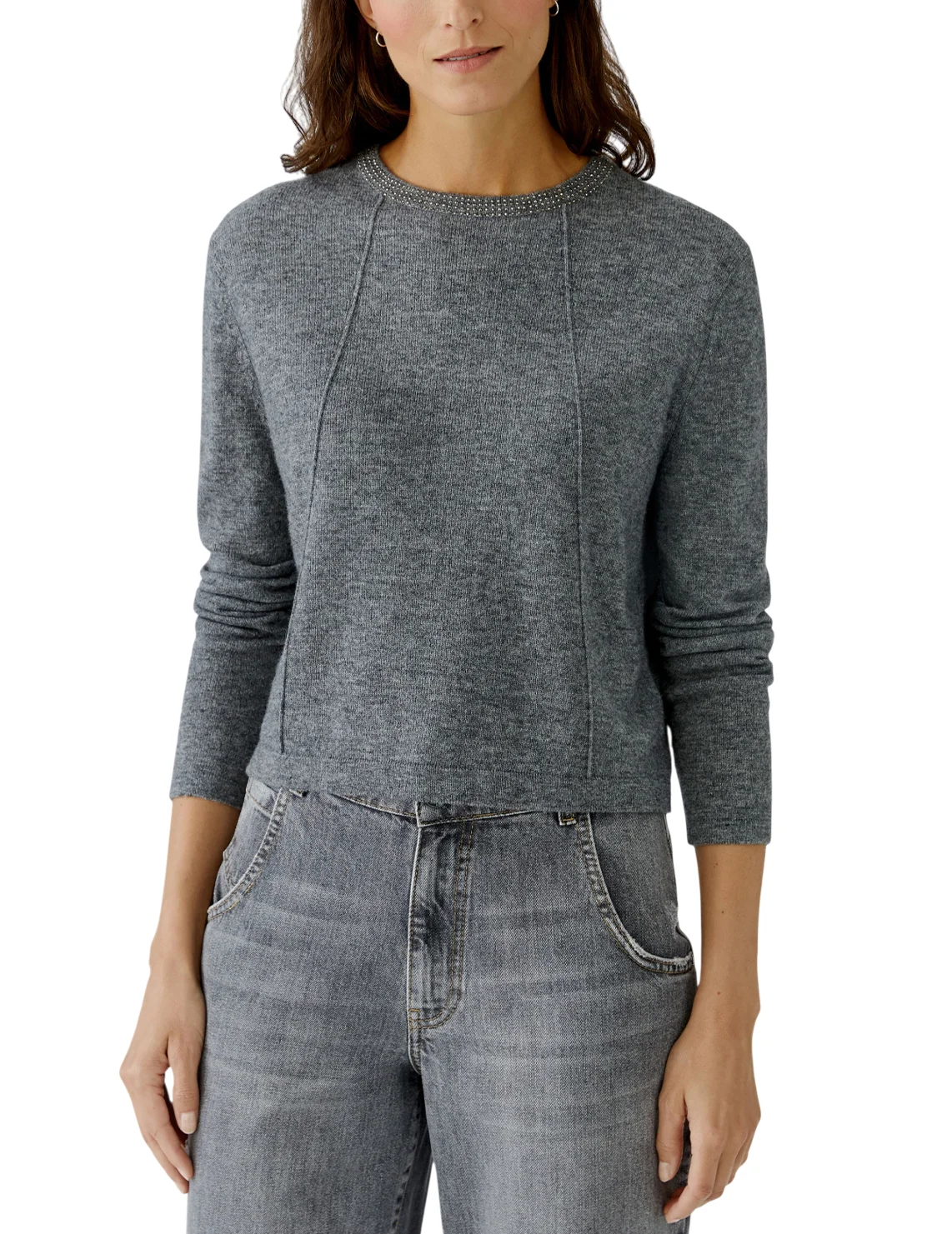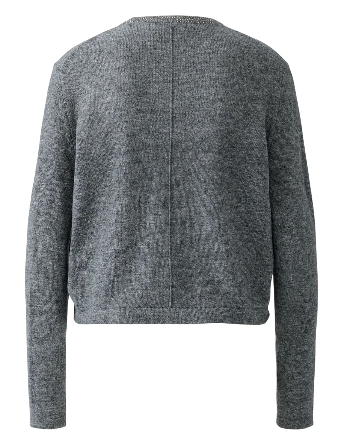 Джемпер изготовлен из шерсти, полиамида и полиакрила. Модель выполнена в прямом крое. Имеет круглый вырез горловины и длинные рукава с манжетами. Декорирован стразами.