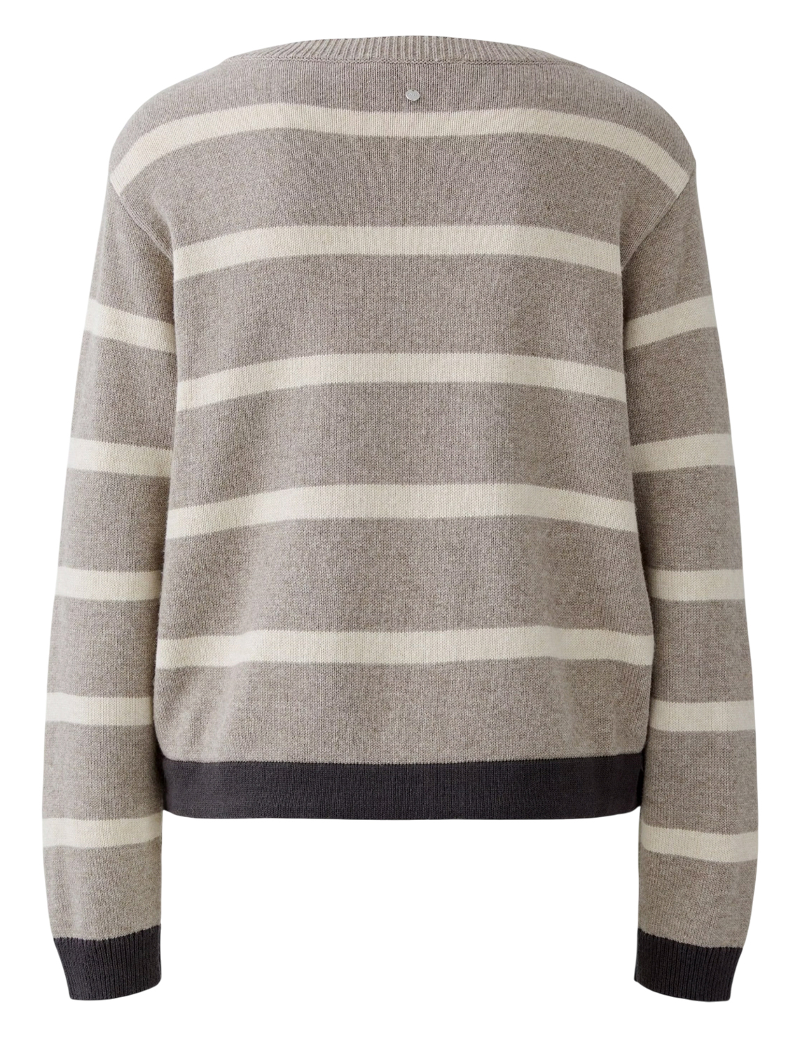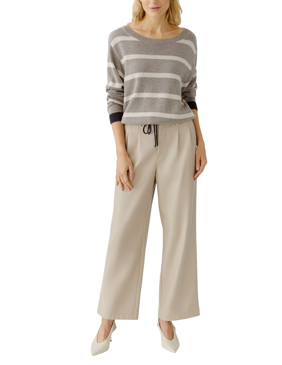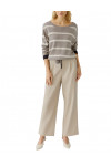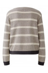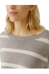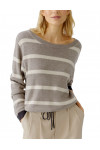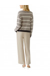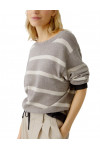 Джемпер изготовлен из акрила, хлопка и вискозы. Модель выполнена в свободном крое. Имеет круглый вырез горловины, заниженную плечевую линию, кулиску и длинные рукава с манжетами. Декорирована принтом в полоску.