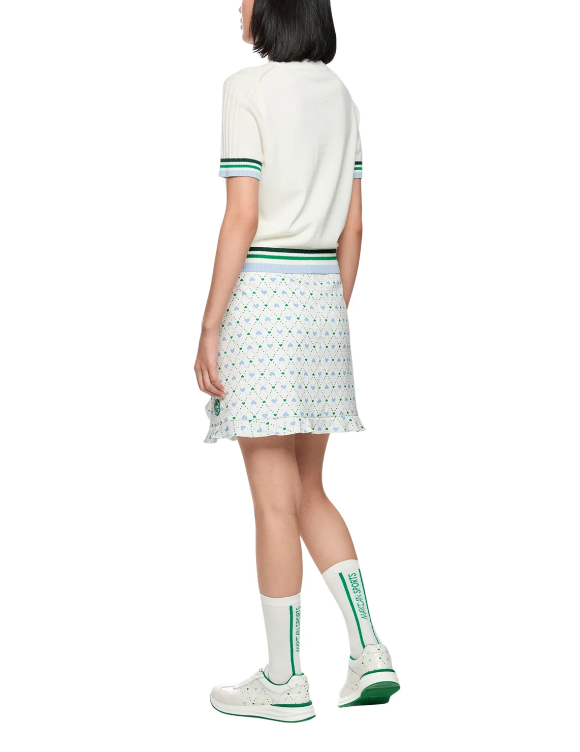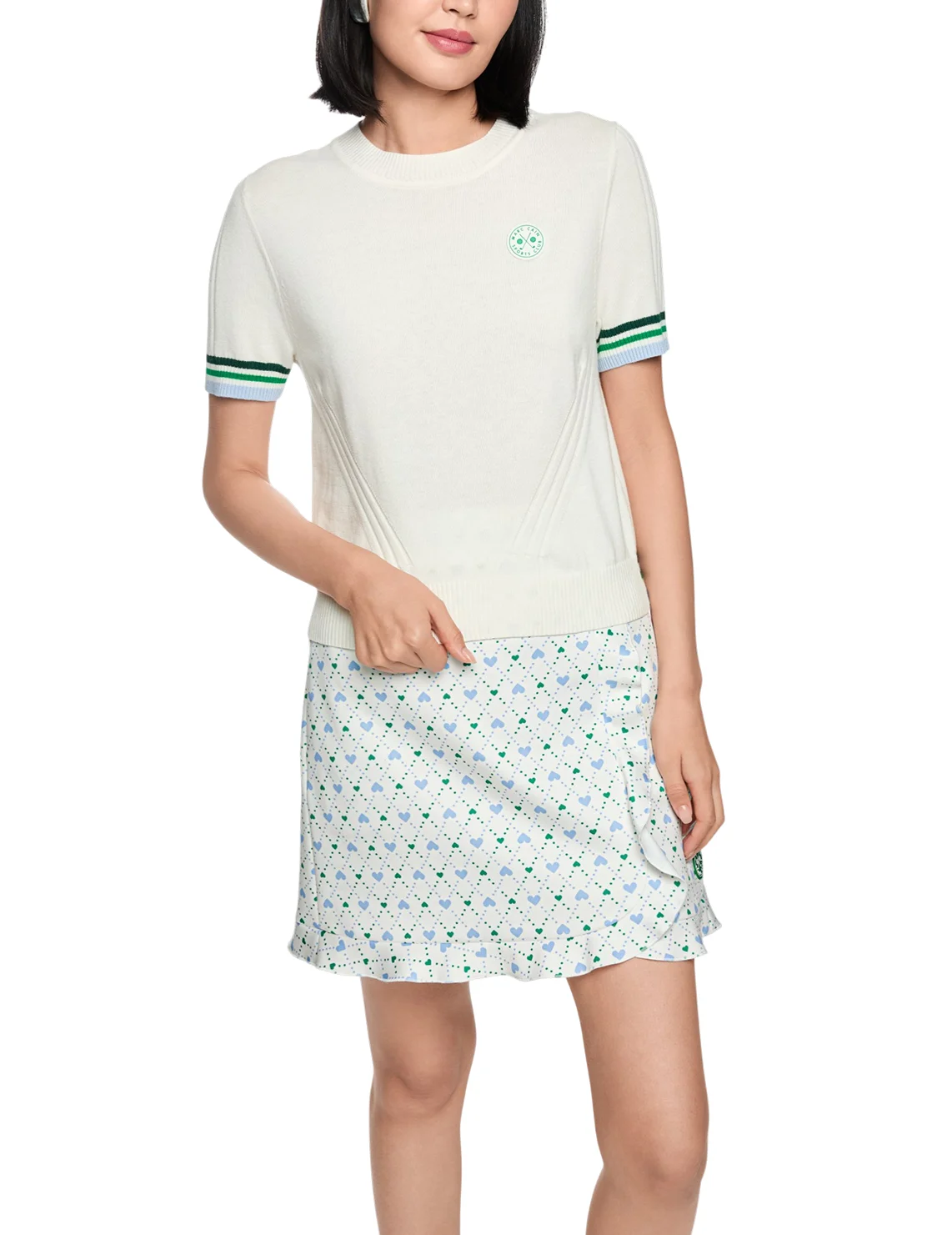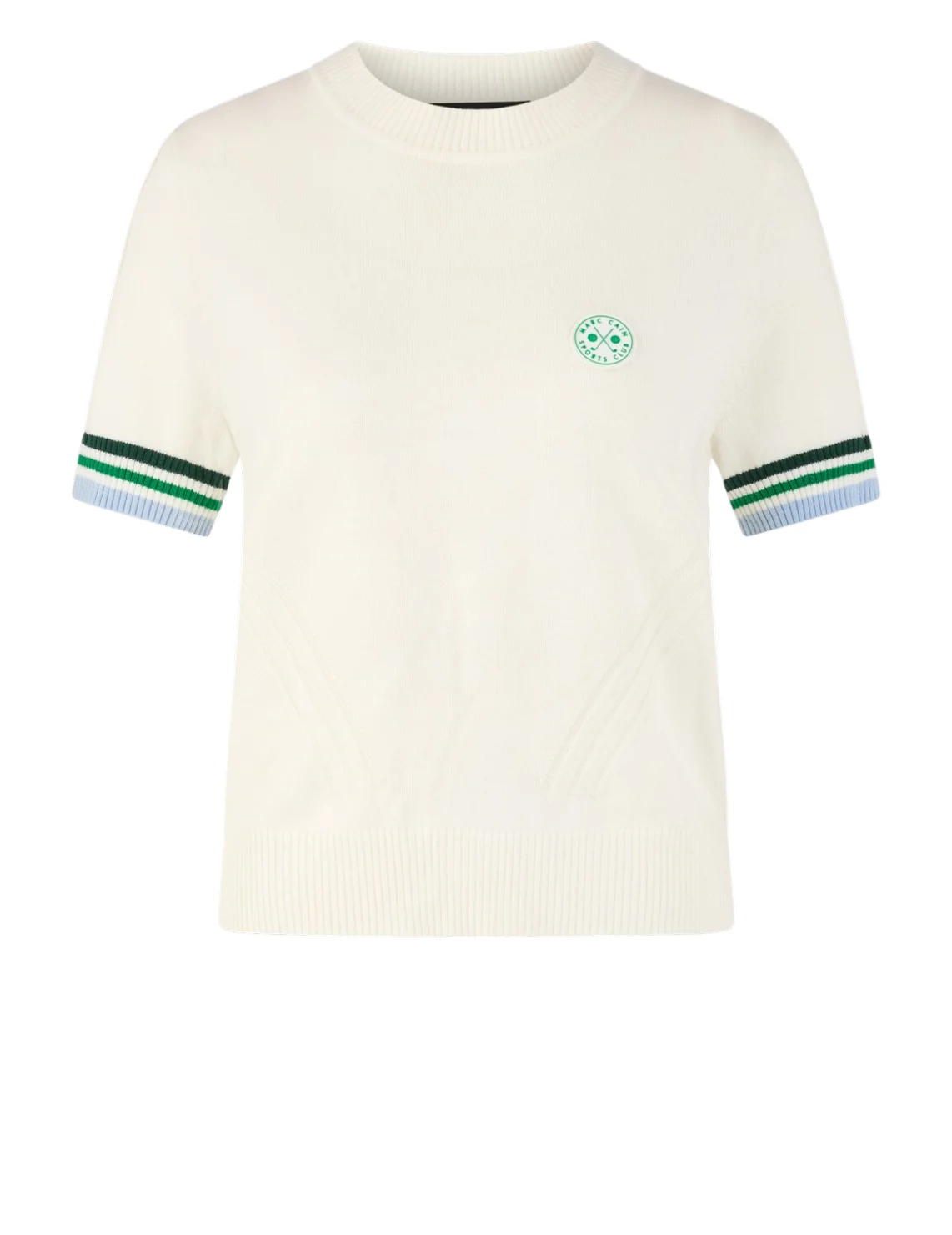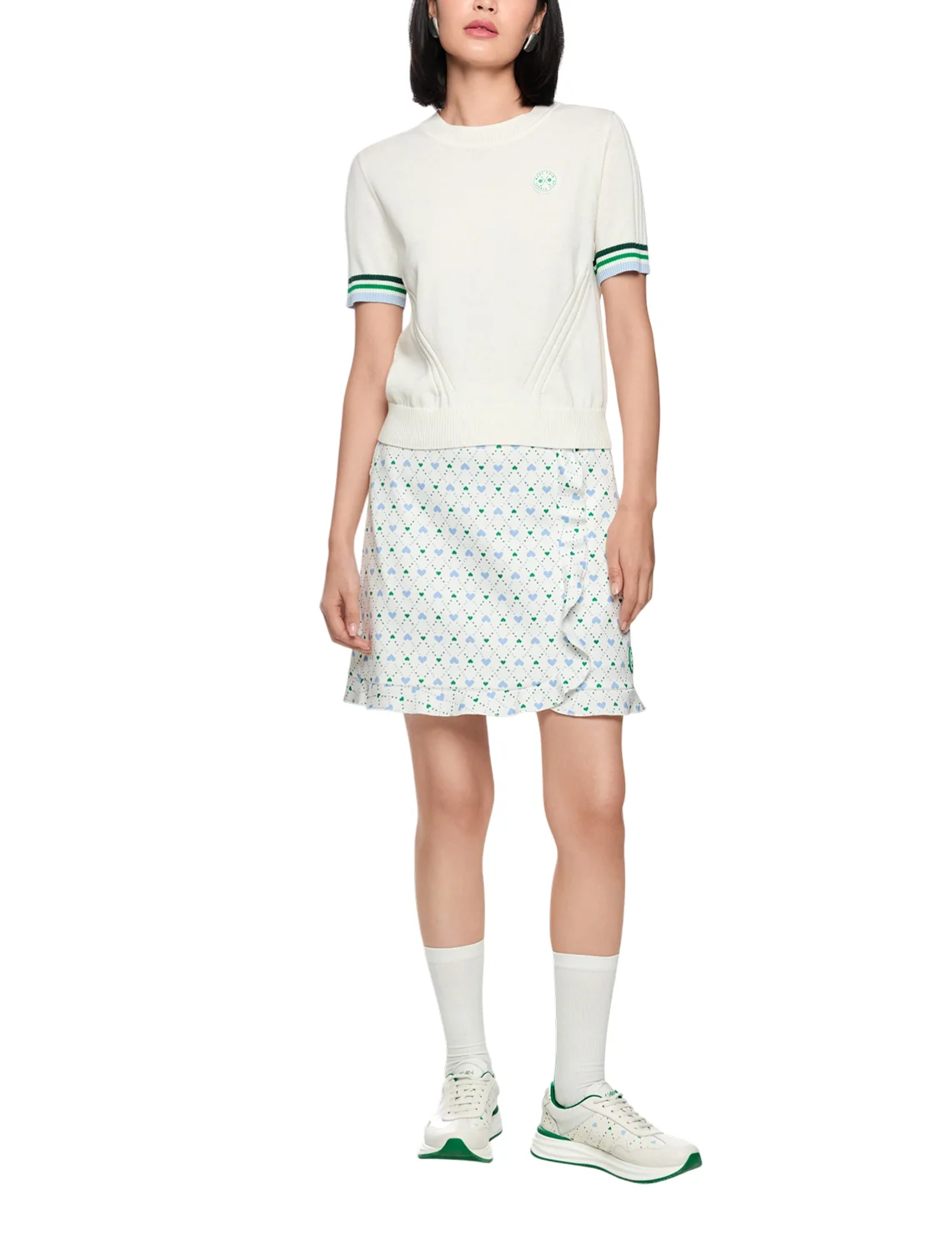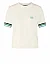 Джемпер изготовлен из хлопка и шерсти. Модель выполнена в прямом крое. Имеет круглый вырез горловины и короткие рукава с манжетами. Декорирован принтом в полоску и нашивкой с логотипом бренда.