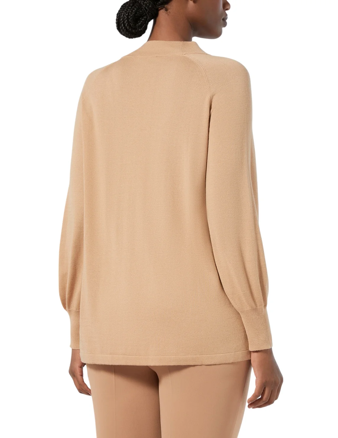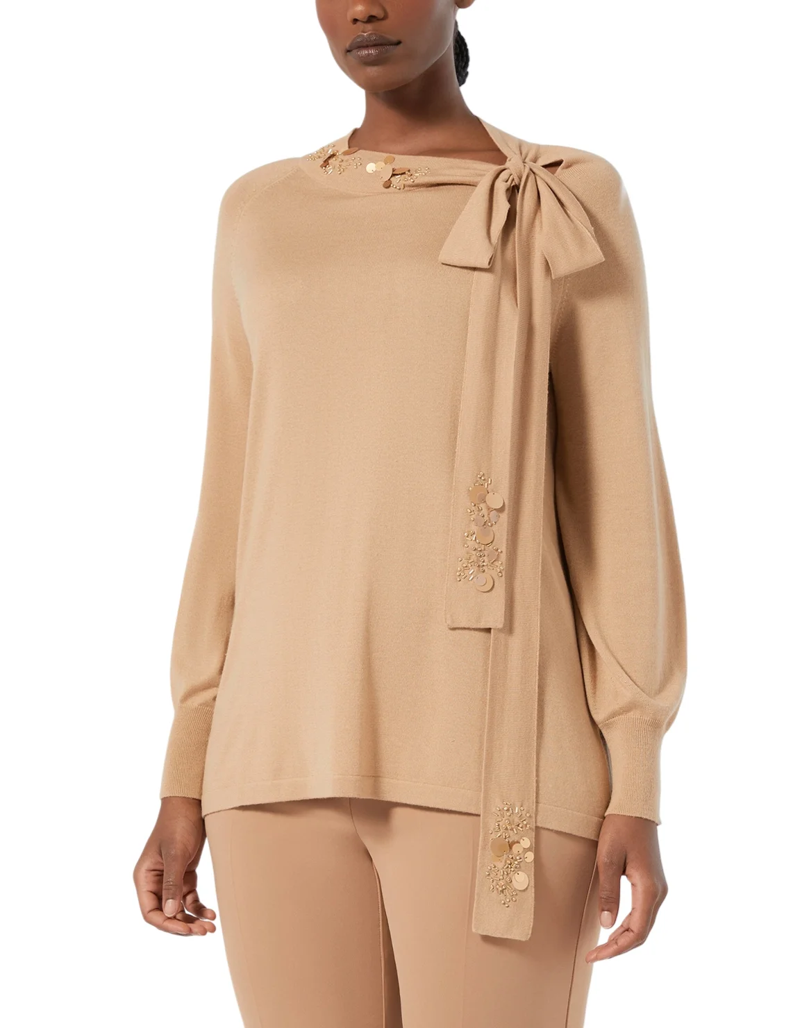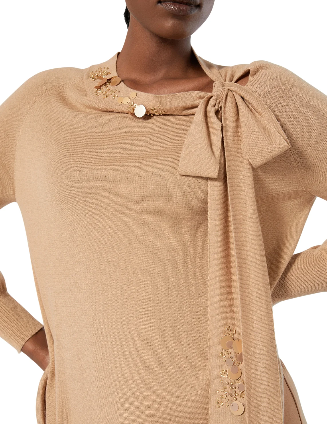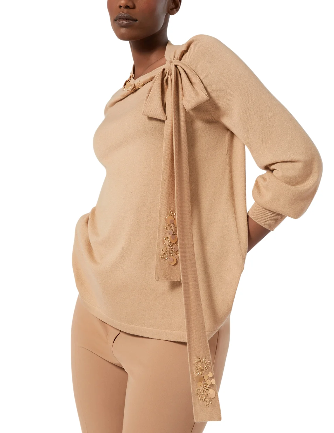 Джемпер изготовлен из вискозы, полиамида, шерсти, модала и кашемира. Модель выполнена в прямом крое. Имеет круглый вырез горловины и длинные рукава с манжетами. Декорирован бисером и пайетками, а также бантом.