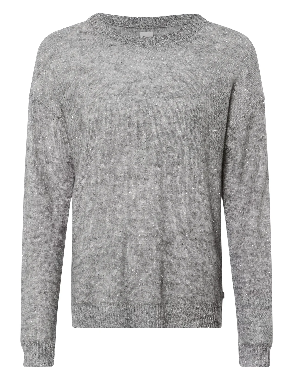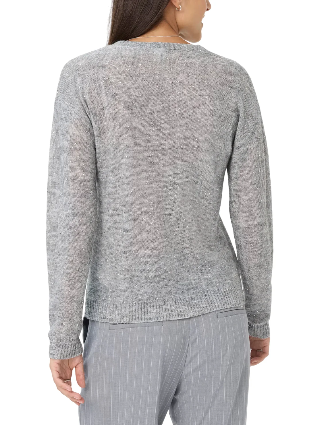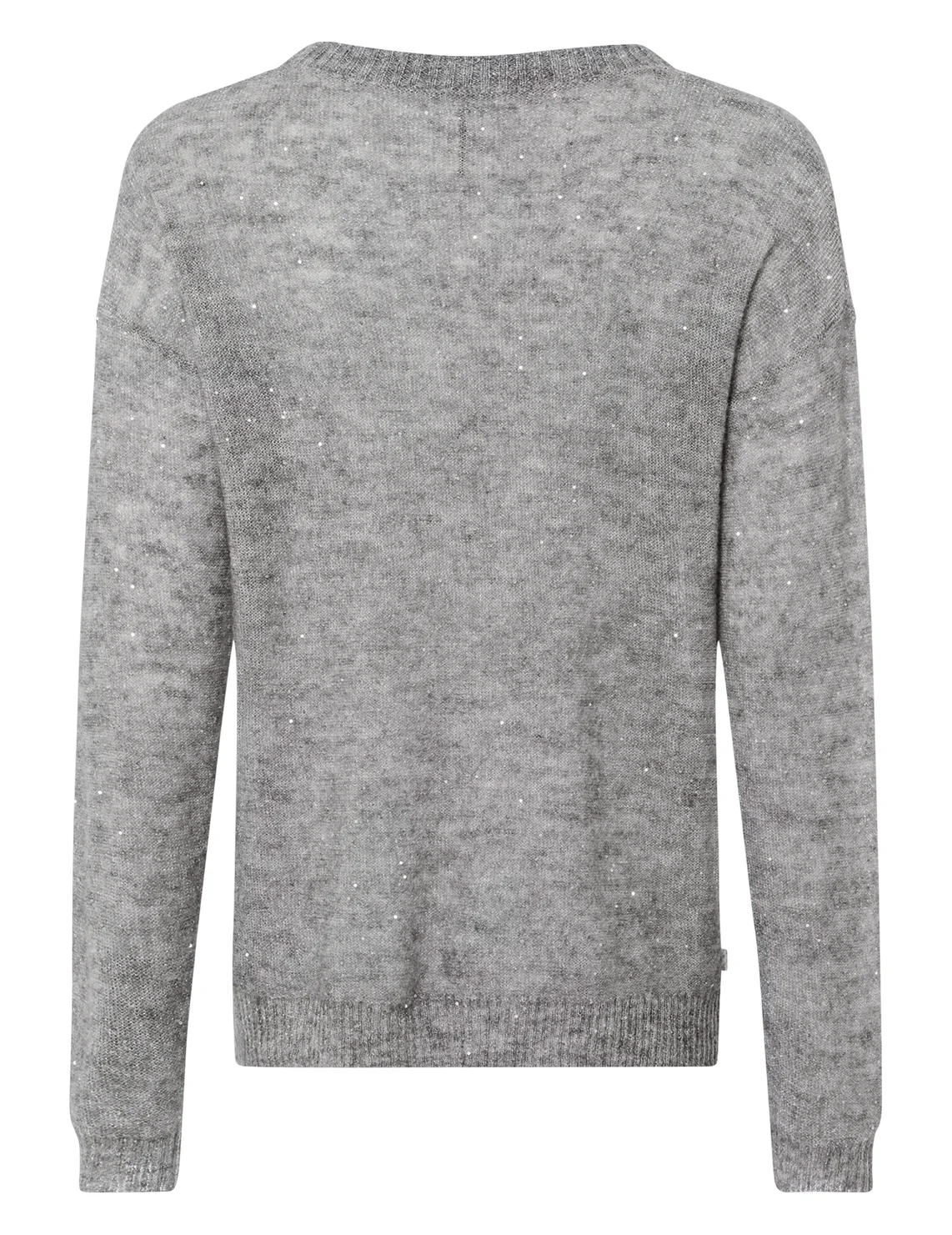 Джемпер изготовлен из шерсти, полиамида, полиэстера и альпаки. Модель выполнена в прямом крое. Имеет круглый вырез горловины, заниженную плечевую линию и длинные рукава с манжетами. Декорирован пайетками.