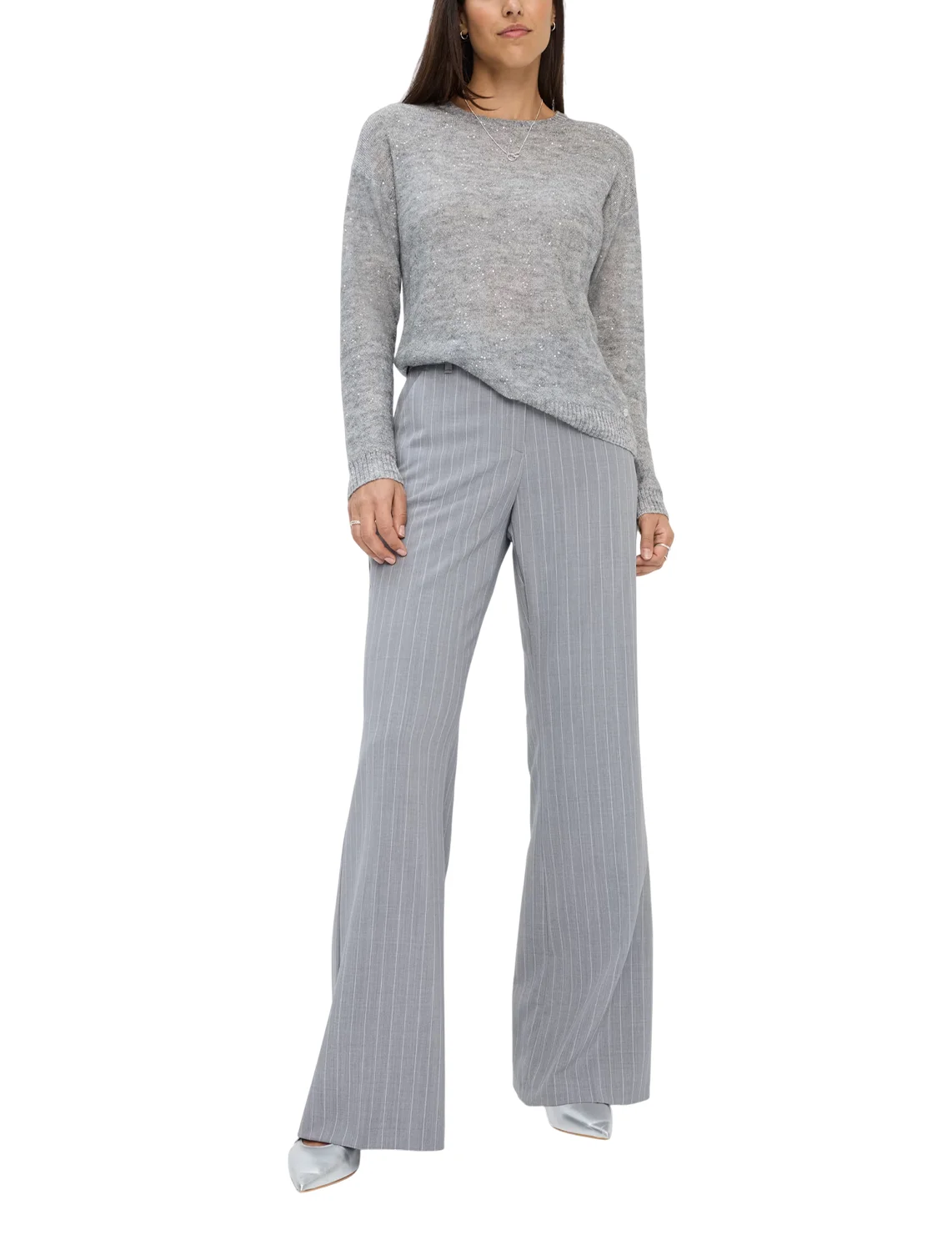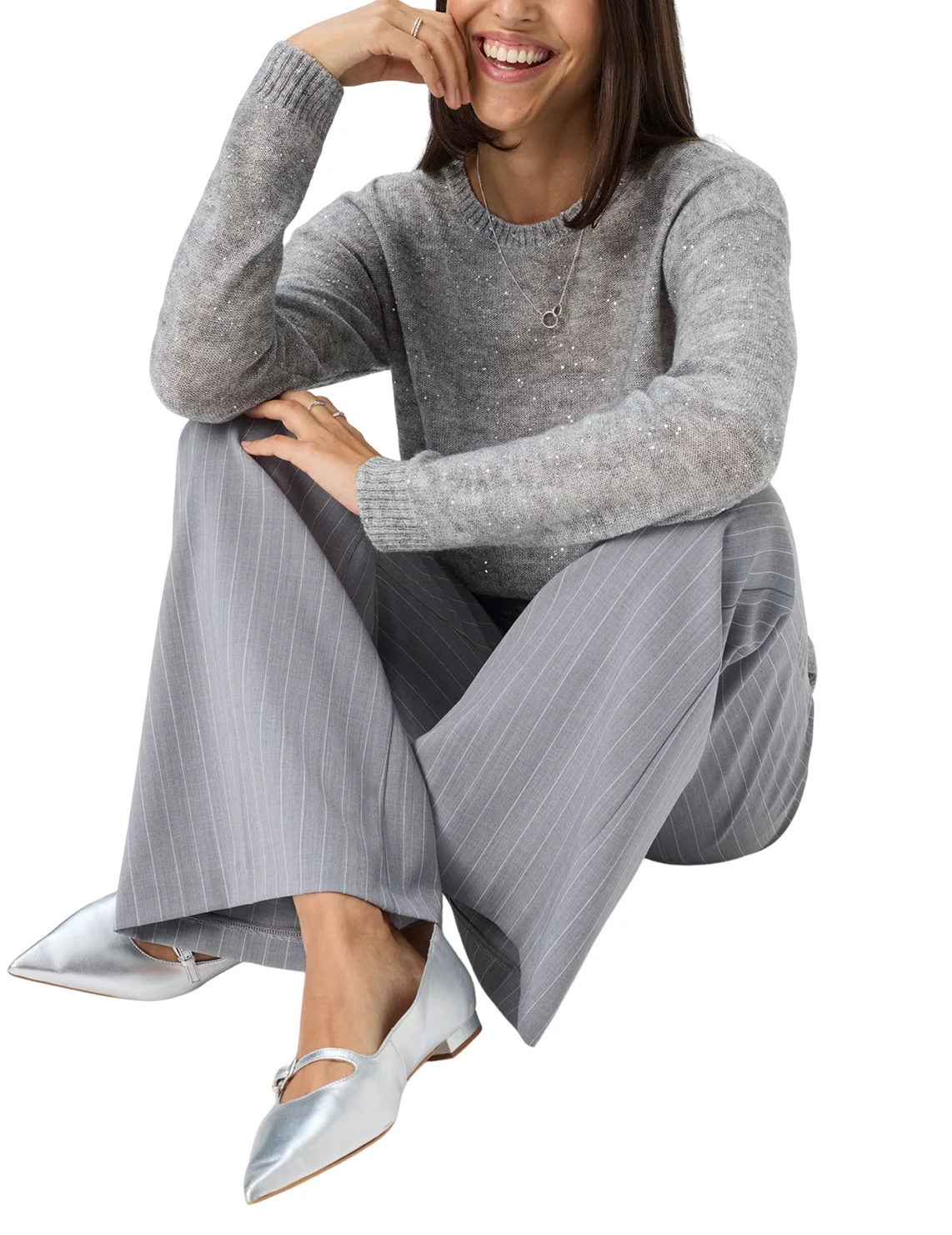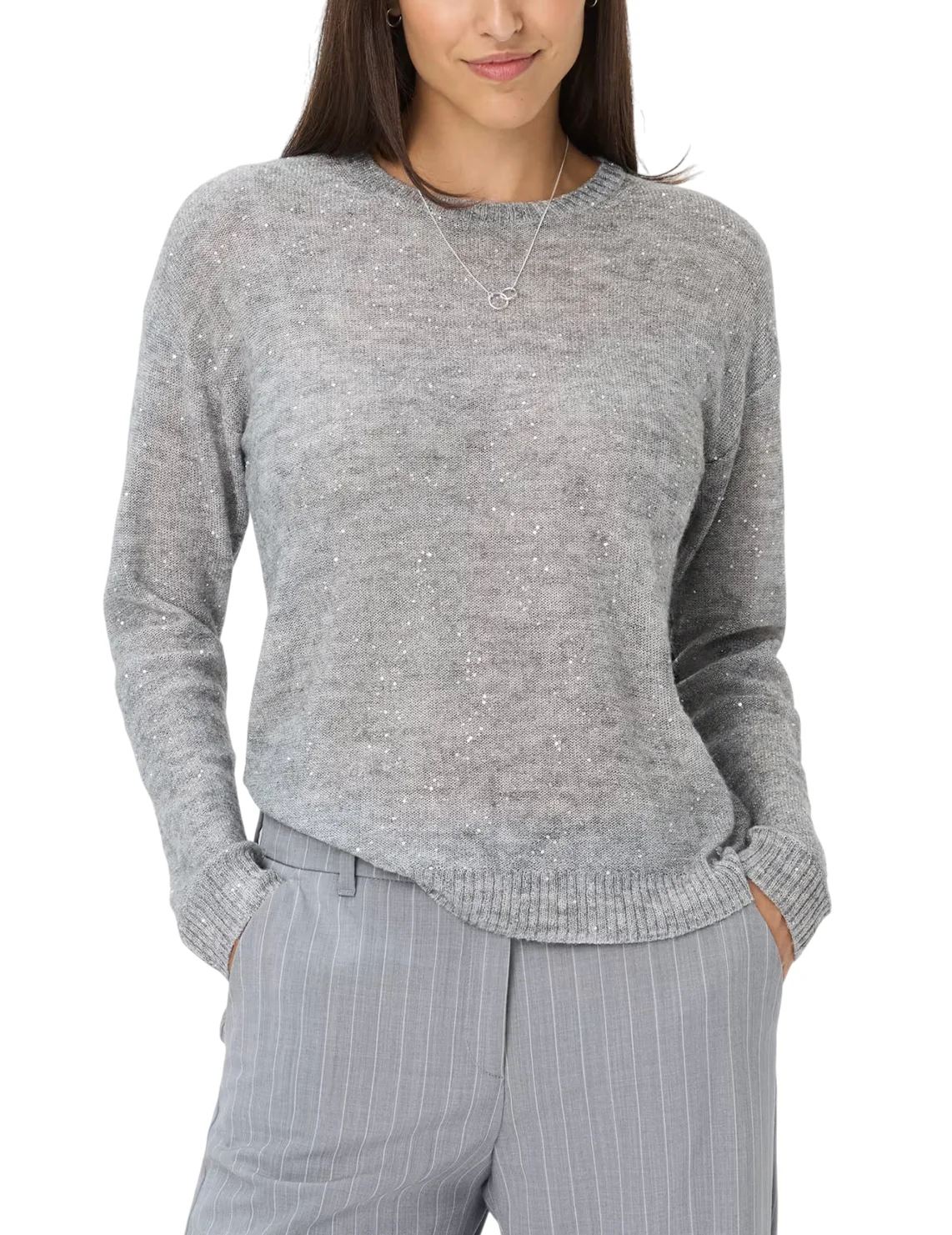 Джемпер изготовлен из шерсти, полиамида, полиэстера и альпаки. Модель выполнена в прямом крое. Имеет круглый вырез горловины, заниженную плечевую линию и длинные рукава с манжетами. Декорирован пайетками.