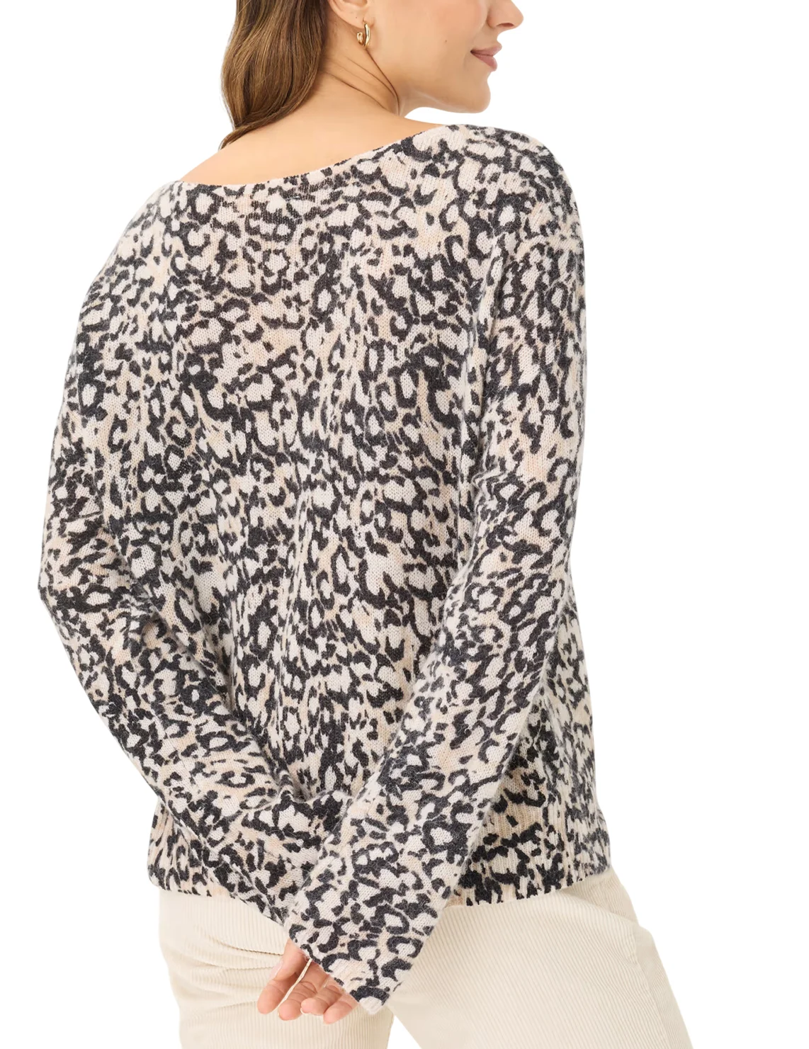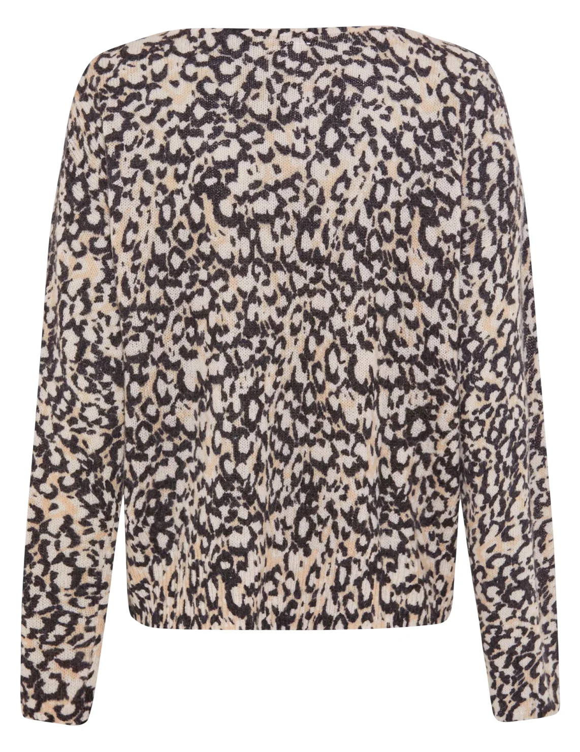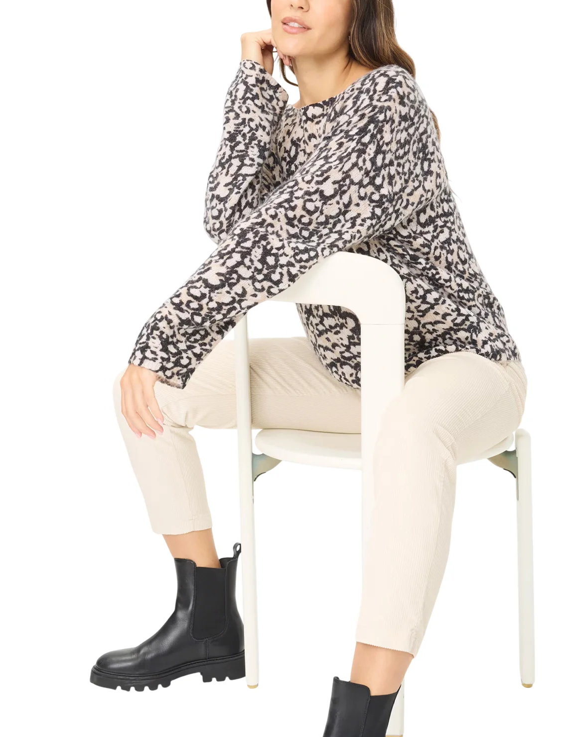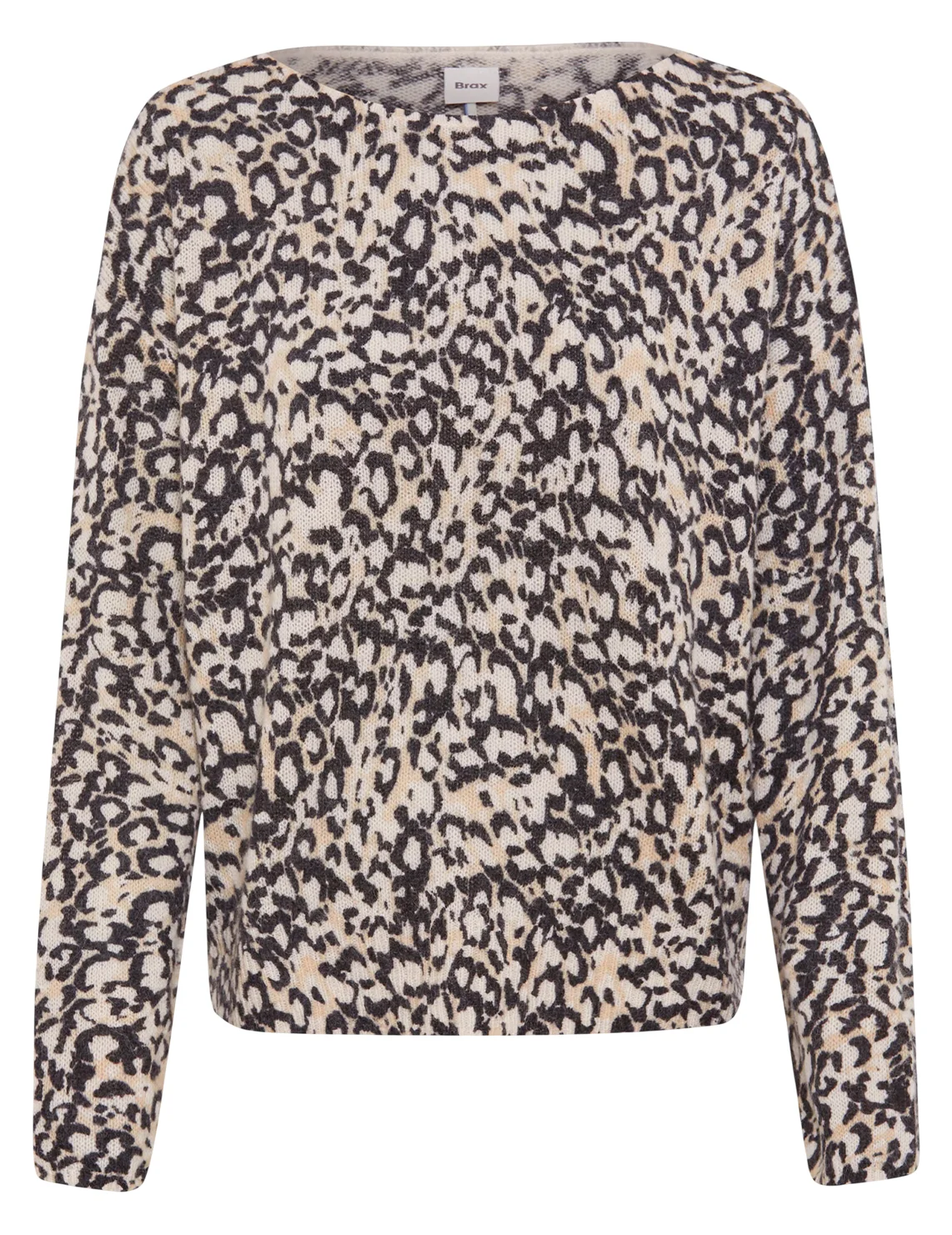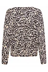 Джемпер изготовлен из полиамида, альпаки и шерсти. Модель выполнена в прямом крое. Имеет круглый вырез горловины, заниженную плечевую линию и длинные рукава с манжетами. Декорирован анималистичным принтом.