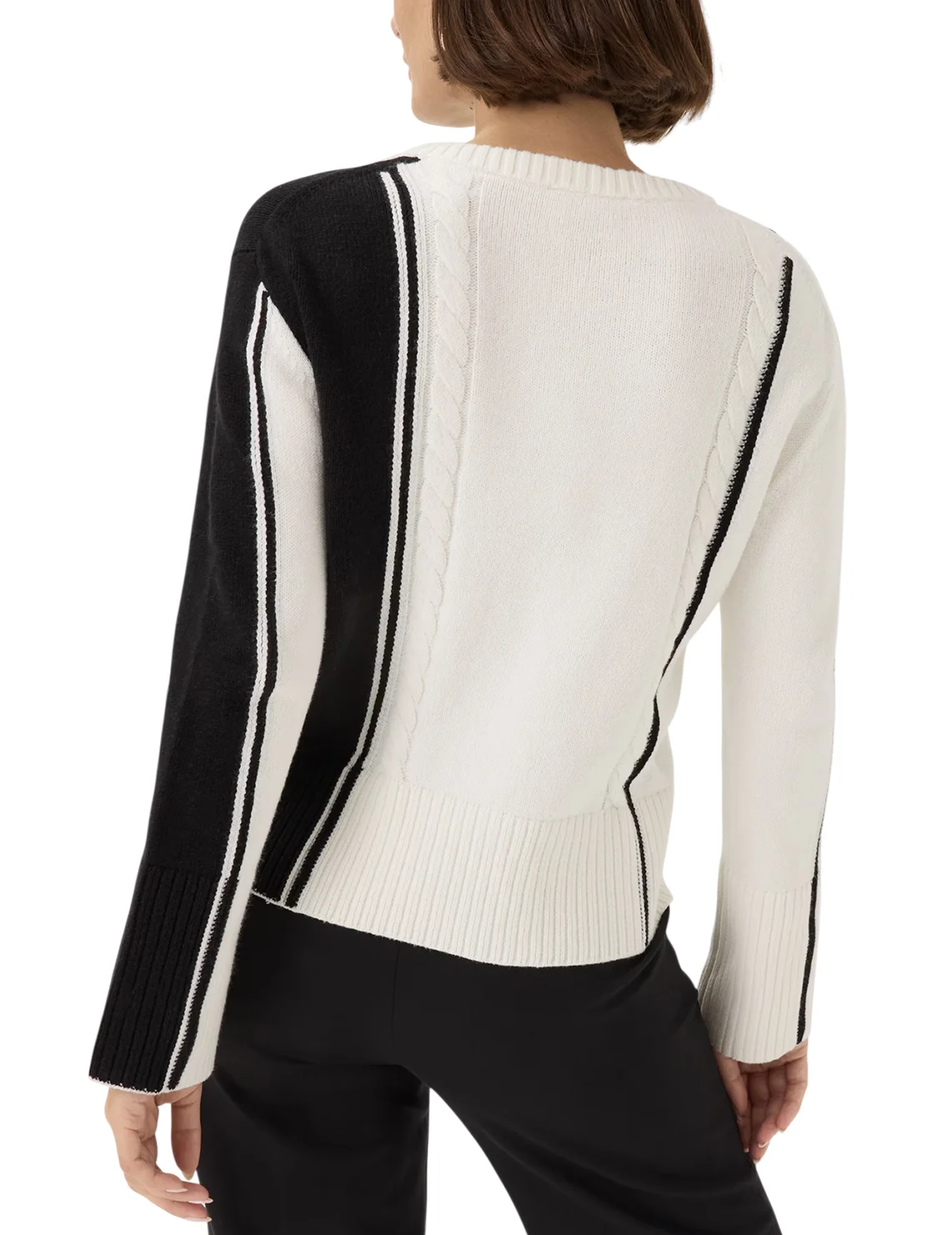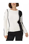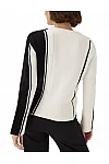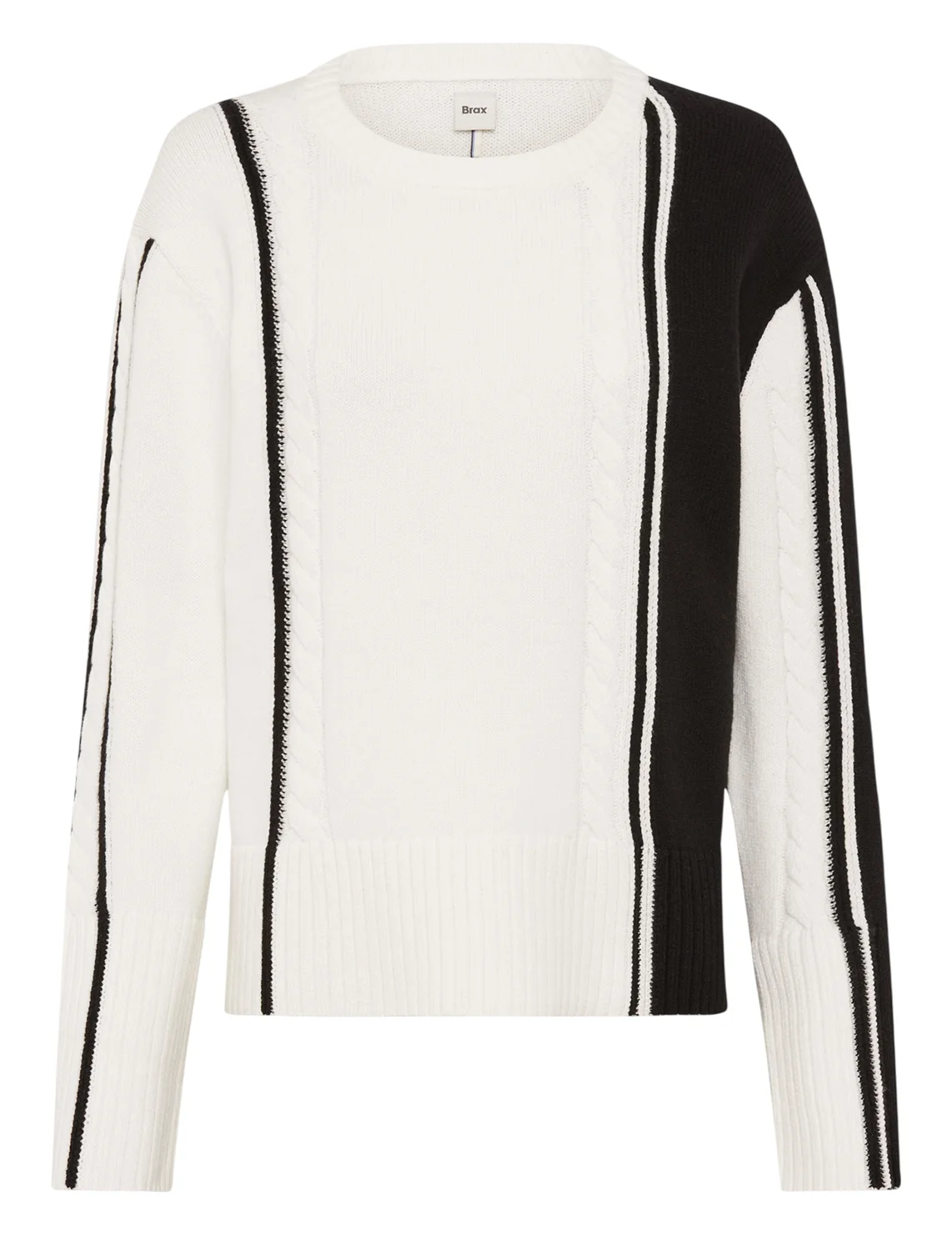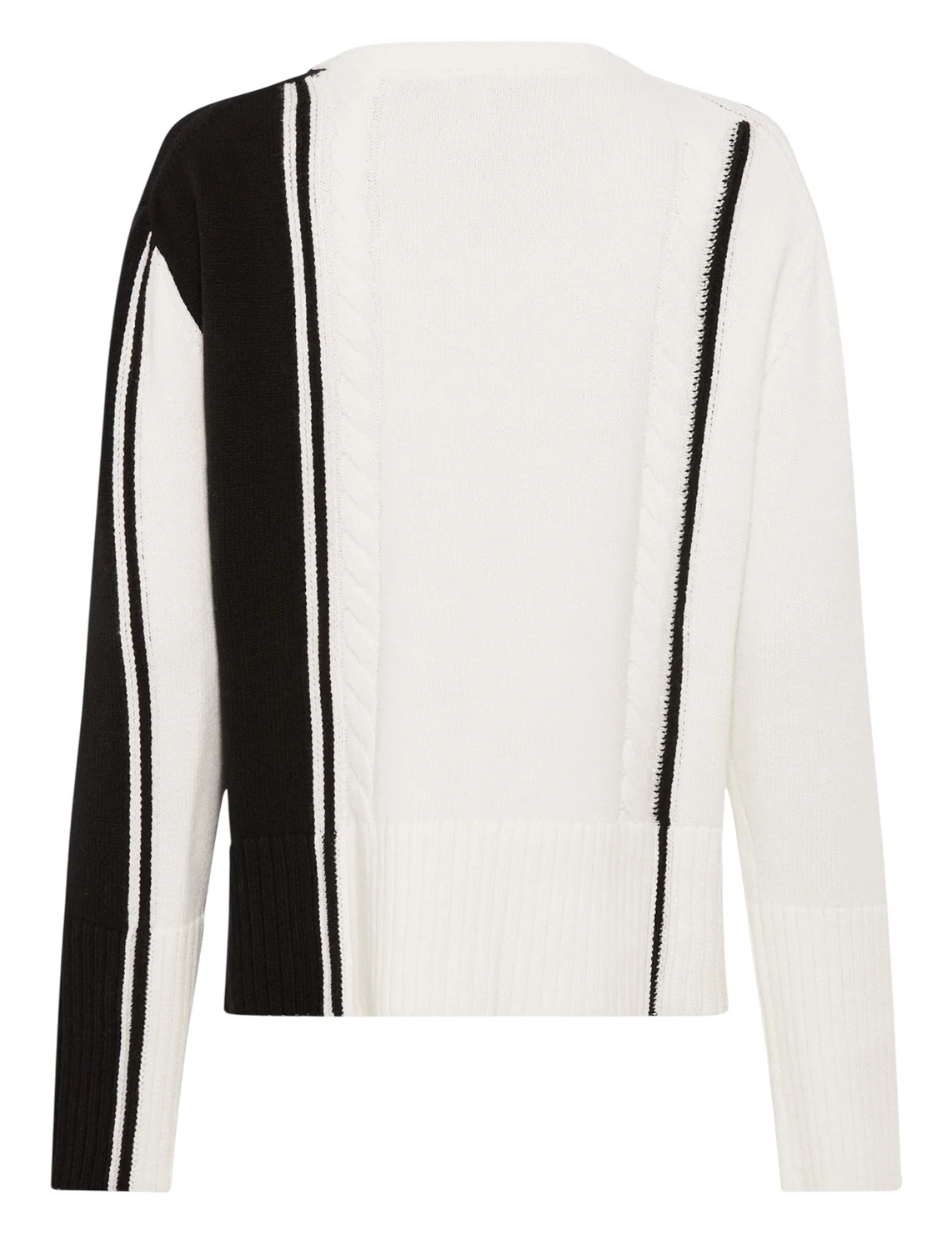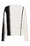Джемпер изготовлен из хлопка, акрила, полиэстера и шерсти. Модель выполнена в прямом крое. Имеет круглый вырез горловины, заниженную плечевую линию и длинные рукава с манжетами в рубчик. Декорирован принтом в полоску.