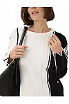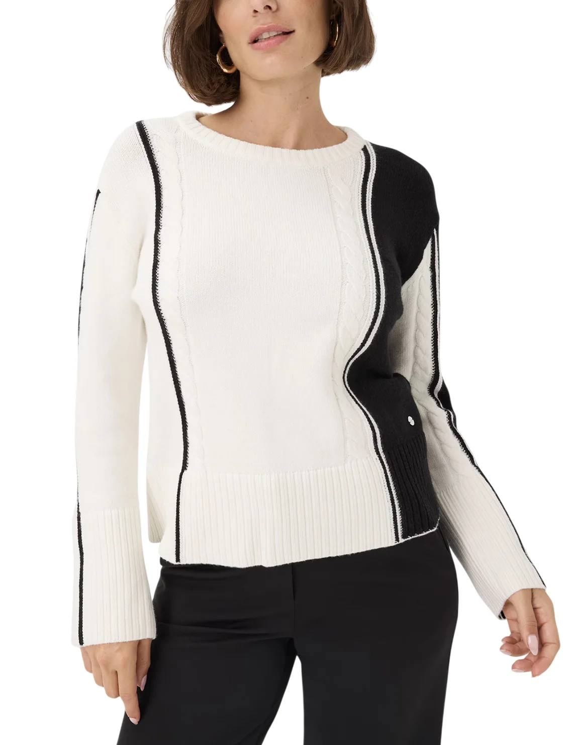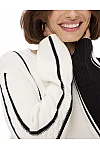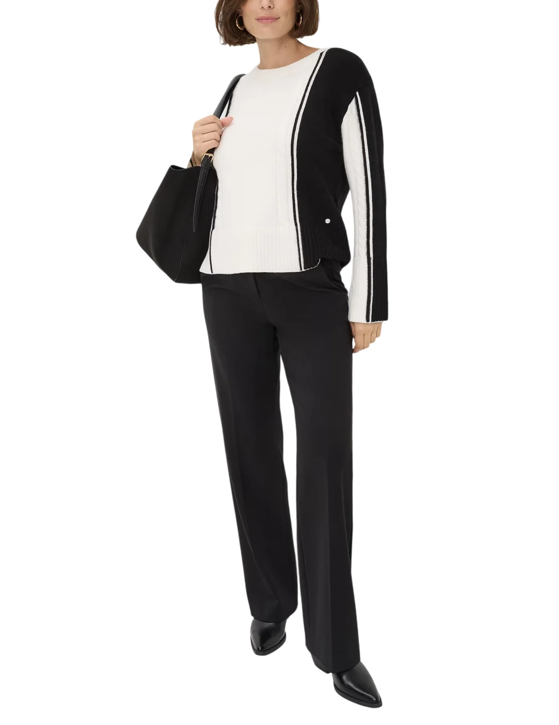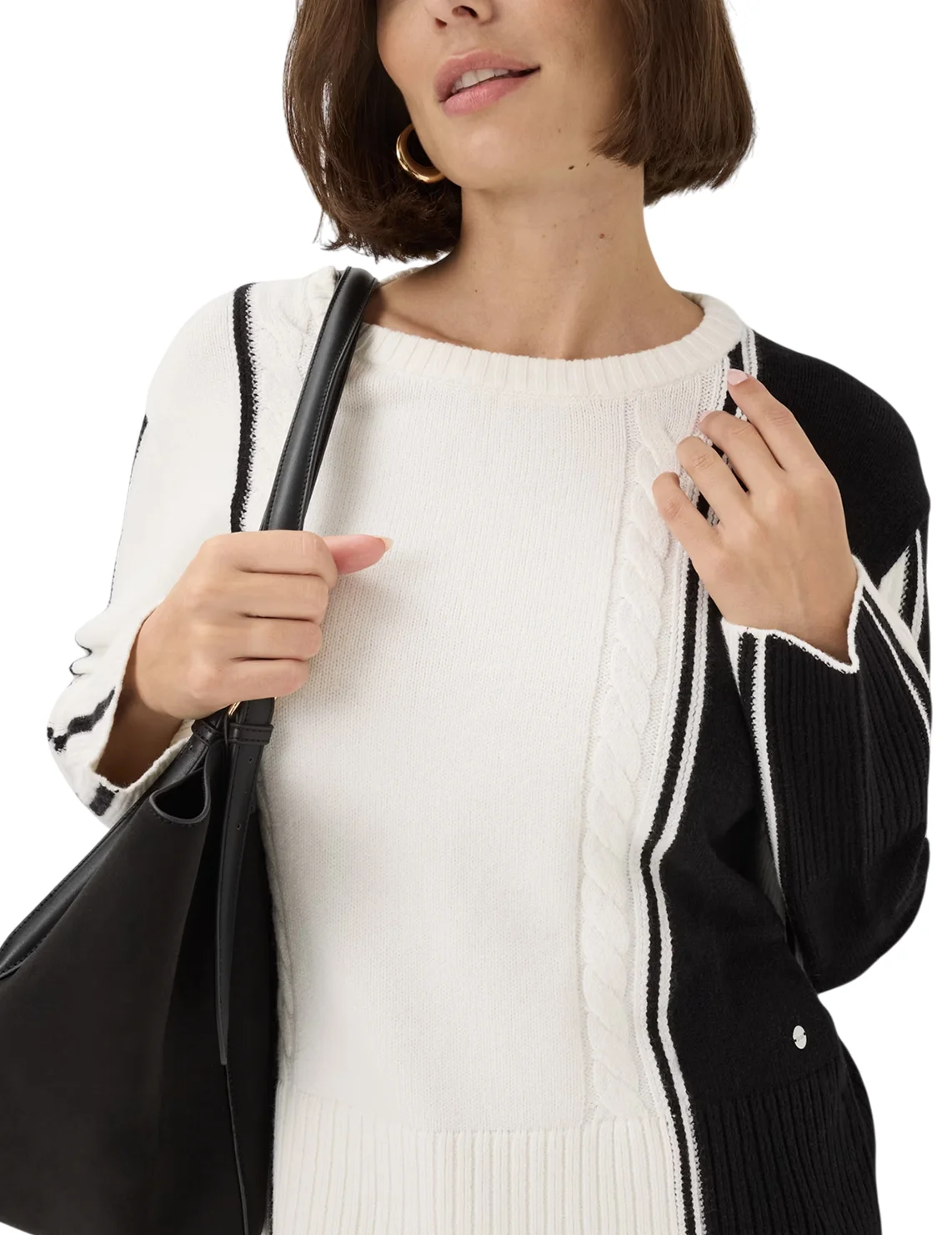 Джемпер изготовлен из хлопка, акрила, полиэстера и шерсти. Модель выполнена в прямом крое. Имеет круглый вырез горловины, заниженную плечевую линию и длинные рукава с манжетами в рубчик. Декорирован принтом в полоску.