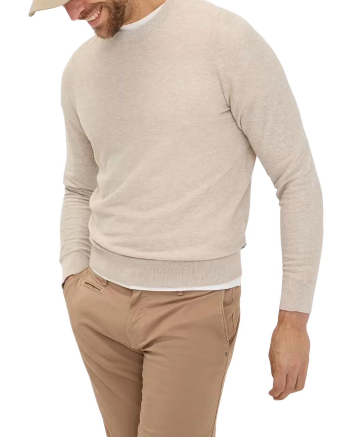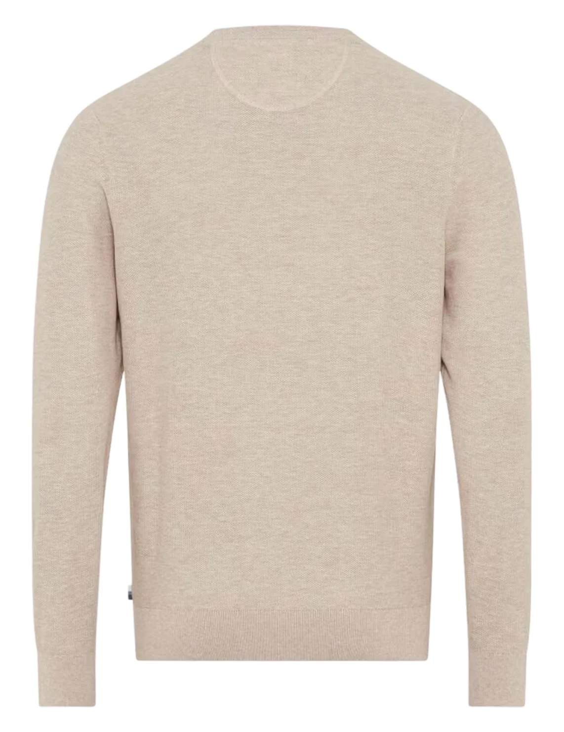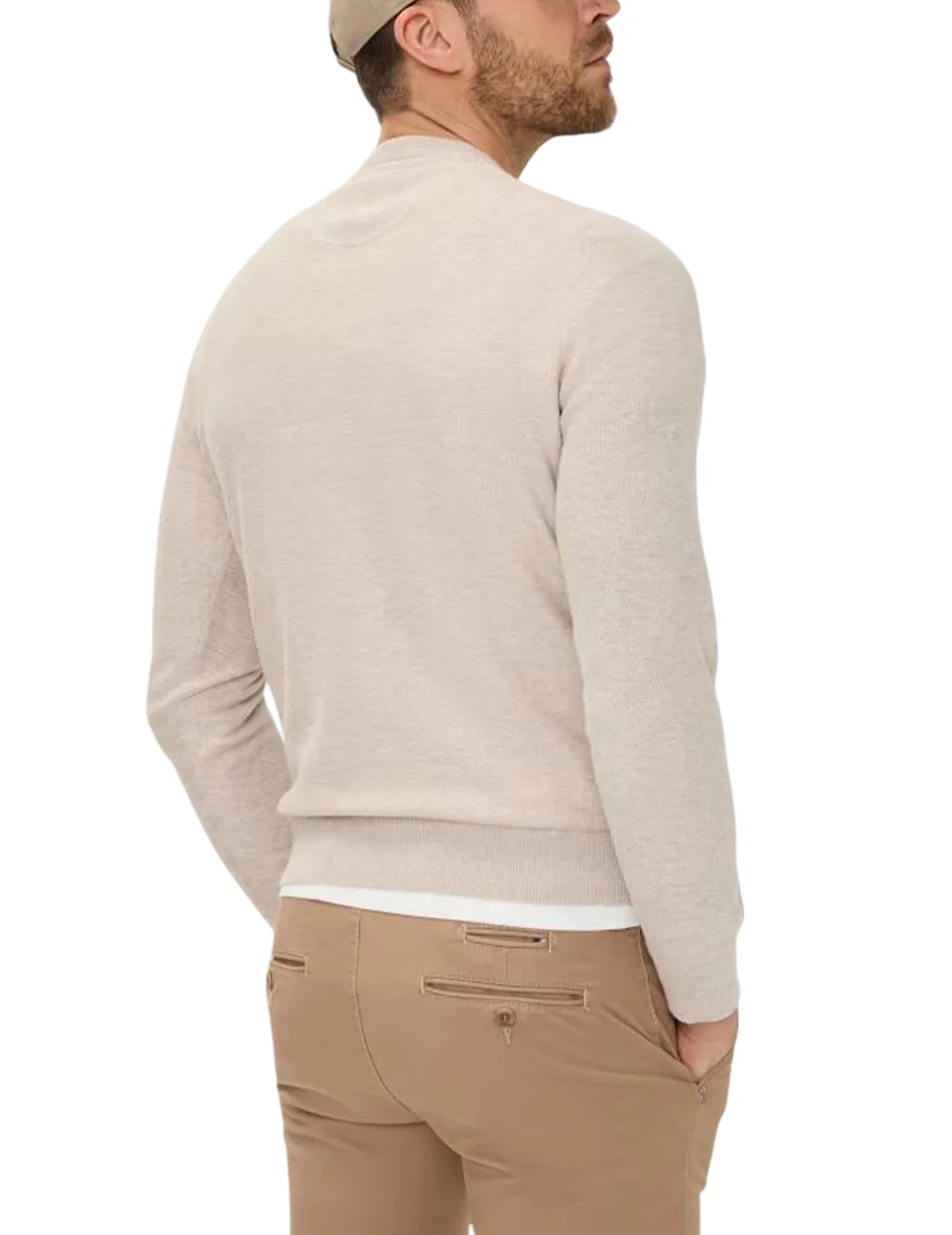 Джемпер изготовлен из хлопка, льна и полиэстера. Модель прямого кроя. Имеет круглый вырез горловины и длинные рукава с манжетами.
