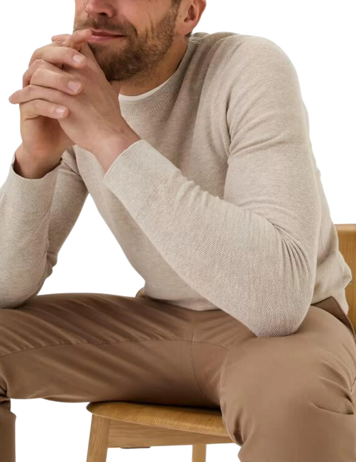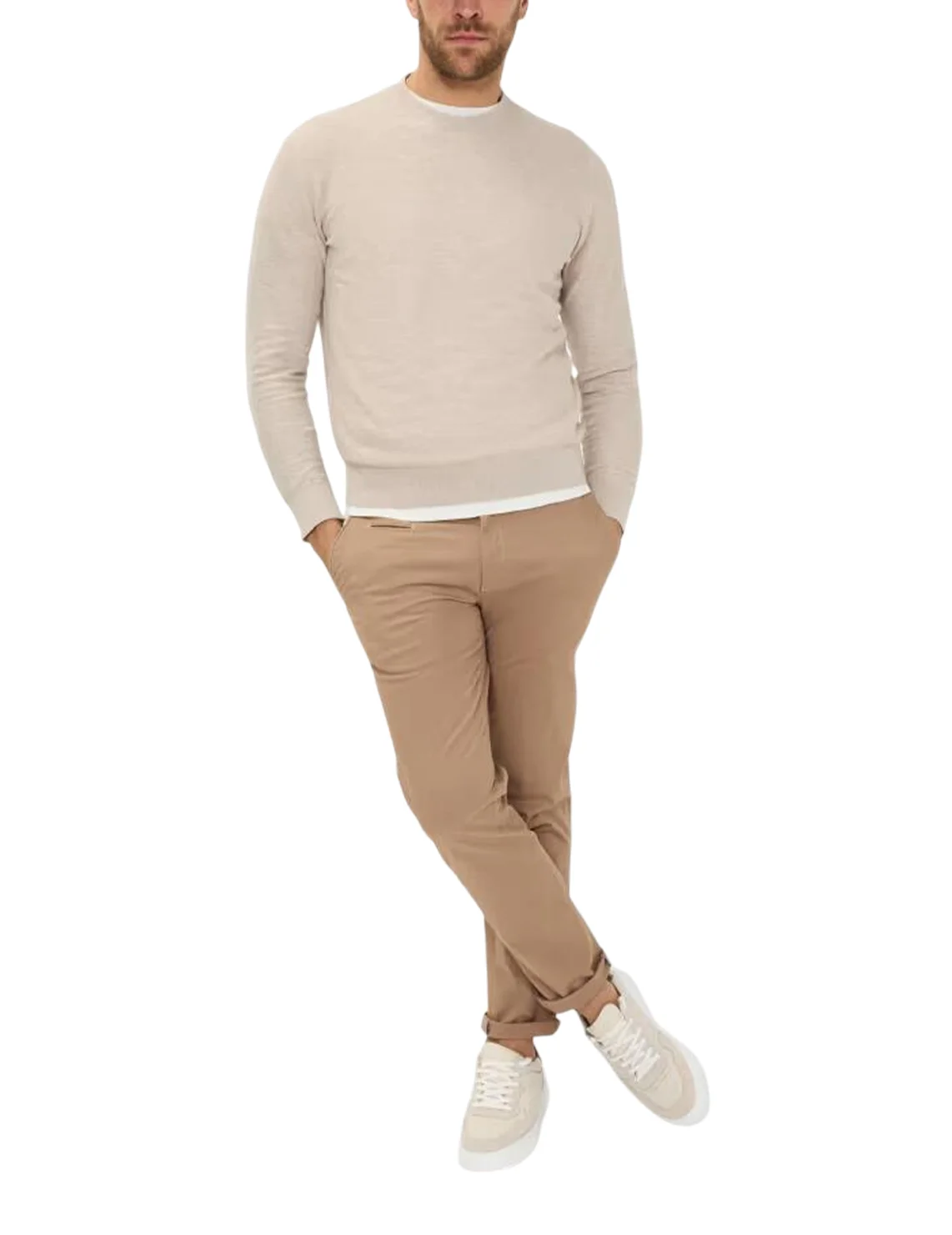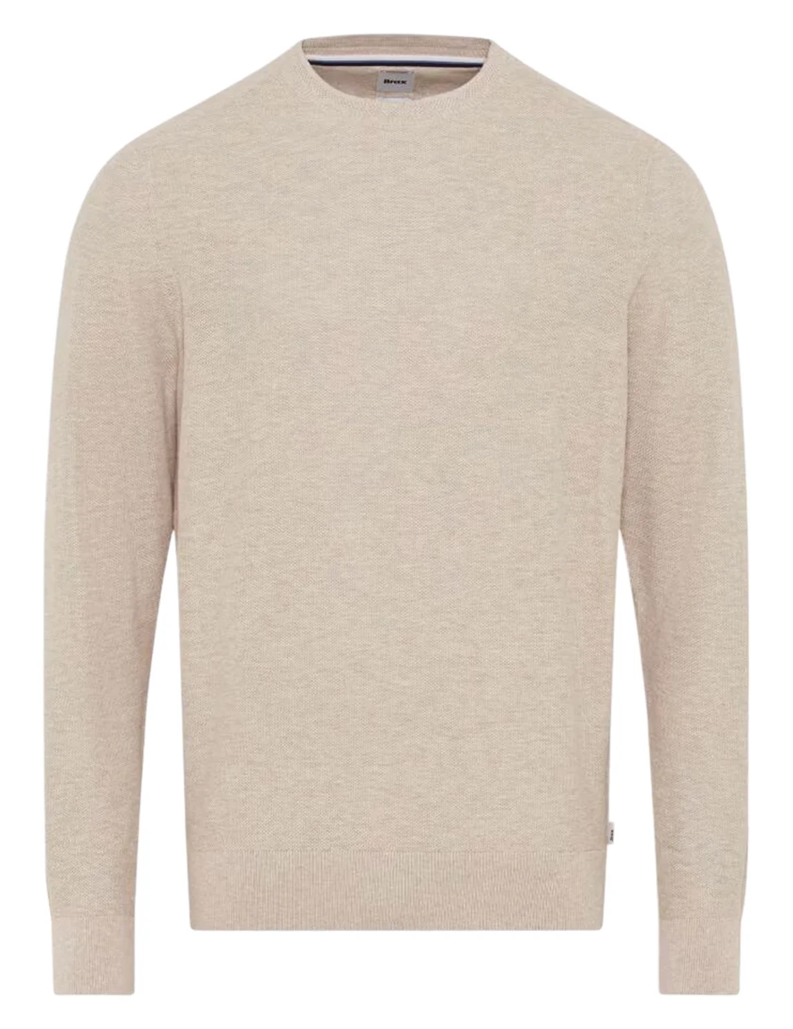 Джемпер изготовлен из хлопка, льна и полиэстера. Модель прямого кроя. Имеет круглый вырез горловины и длинные рукава с манжетами.