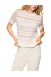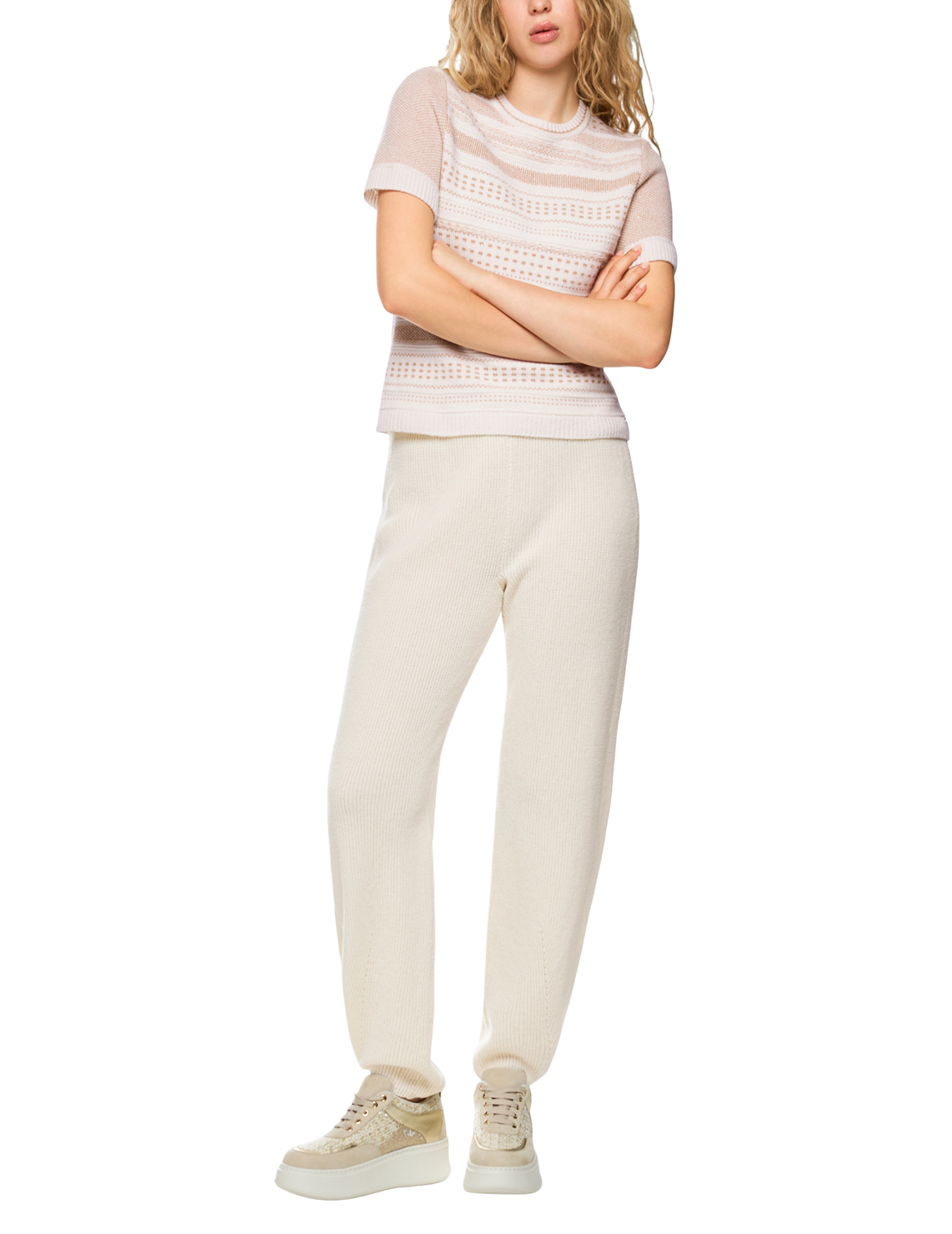 Джемпер изготовлен из шерсти, кашемира, полиамида и шелка. Модель выполнена в прямом крое. Имеет круглый вырез горловины и короткие рукава с манжетами. Декорирован принтом в полоску.
