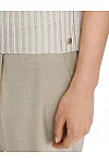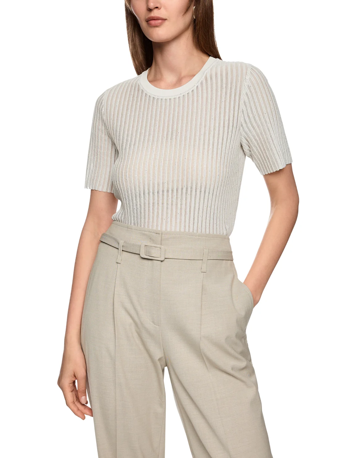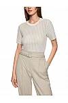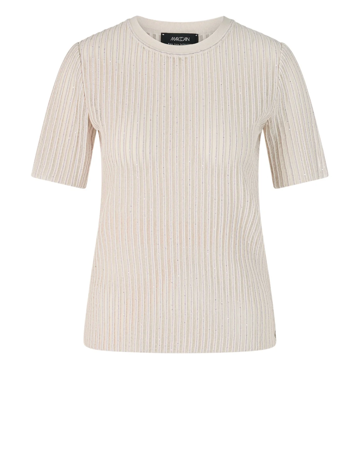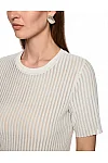 Джемпер изготовлен из вискозы, полиамида, хлопка и полиэстера. Модель выполнена в прямом крое. Имеет круглый вырез горловины и короткие рукава. Декорирован пайетками.