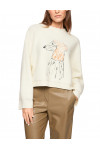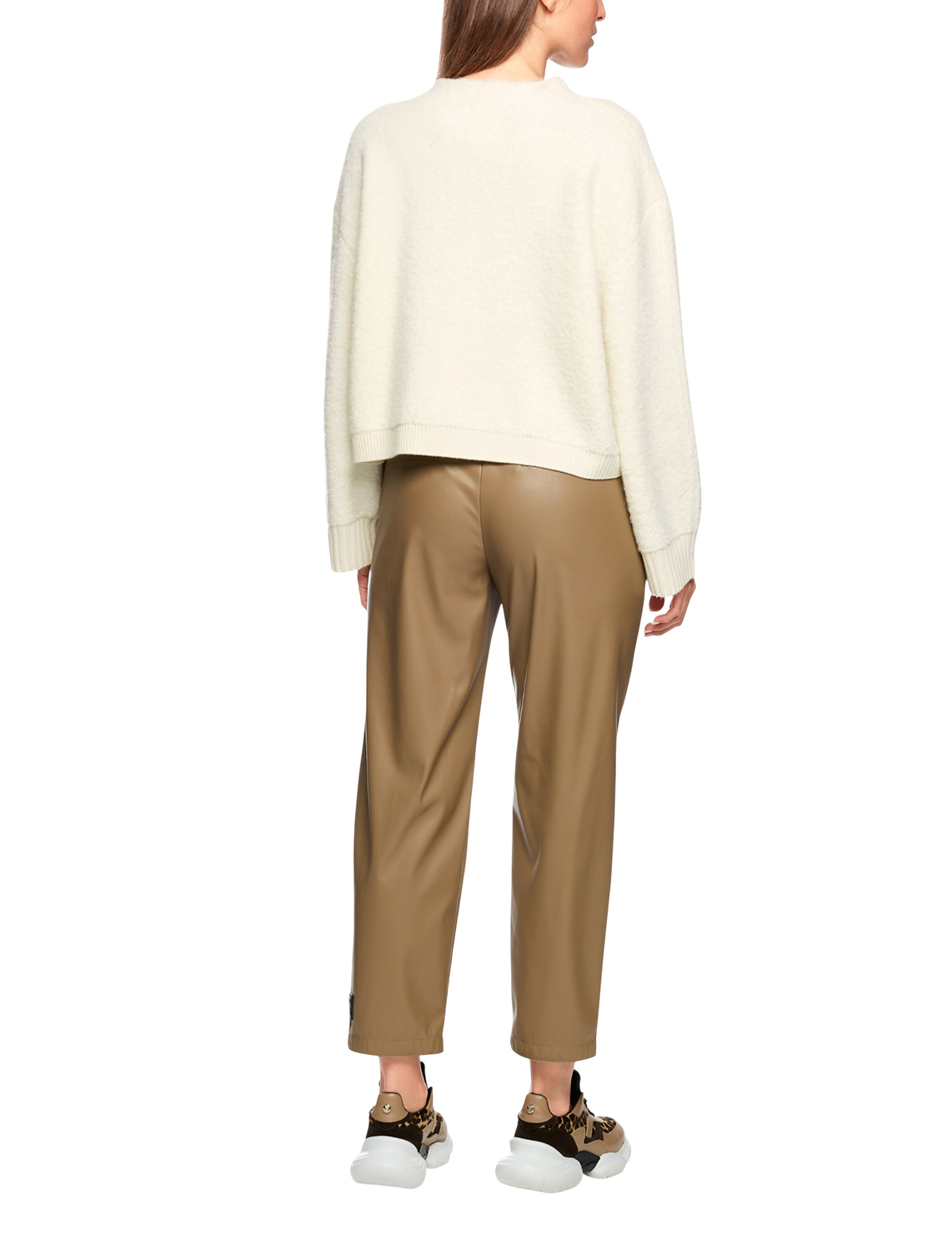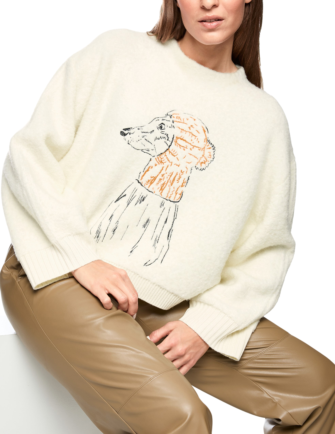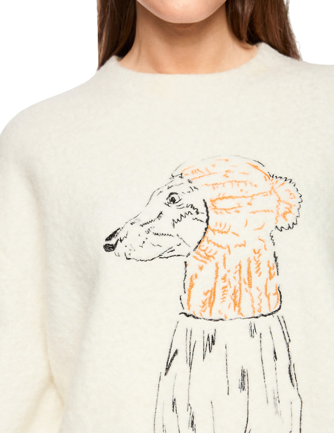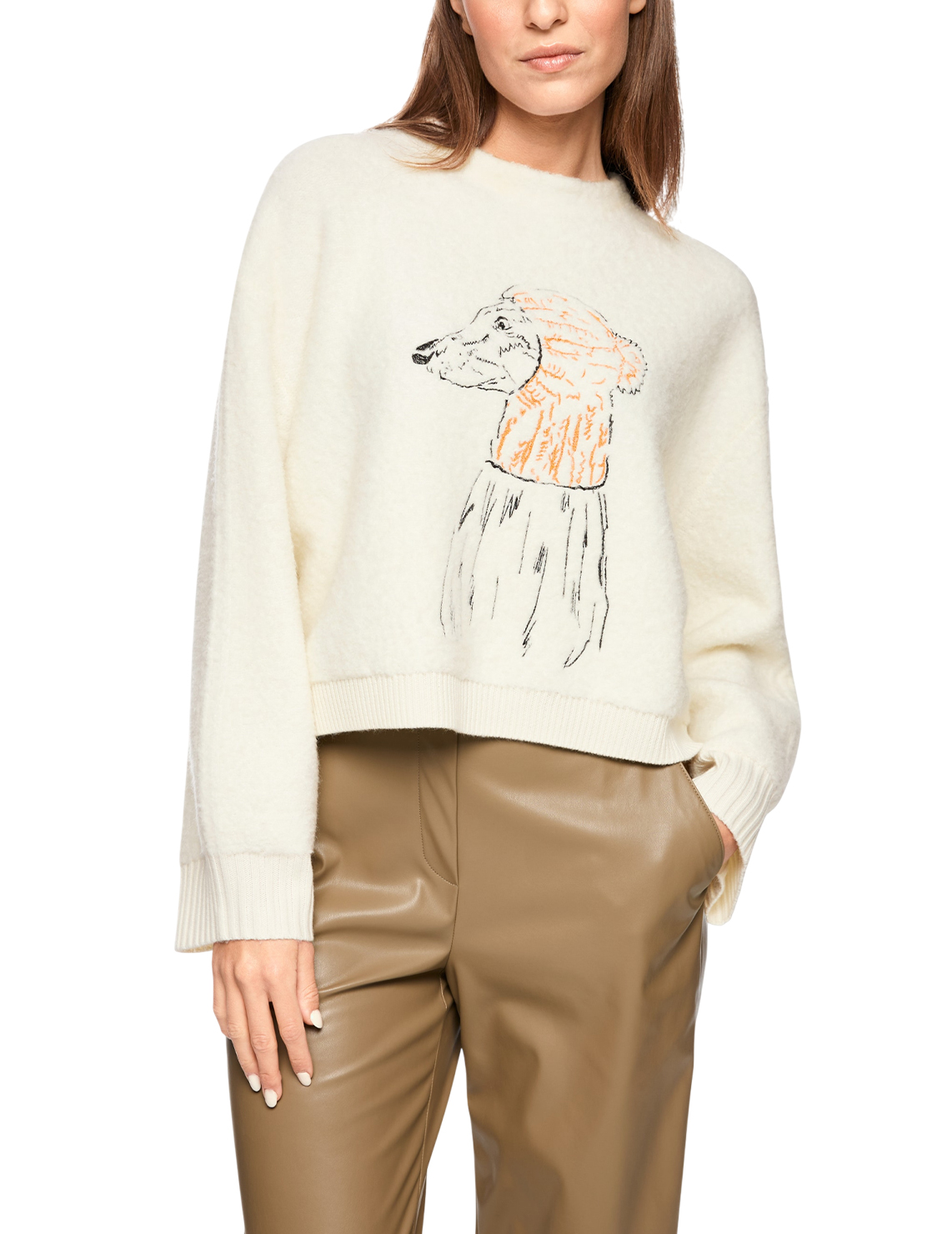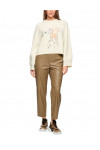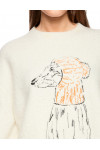 Джемпер изготовлен из полиакрила, шерсти, полиамида, полиэстера, эластана и альпаки. Модель выполнена в свободном крое. Имеет круглый вырез горловины, заниженную плечевую линию и длинные рукава с манжетами. Декорирован вышивкой.