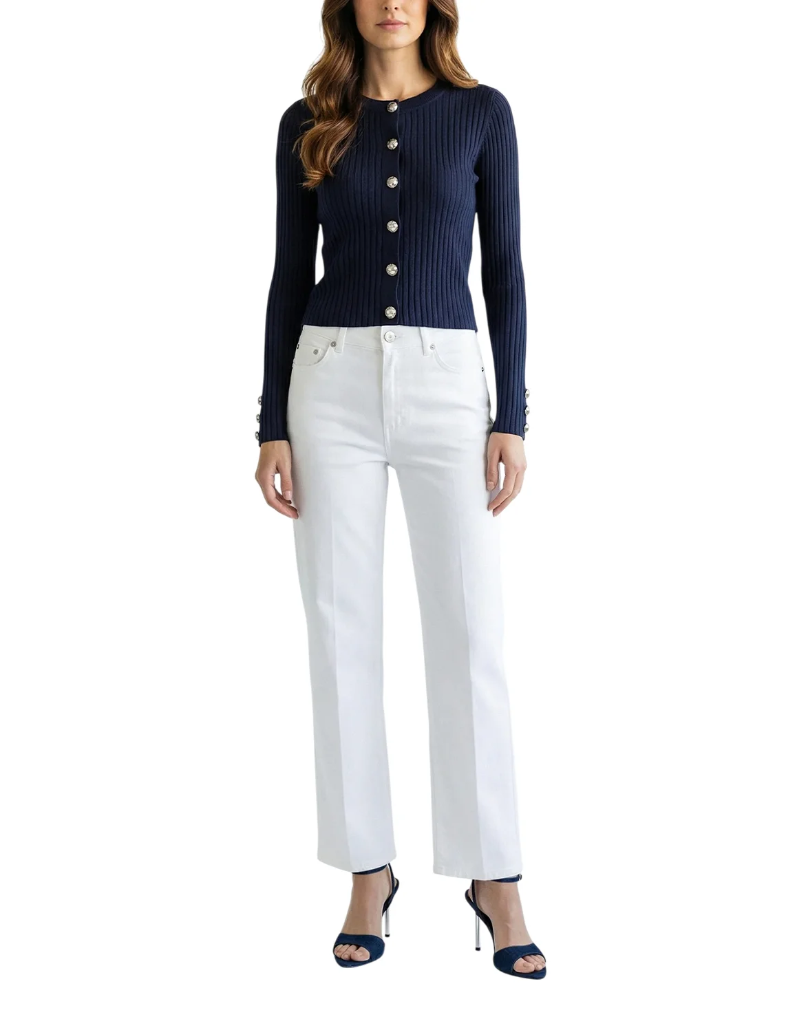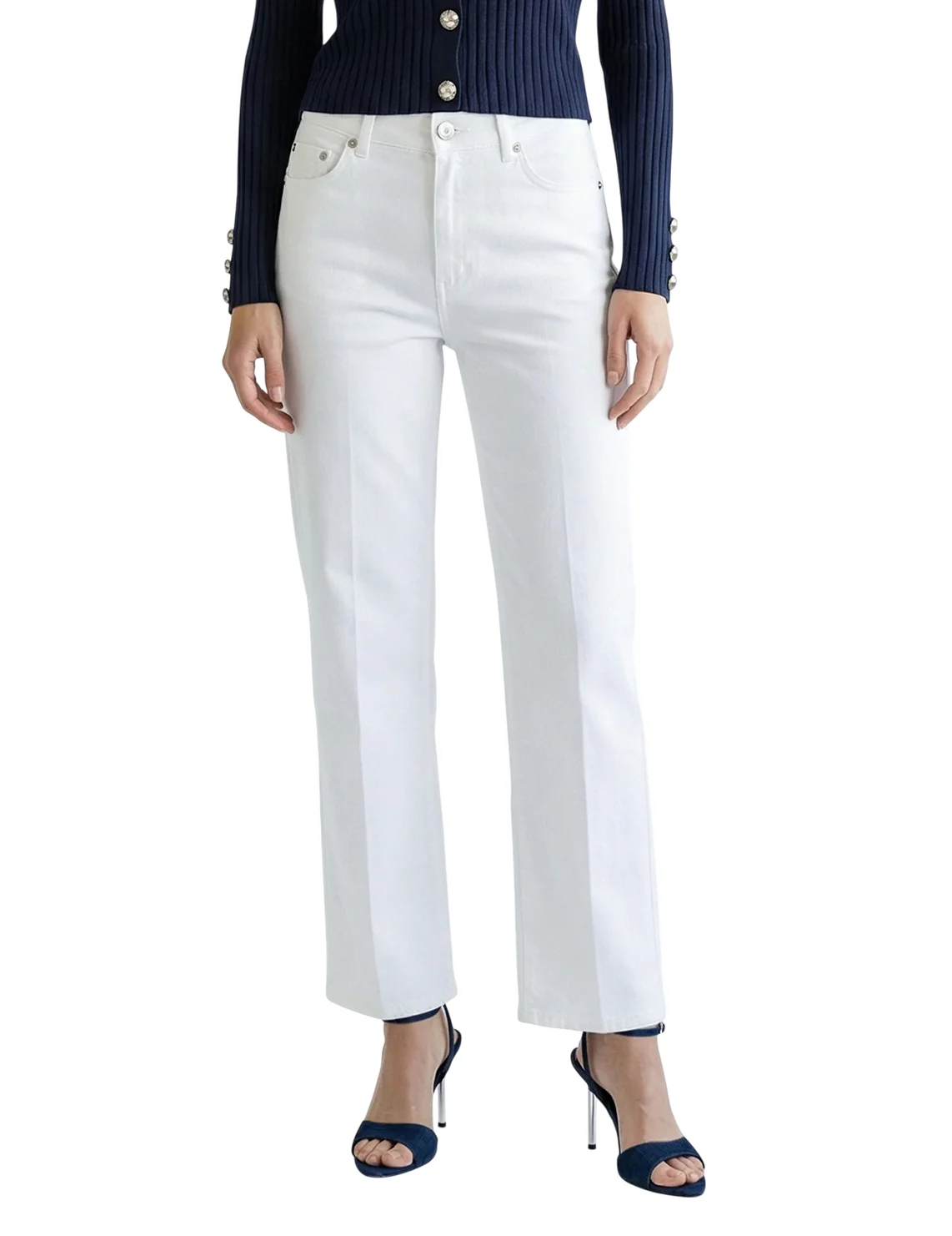 Джинсы изготовлены из хлопка и эластана. Модель выполнена в прямом крое. Имеет шлёвки для ремня, скрытую застежку-молнию с пуговицей, прессованные стрелки, а также пару передних прорезных и пару задних накладных карманов.