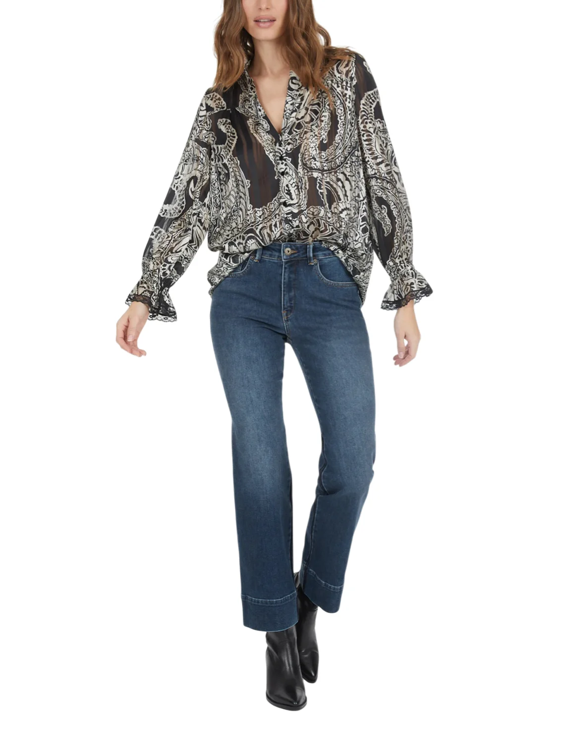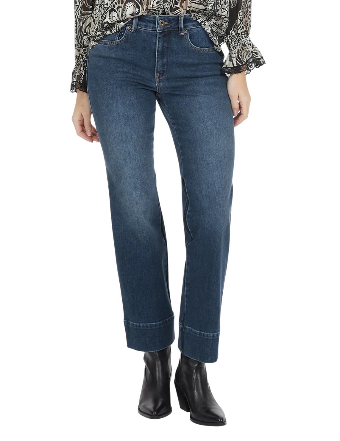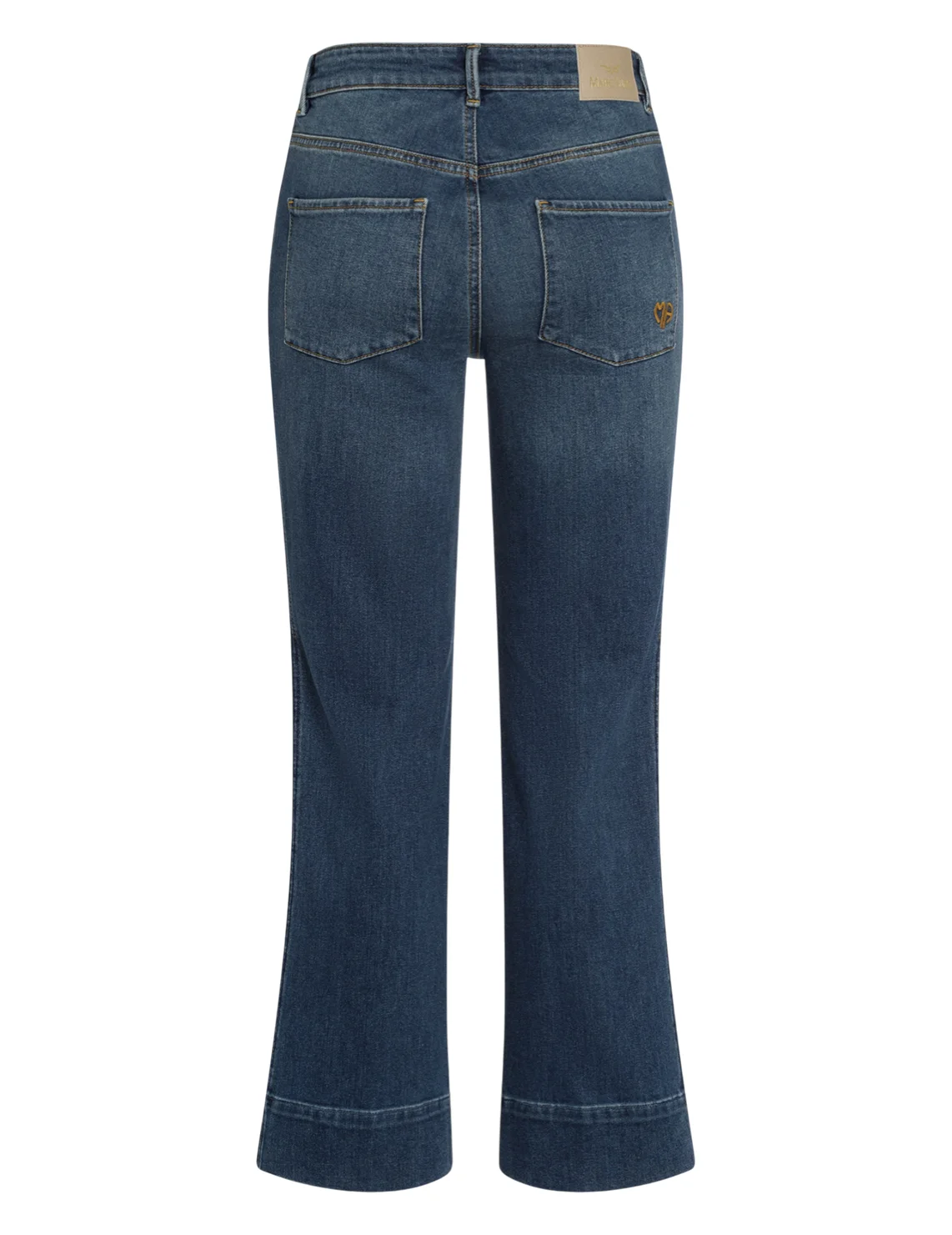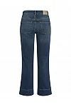 Джинсы изготовлены из хлопка, эластомультиэстера и эластана. Модель выполнена в прямом крое. Имеет шлёвки для ремня, потайную застежку-молнию с пуговицей, а также пару передних прорезных и пару задних накладных карманов.