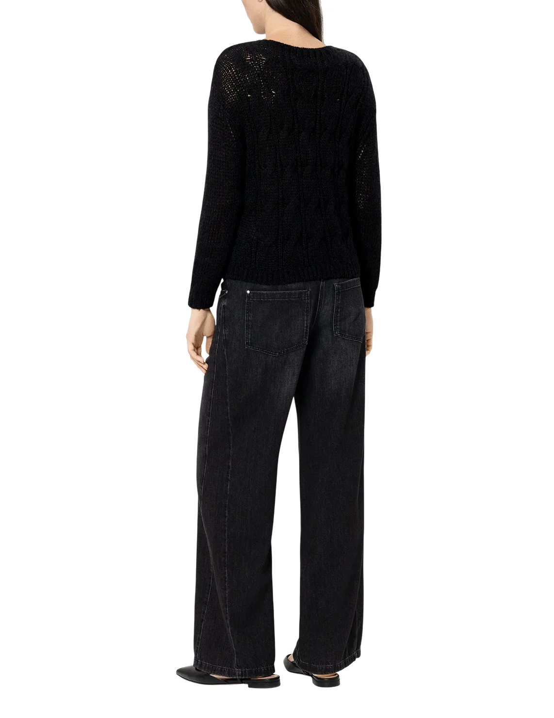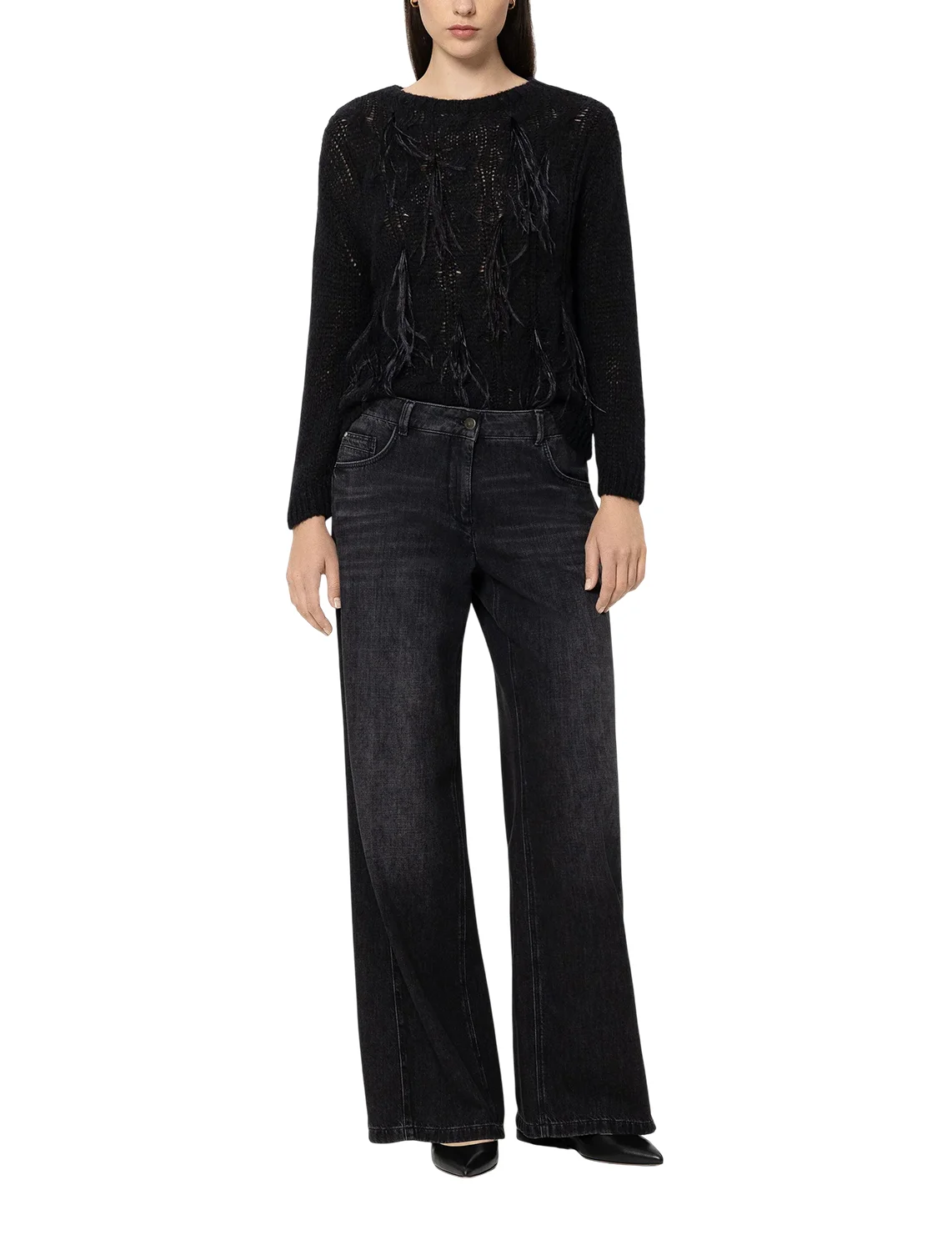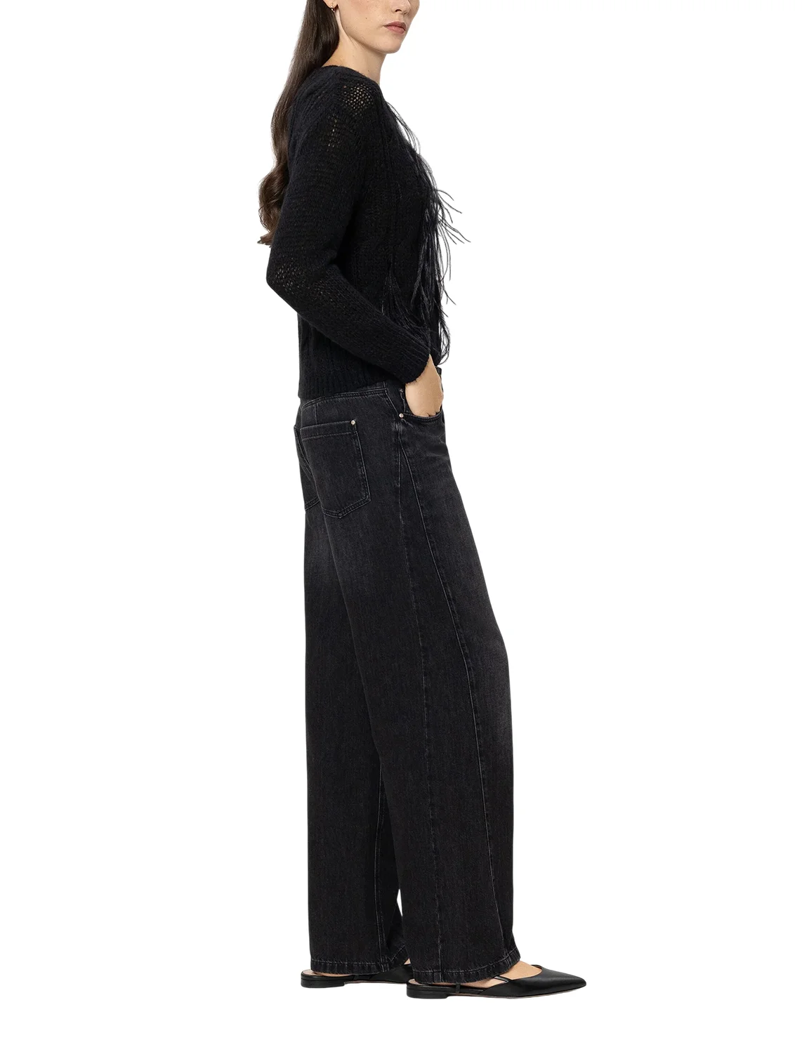 Джинсы изготовлены из натурального хлопка и лиоцелла. Модель выполнена в свободном крое. Имеет петли для ремня, скрытую застежку-молнию с пуговицей, а также пару передних прорезных и пару задних накладных карманов.