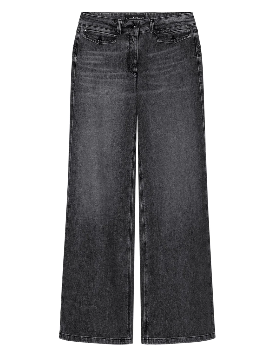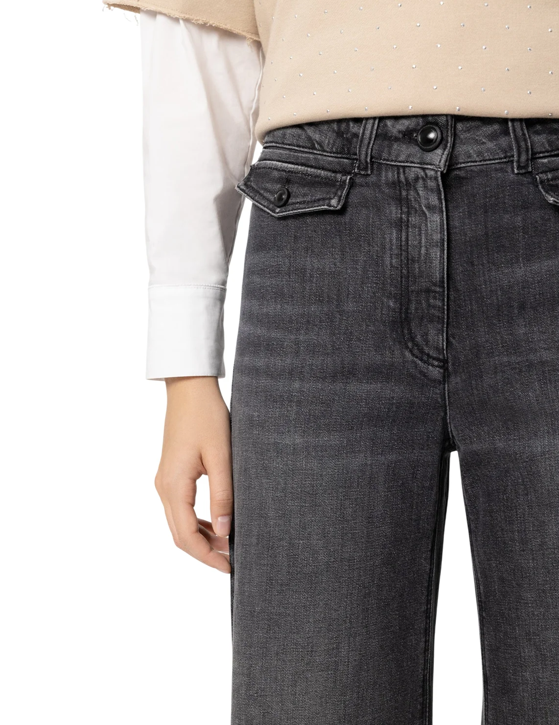 Джинсы изготовлены из хлопка и эластана. Модель выполнена в свободном крое. Имеет шлёвки для ремня, скрытую застежку-молнию с пуговицей, декоративные карманы с клапанами спереди и накладные карманы сзади.