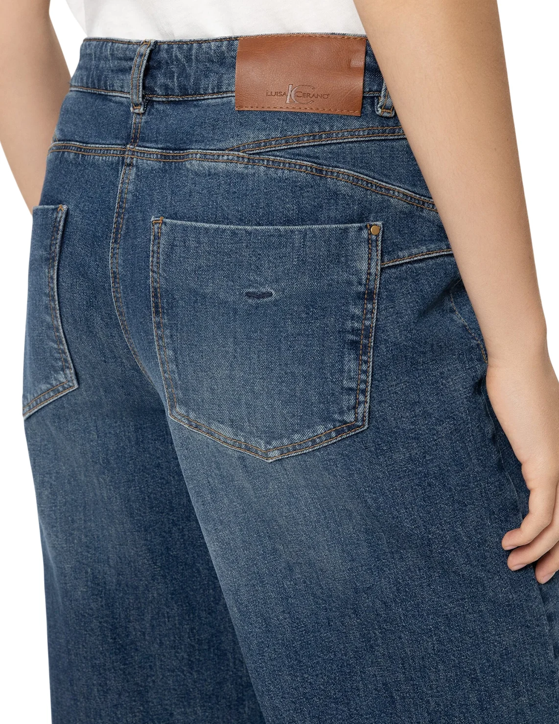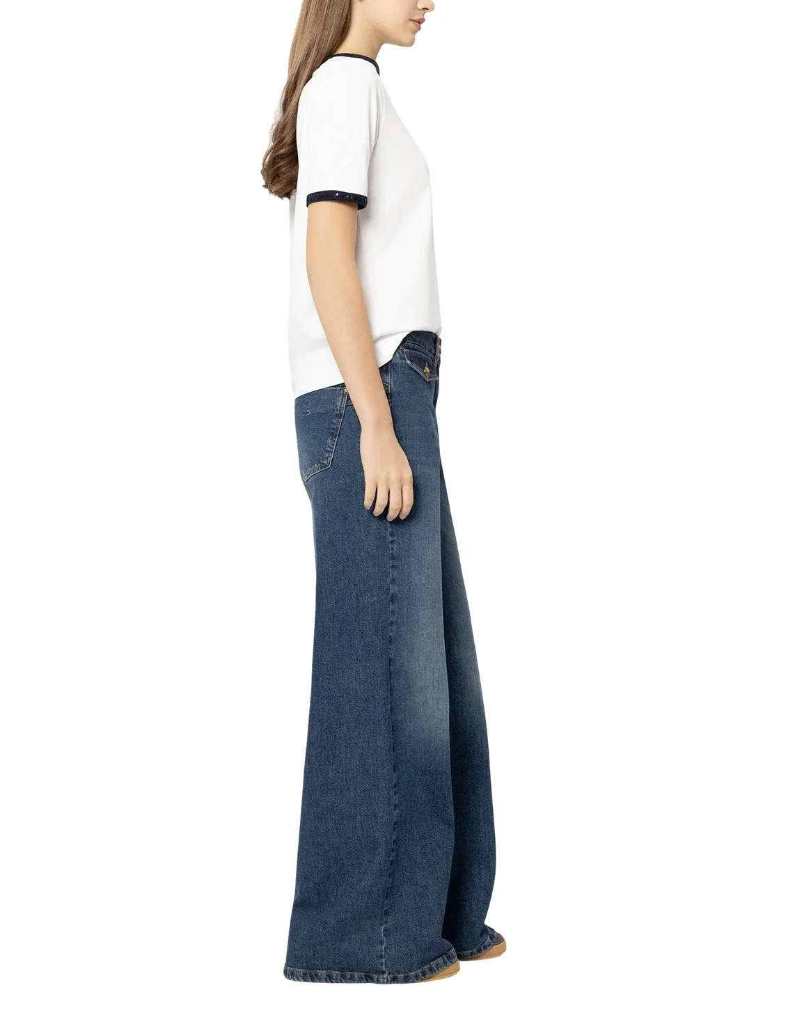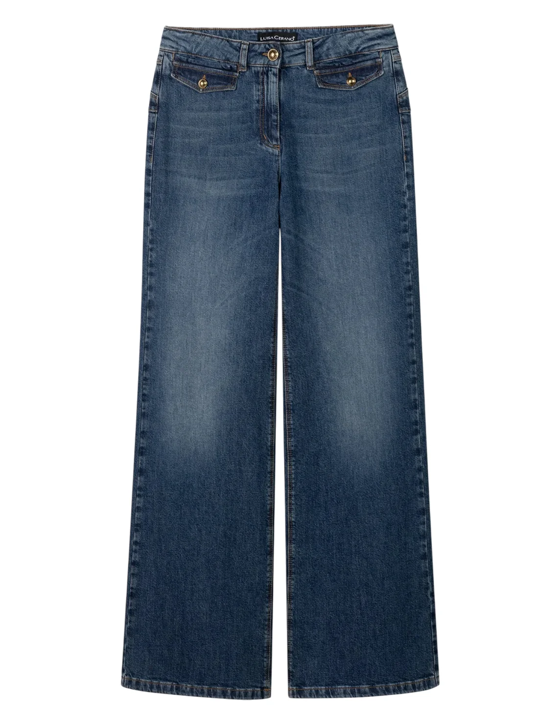 Джинсы изготовлены из хлопка и эластана. Модель выполнена в свободном крое. Имеет шлёвки для ремня, скрытую застежку-молнию с пуговицей, декоративные карманы с клапанами спереди и накладные карманы сзади.