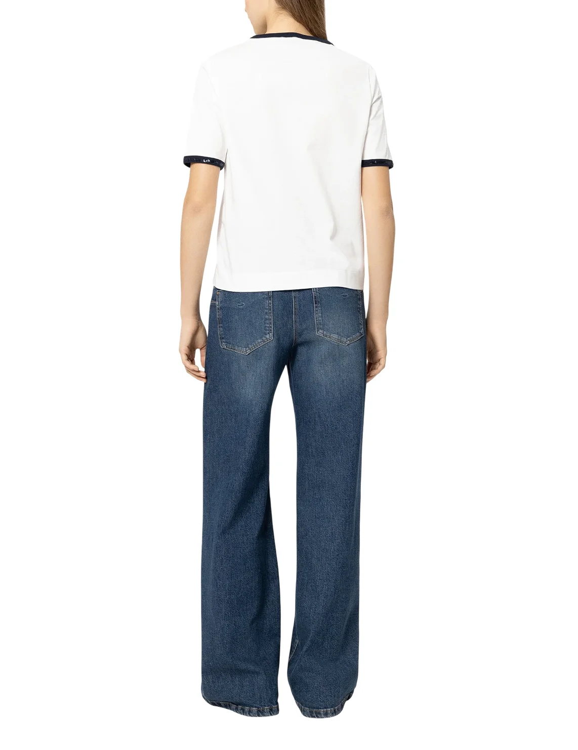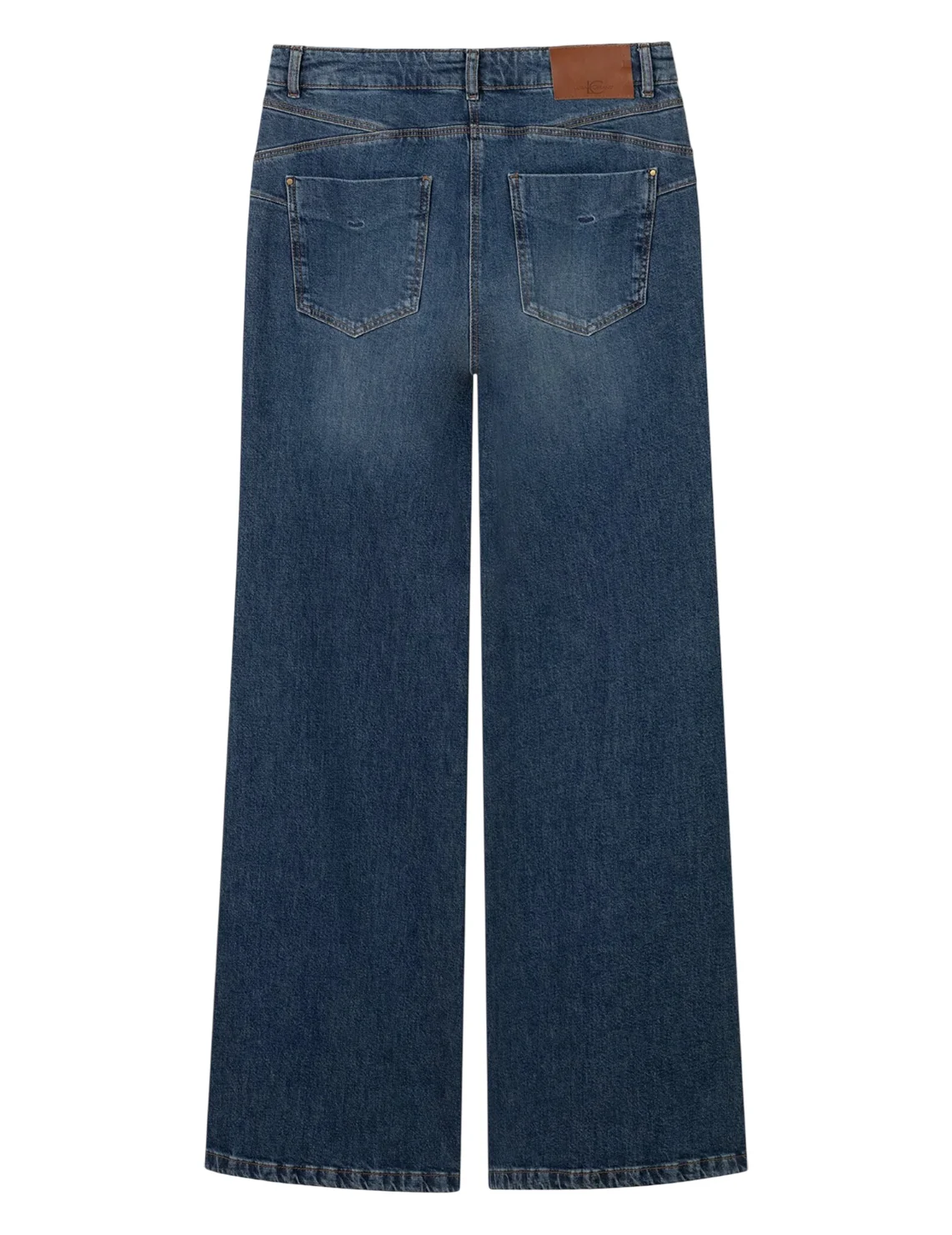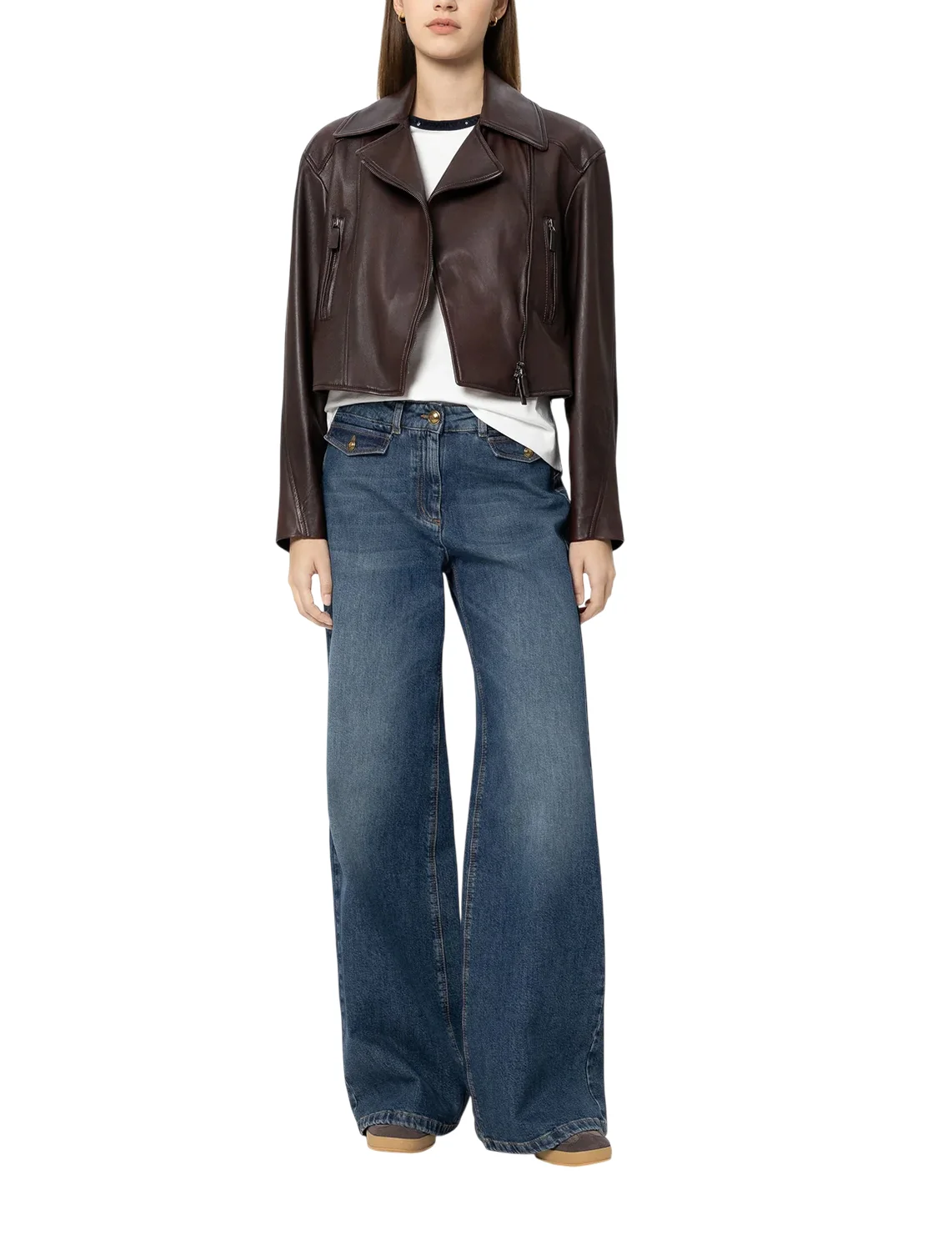 Джинсы изготовлены из хлопка и эластана. Модель выполнена в свободном крое. Имеет шлёвки для ремня, скрытую застежку-молнию с пуговицей, декоративные карманы с клапанами спереди и накладные карманы сзади.